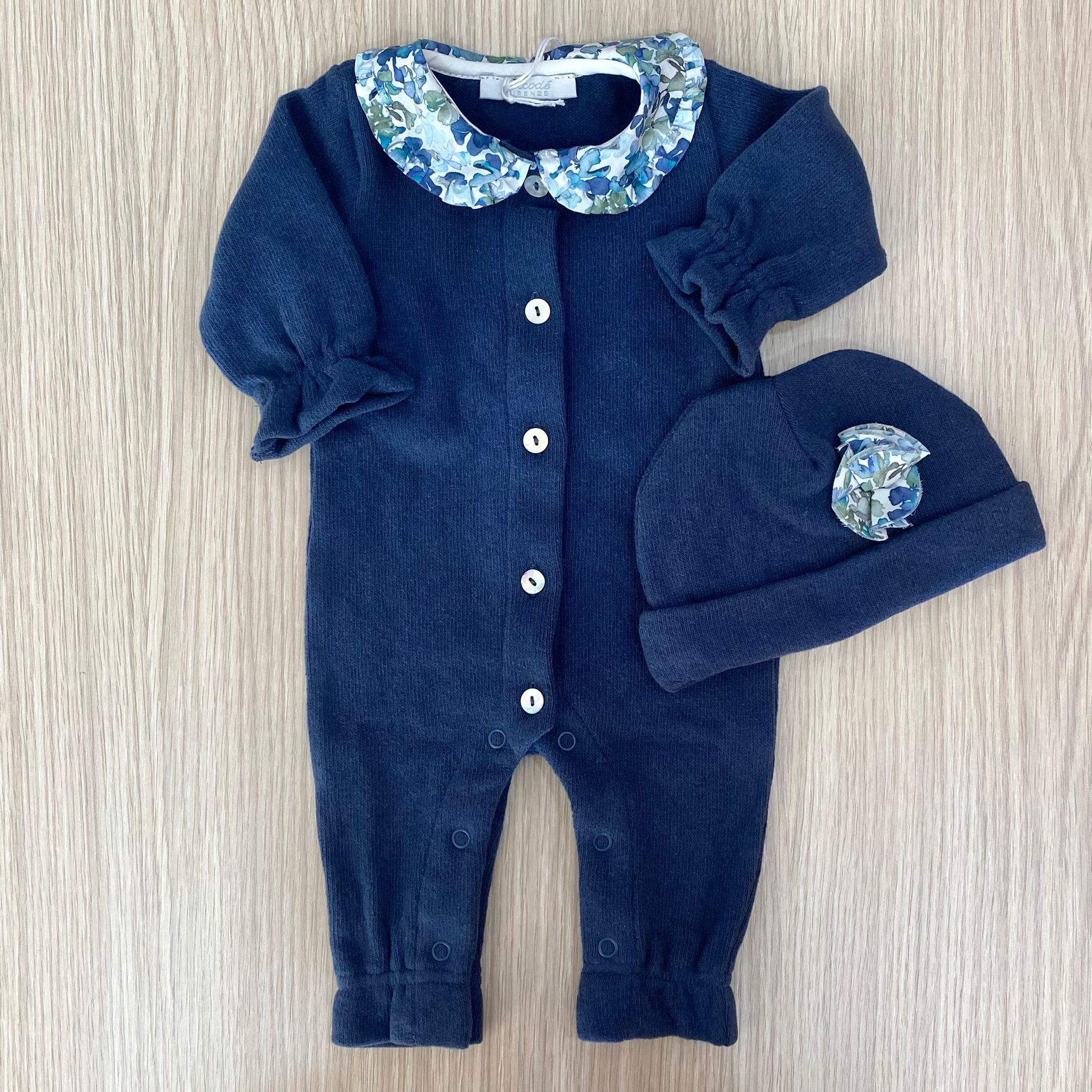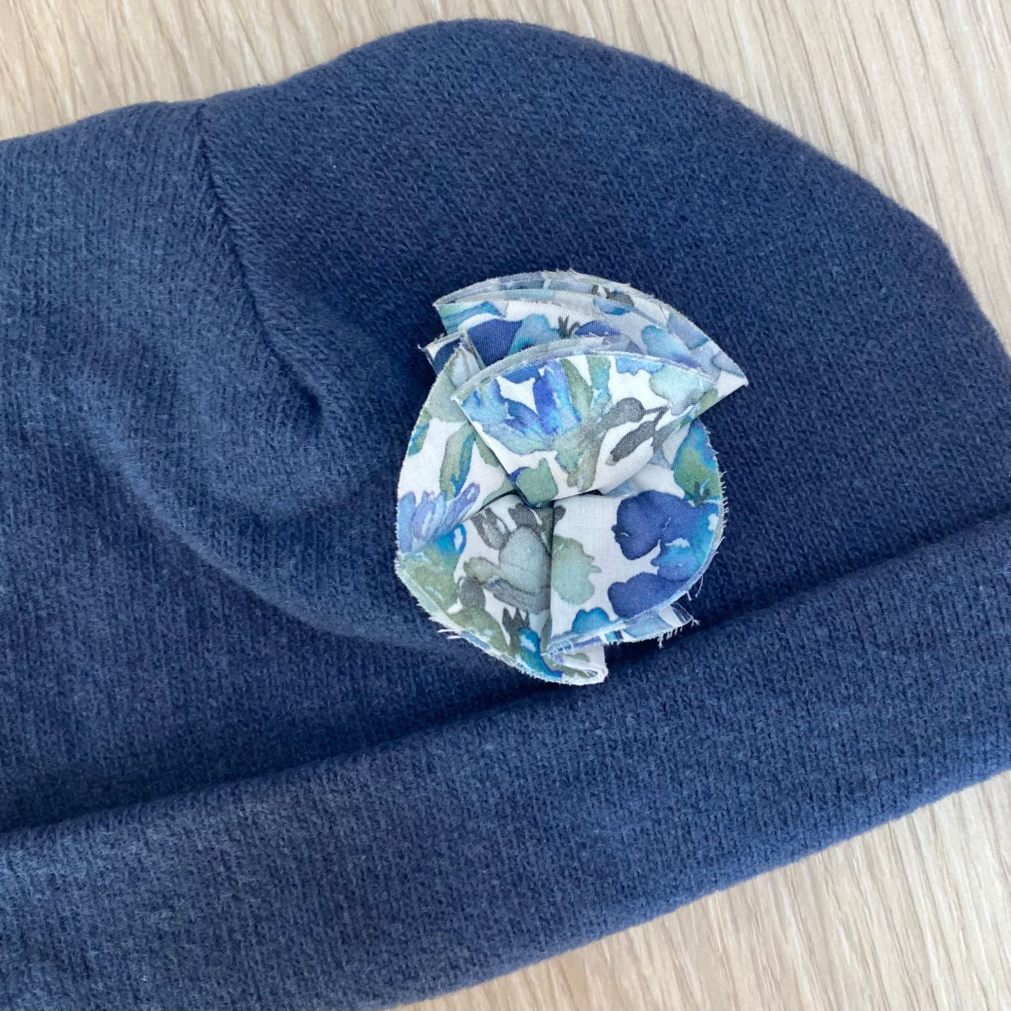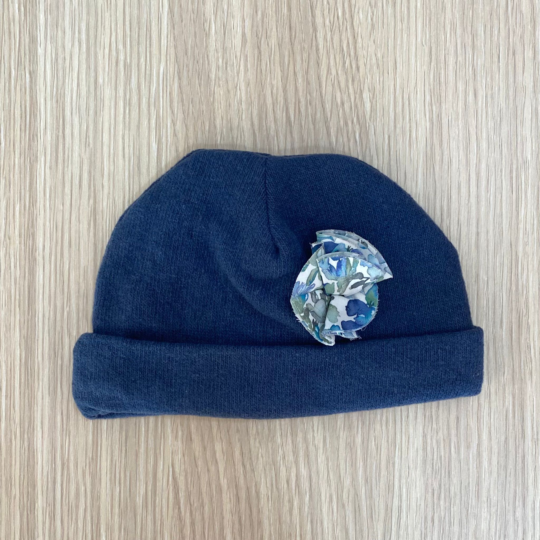 Cappellino neonata in caldo cotone, di colore blu, con applicazione di dettagli floreale in rilievo.