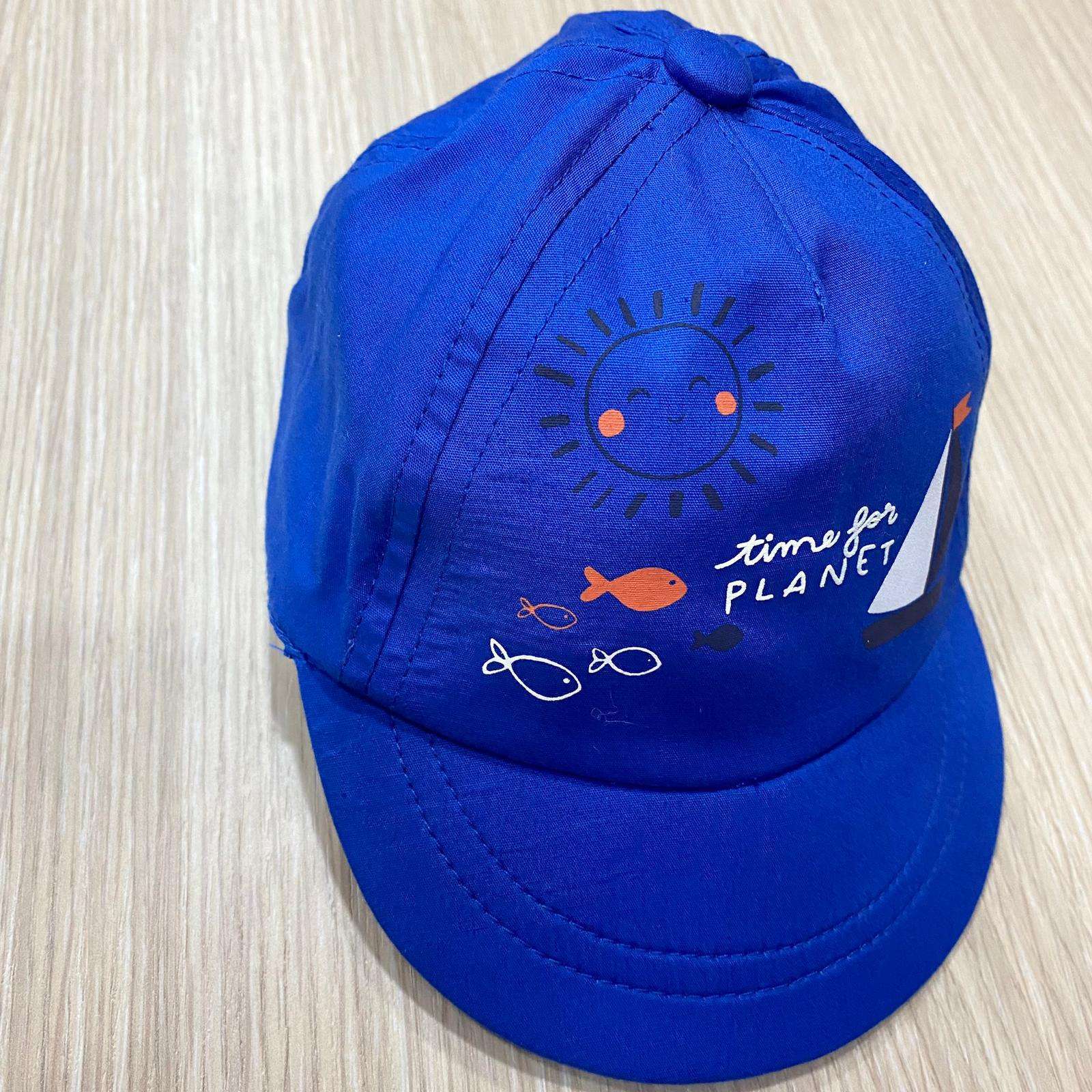 Cappellino neonato in cotone, di colore blu, con stampa di vari colori. Cappellino con visiera.