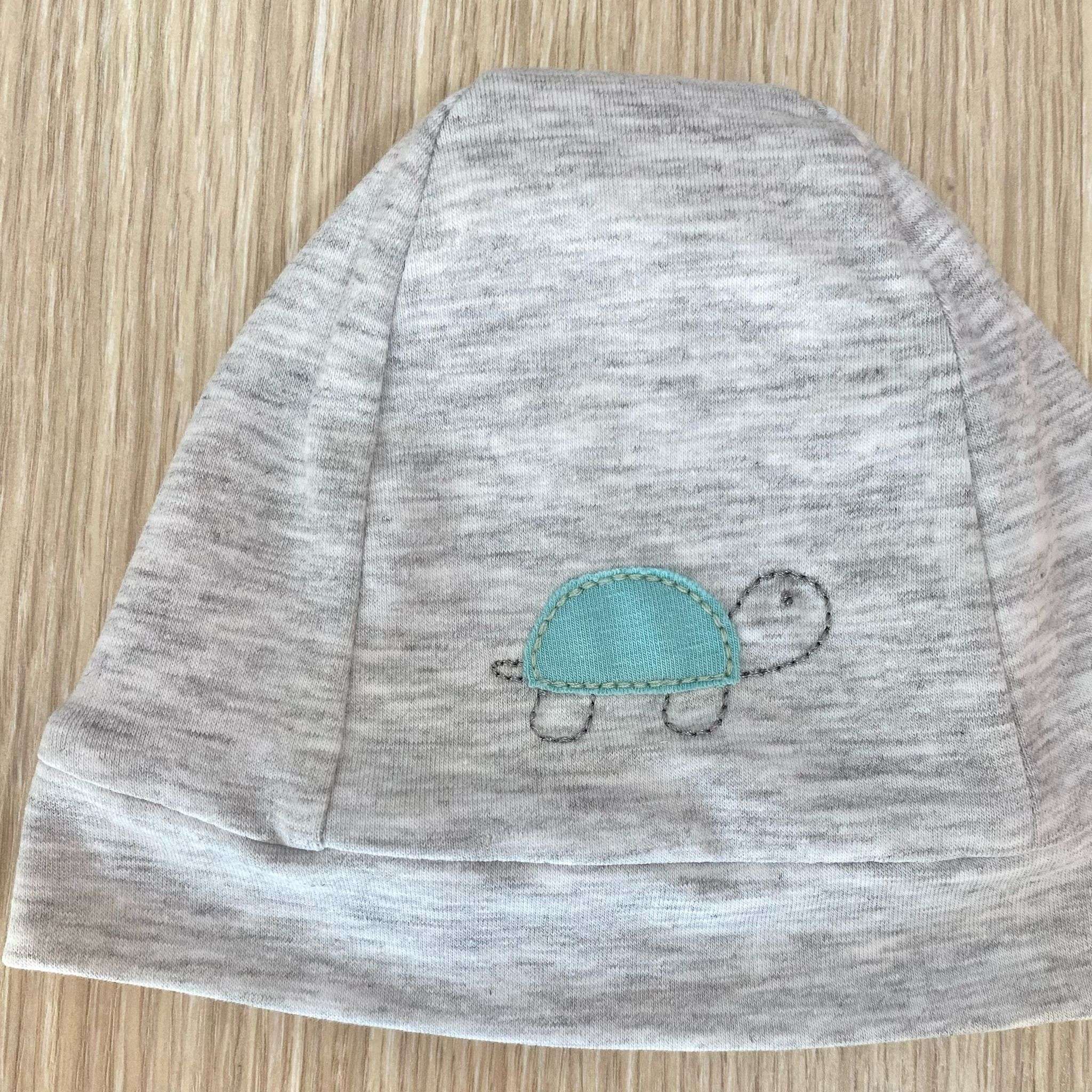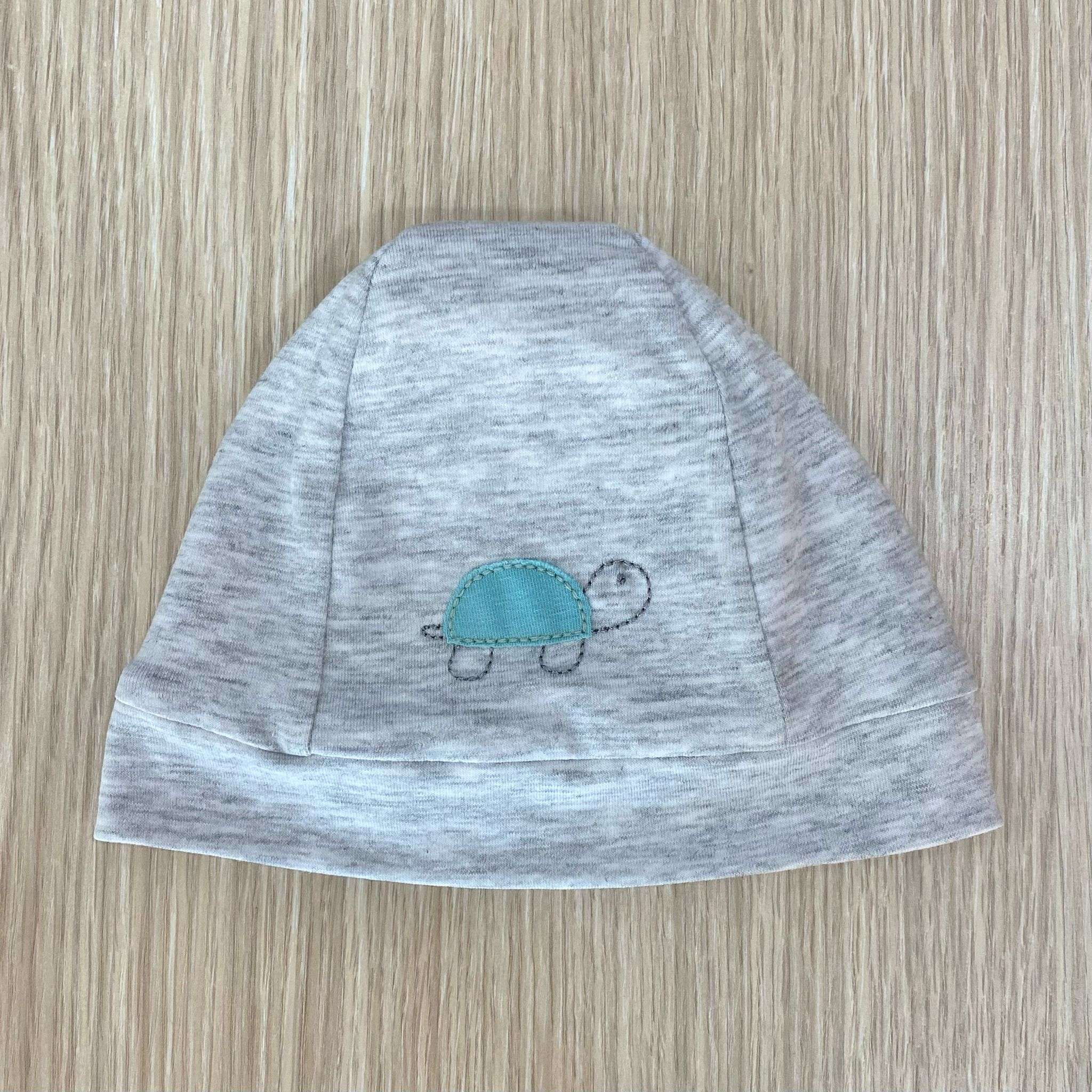 Cappellino neonato in cotone, di colore grigio e verde acqua, con disegno ricamato. 95% Cotone. 5% Elastane.