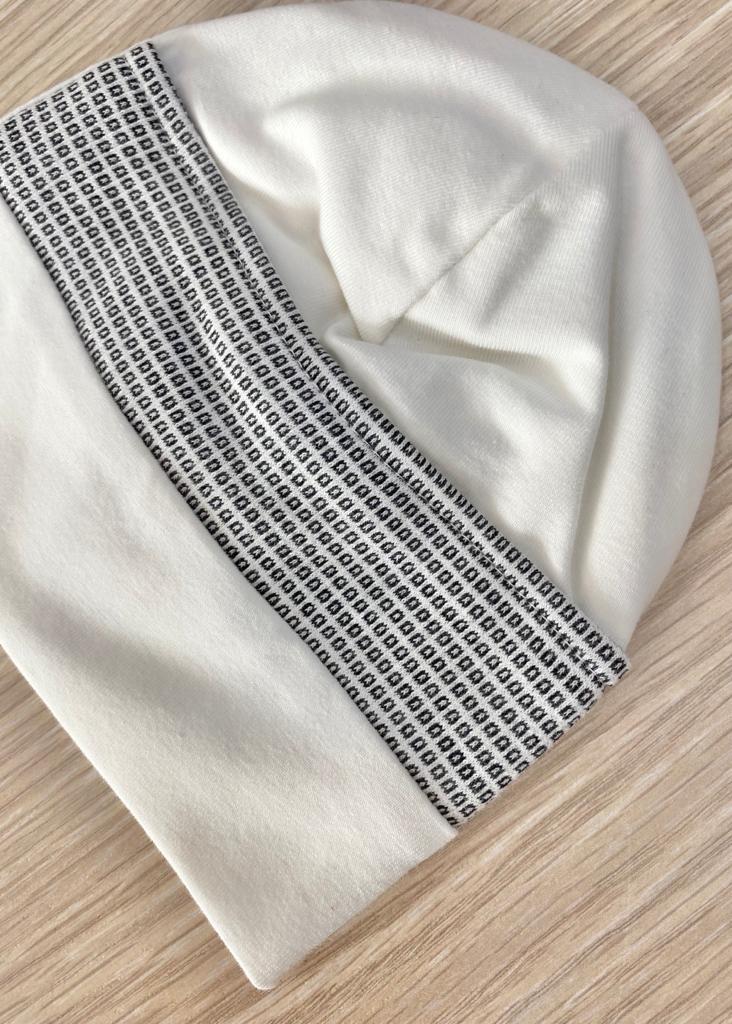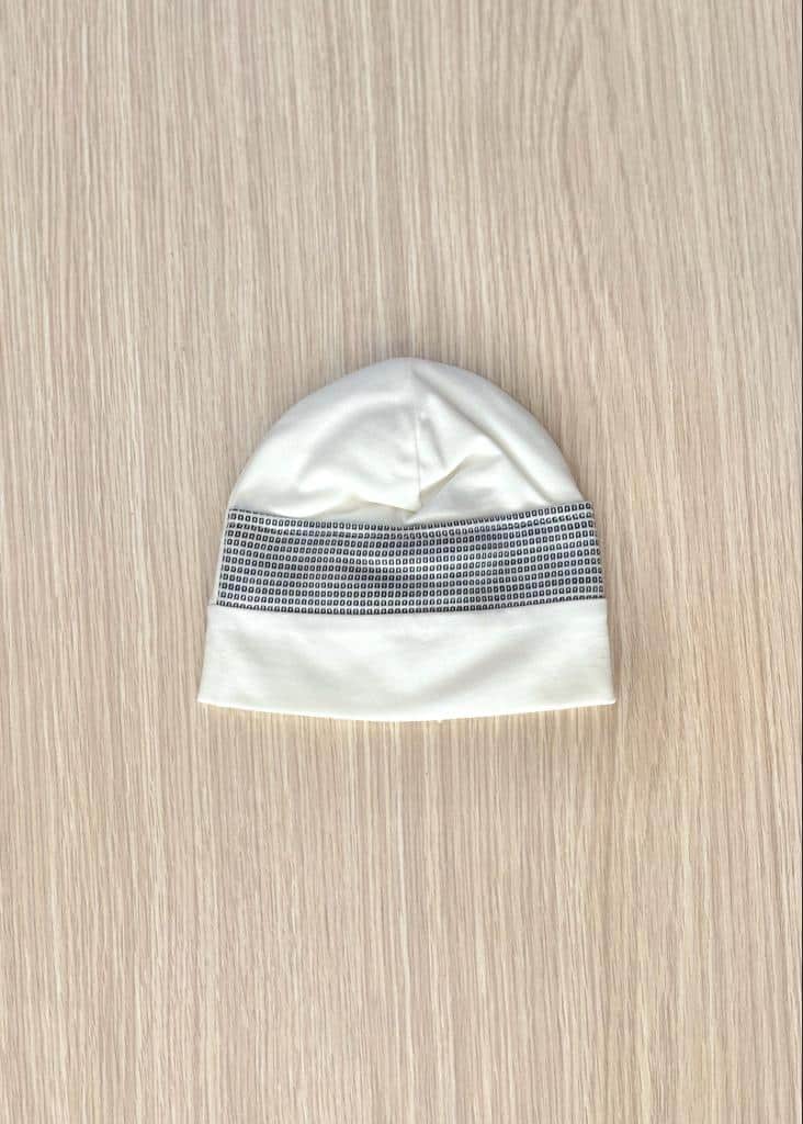 Cappellino neonato in caldo cotone, in doppio tessuto, di colore panna con dettaglio di quadretti. 95% Cotone. 5% Elastan. Made in Italy.