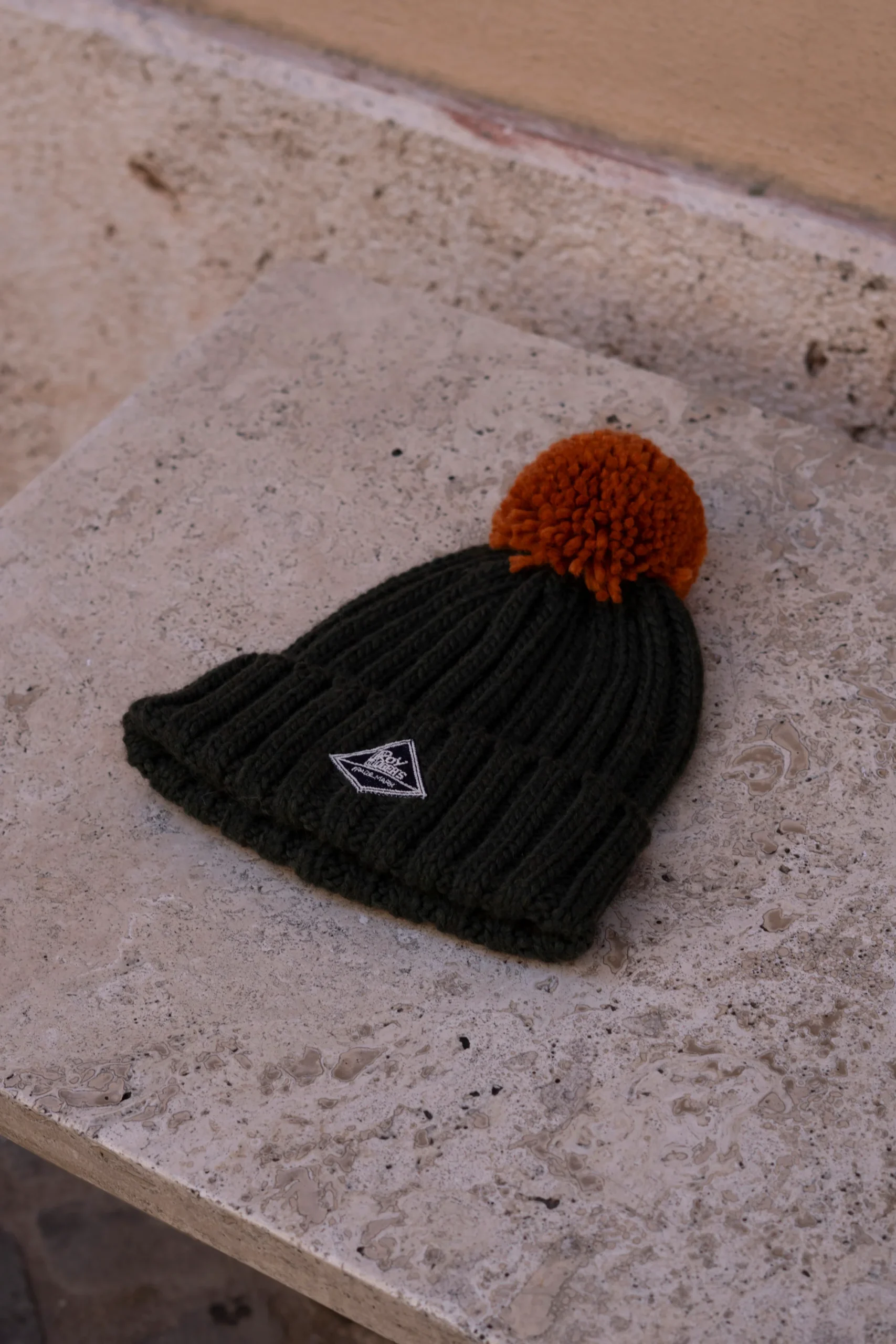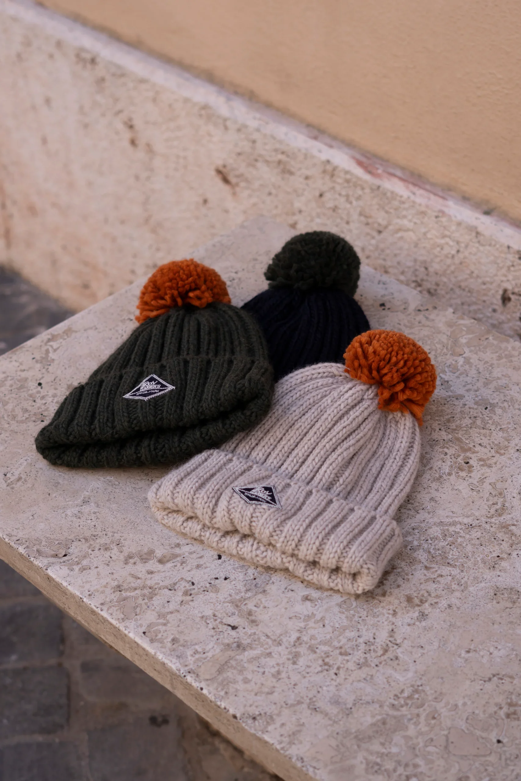 Cappello Roy Roger’s in maglia misto lana con filato monocolore. Lavorazione knit a coste. Patch Roy Roger’s in denim applicata sul fronte. Pon Pon superiore in contrasto di colore.