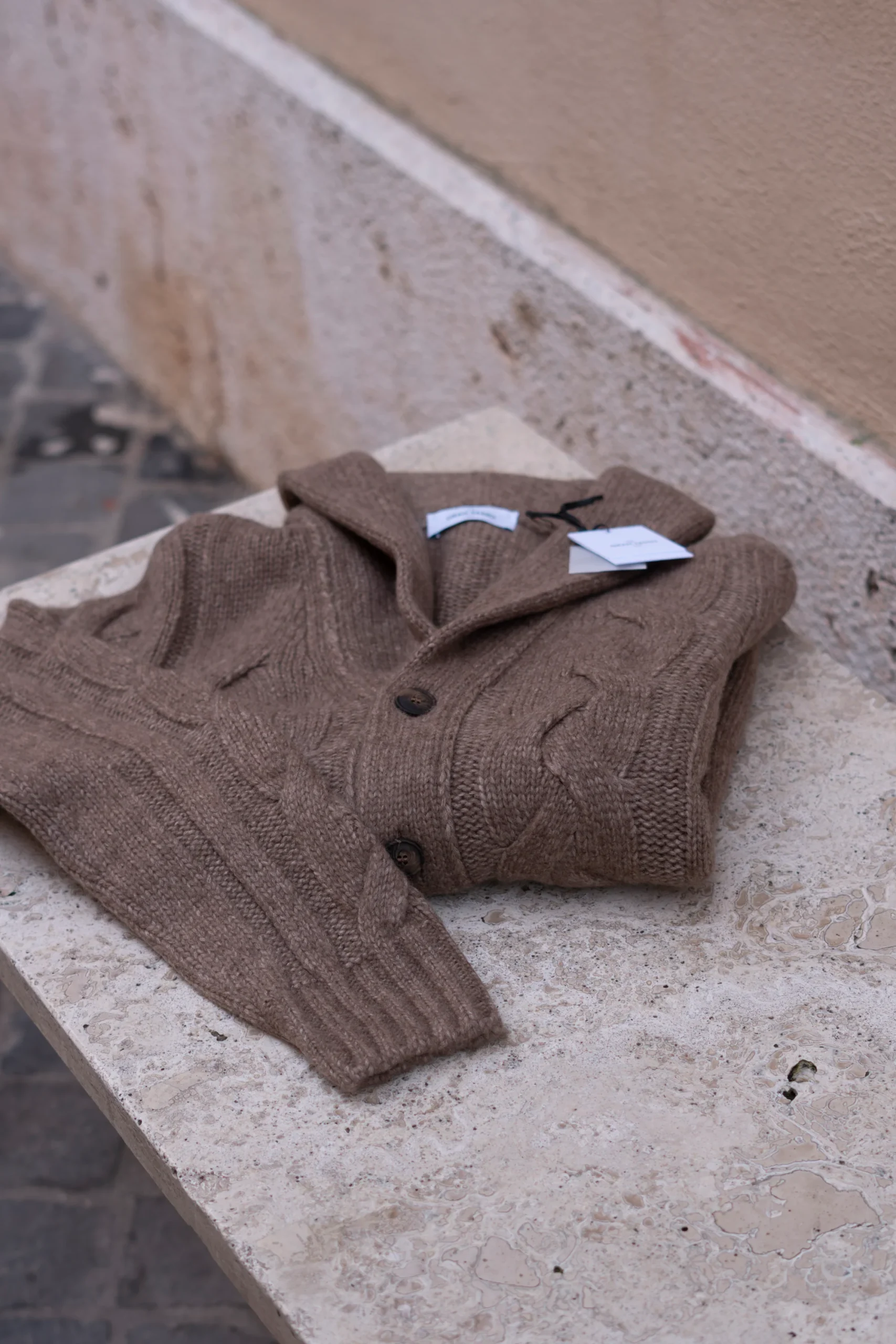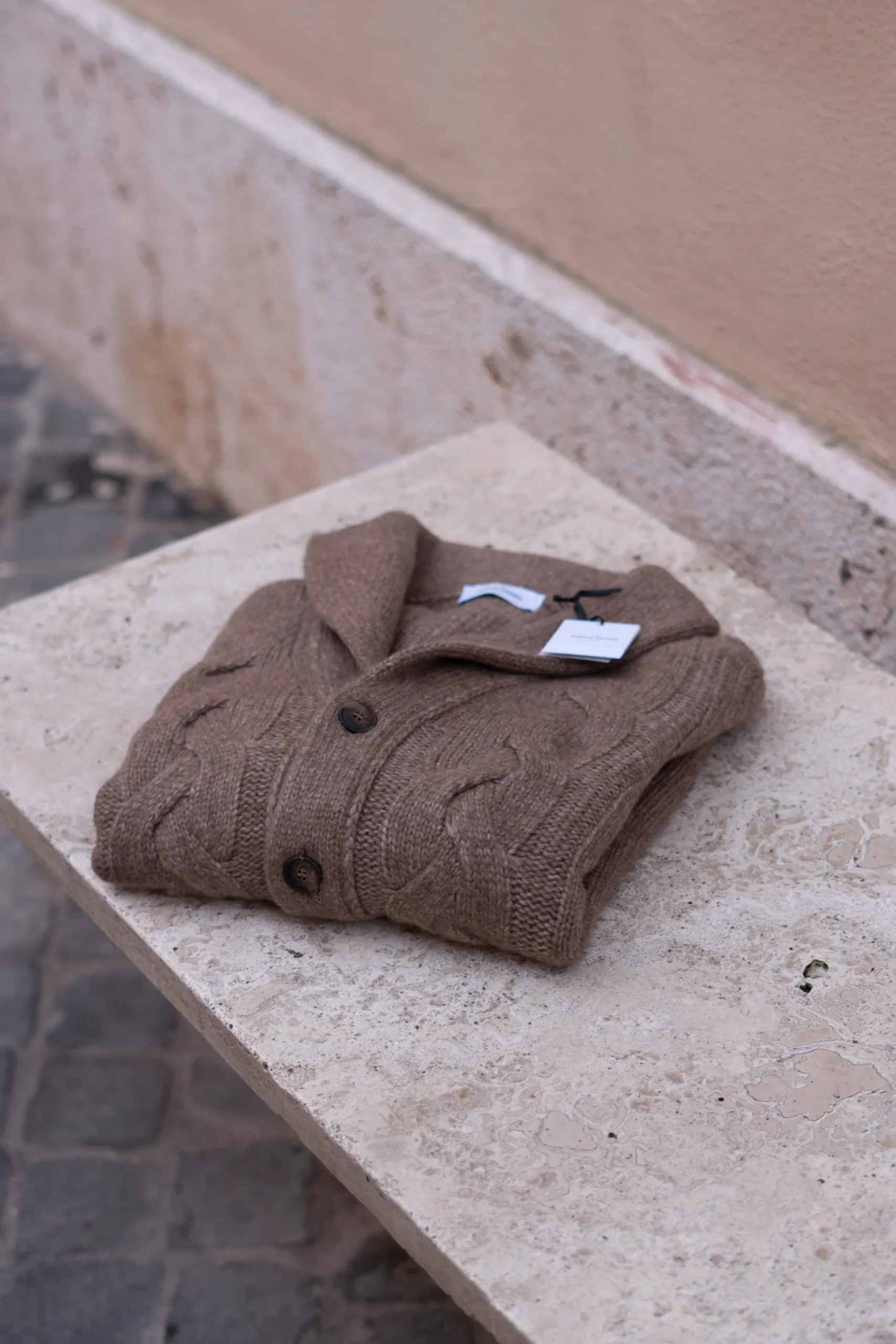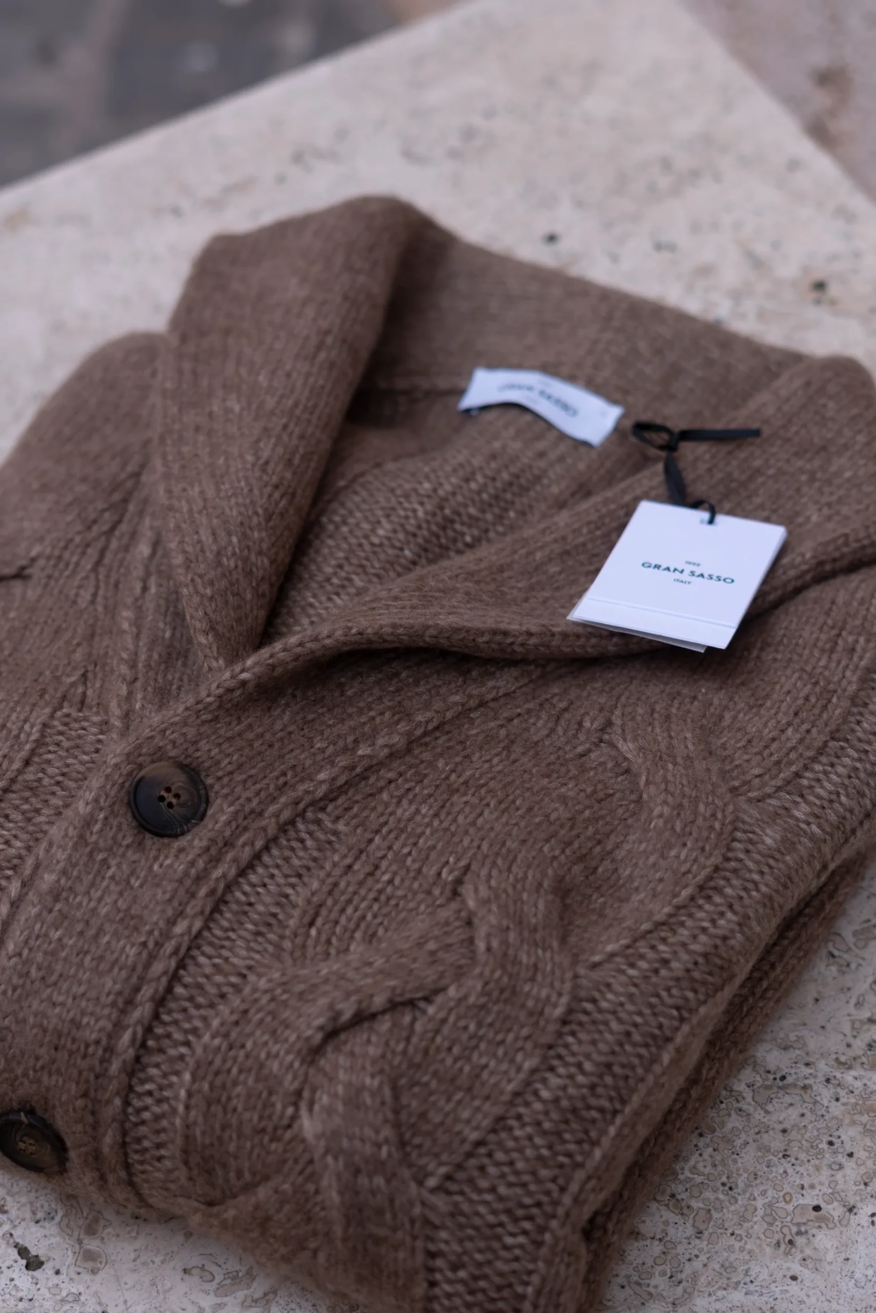 Cardigan con collo scialle caratterizzato da una pregiata lavorazione a trecce. La chiusura è completata da 5 bottoni che aggiungono praticità e stile. Un capo caldo e versatile, perfetto per arricchire il tuo guardaroba con eleganza. Regular fit Fabbricato in Italia Composizione 70% Lana – 30% Poliammide