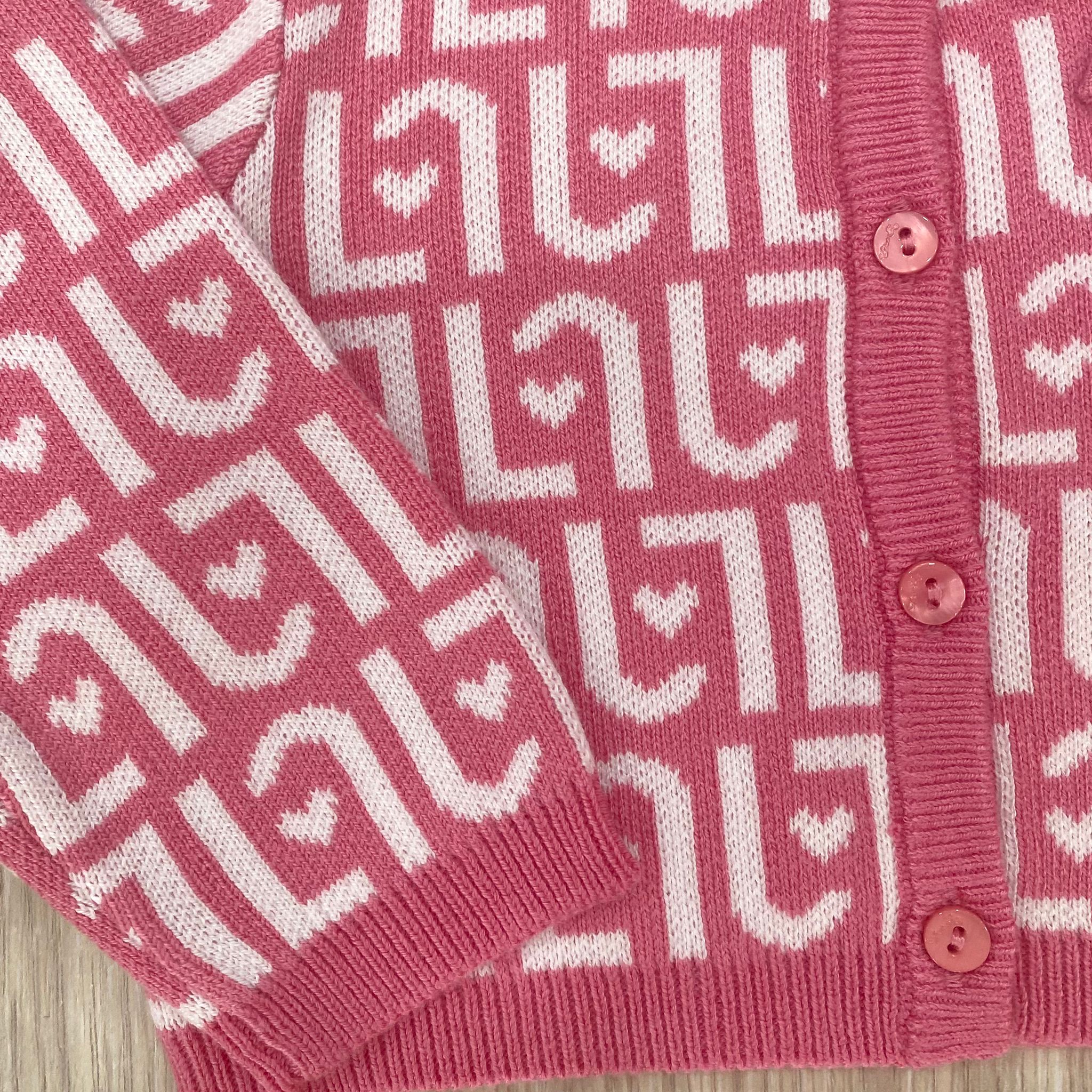 Cardigan neonata/bambina in caldo cotone, di colore rosa e bianco, con applicazione di bottoncini e fiocchetto in tessuto. 50% Viscosa. 30% Cotone. 20% Poliammide.