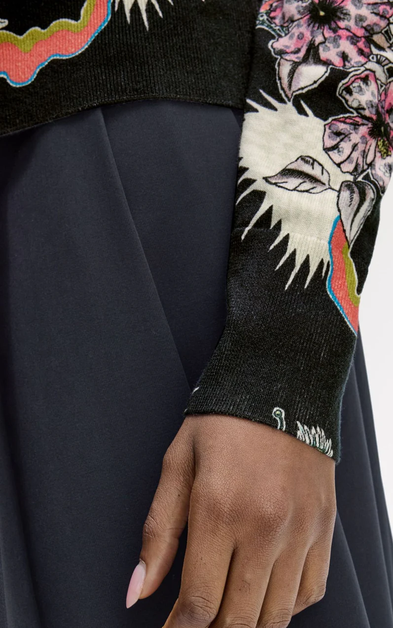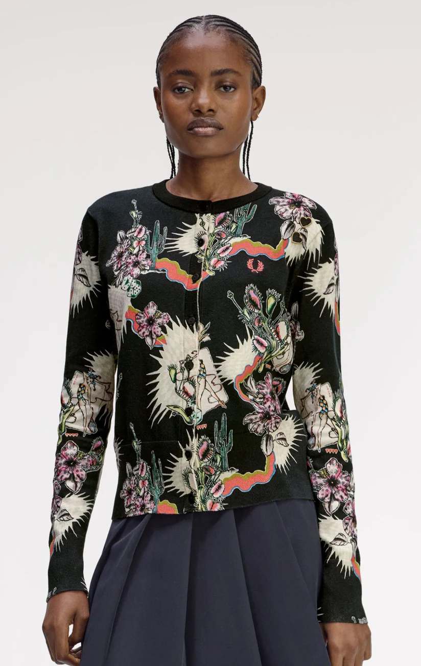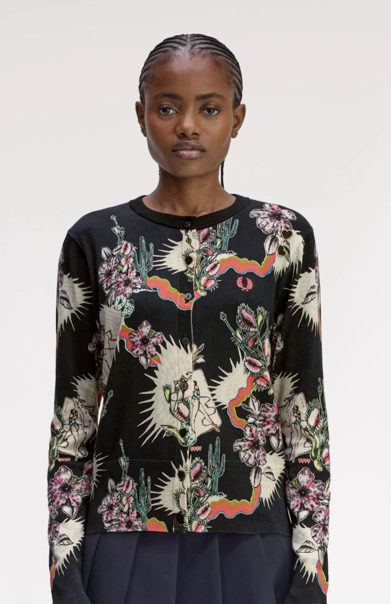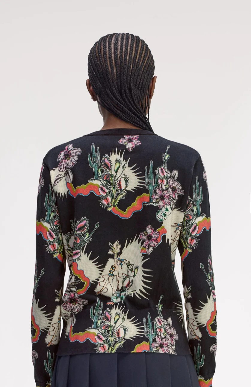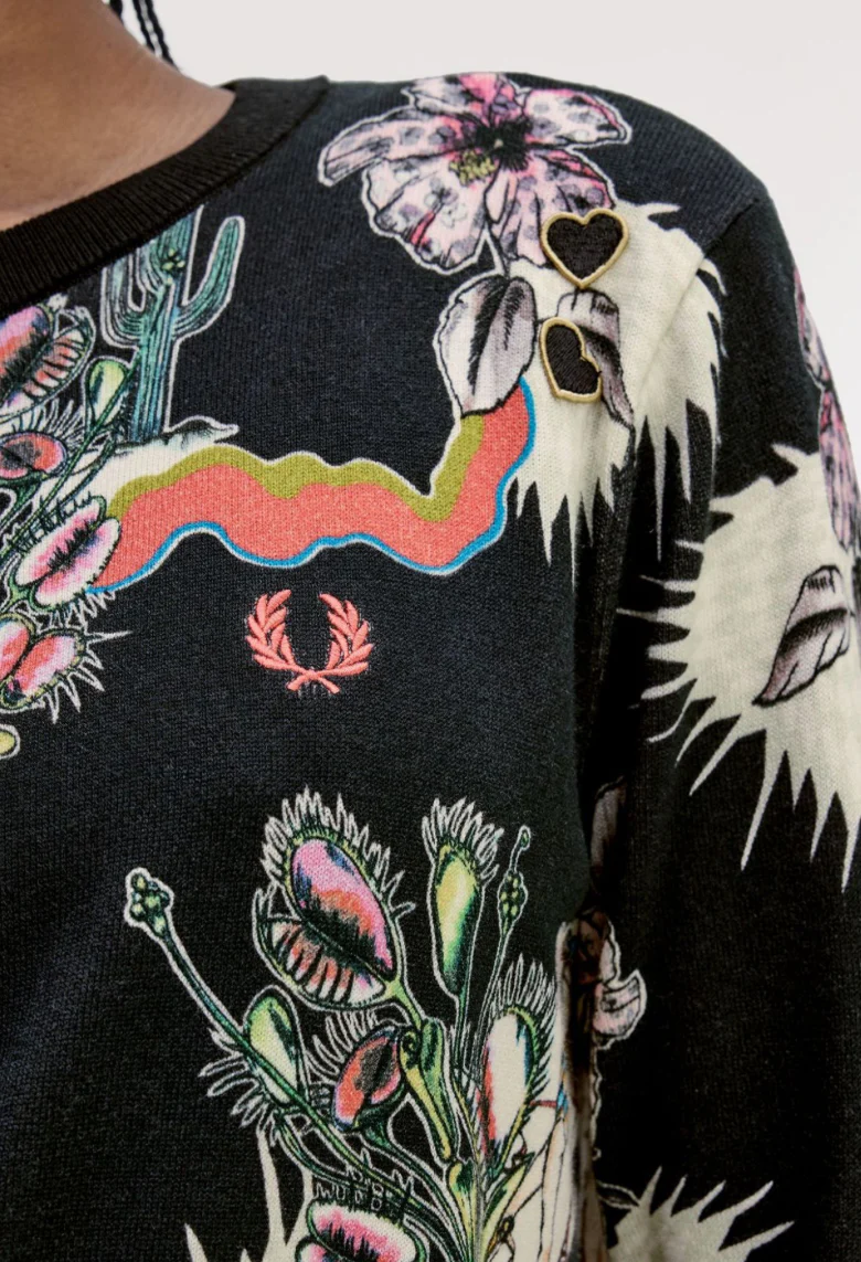 Il nostro cardigan stampato sprigiona un’energia audace e surrealista, dal tocco quasi psichedelico. Il mondo botanico si fonde con quello mitologico, dando vita a un’estetica che ricorda i tatuaggi classici. Come in tutte le creazioni ispirate ad Amy, il capo è impreziosito dai suoi cuori ricamati sopra la corona d’alloro.