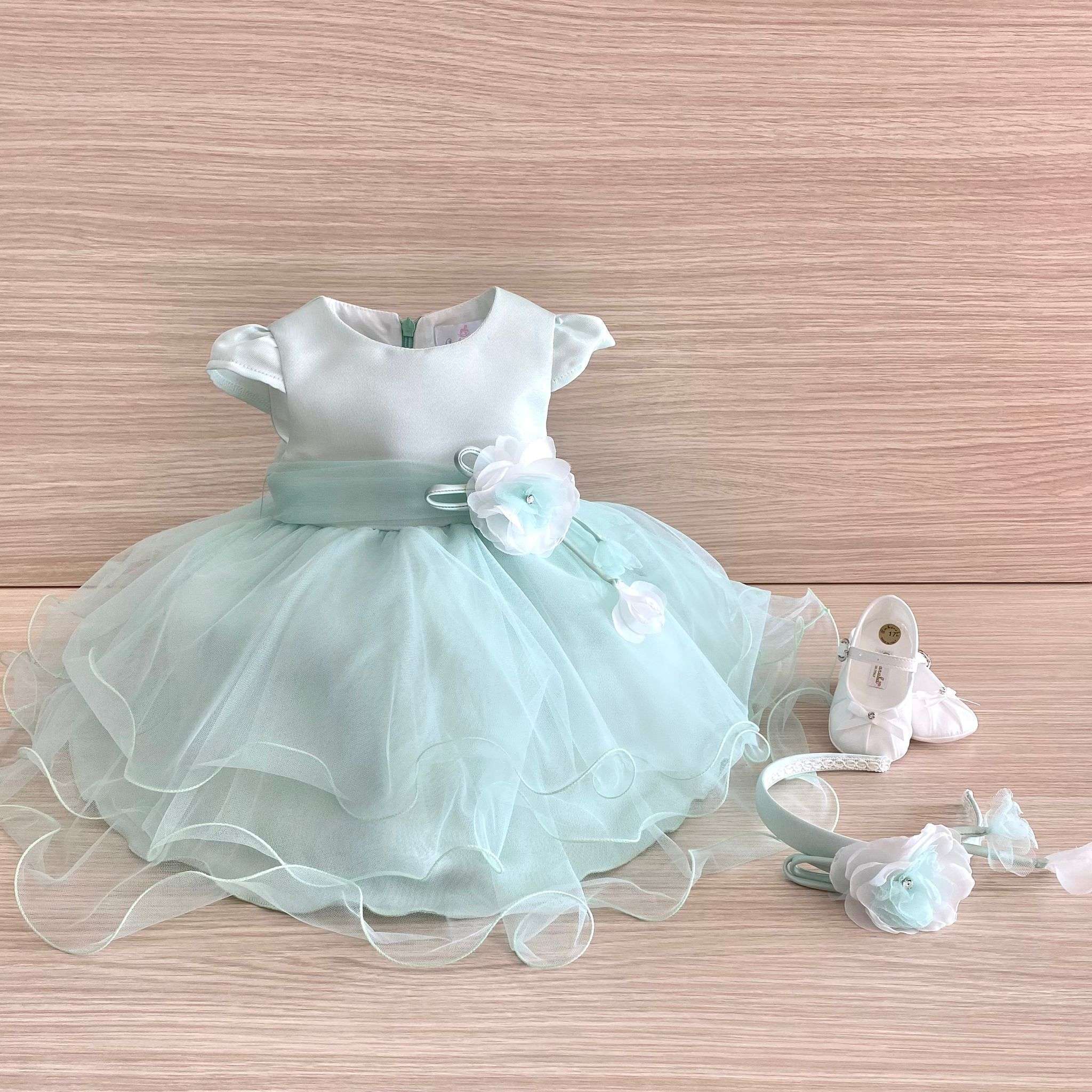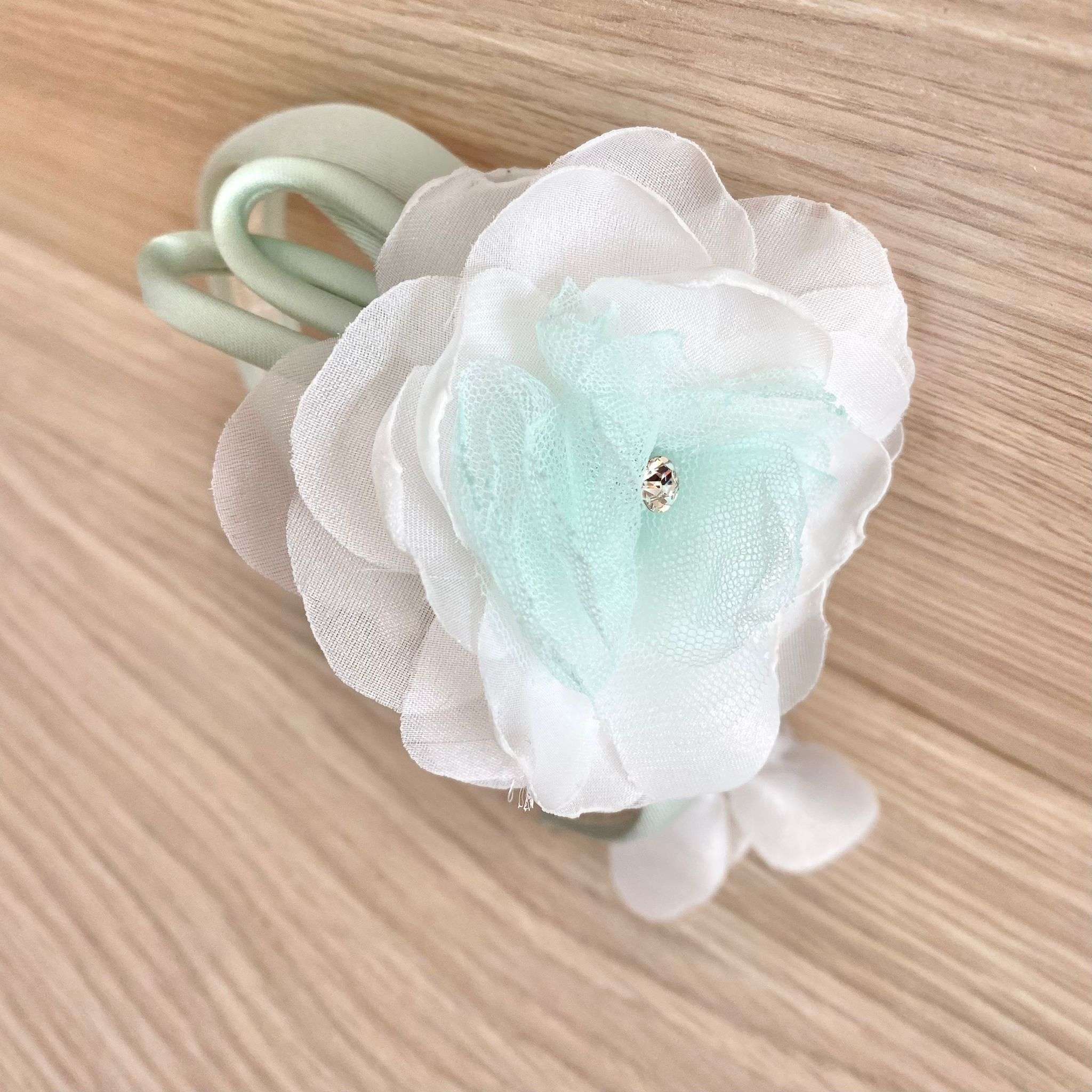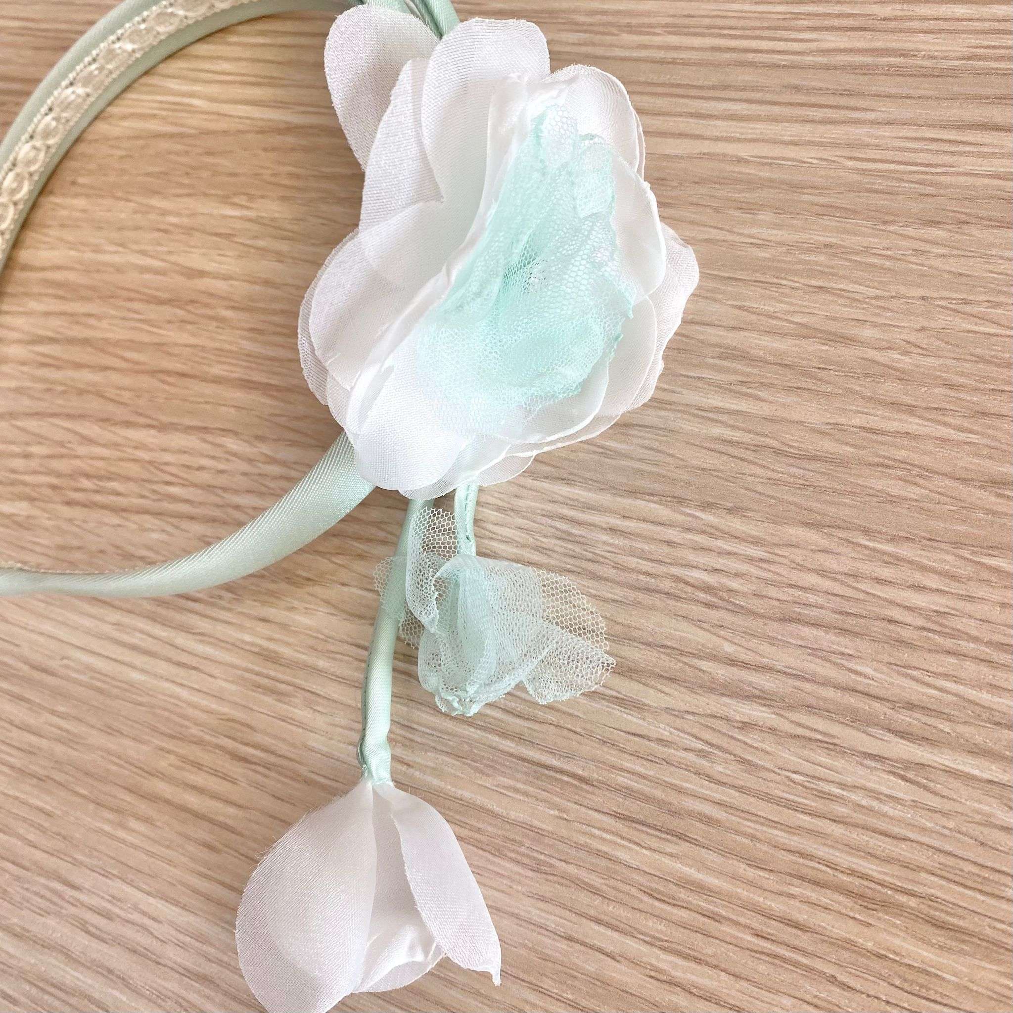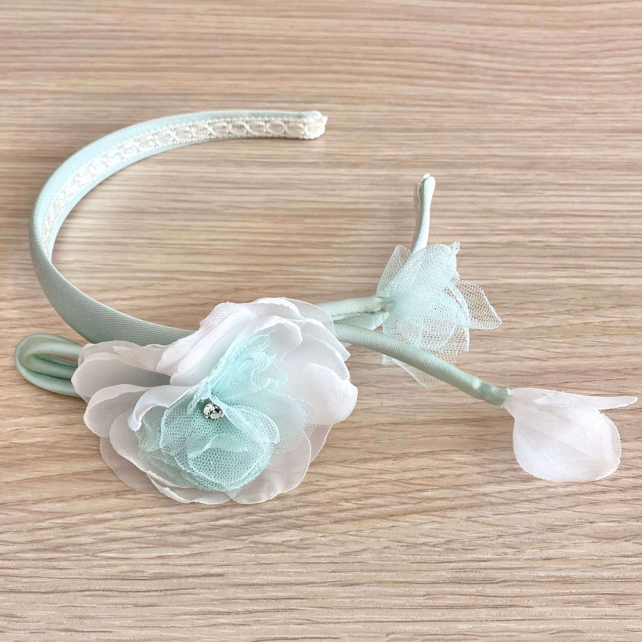 Cerchietto bambina elegante per battesimo/cerimonia, di colore verde acqua con fiorellino di colere bianco e verde acqua in organza e applicazione di swarovski. Taglia Unica.