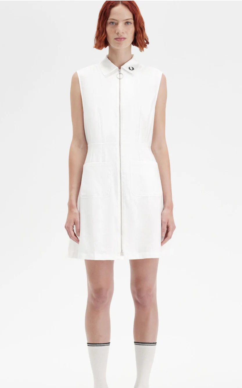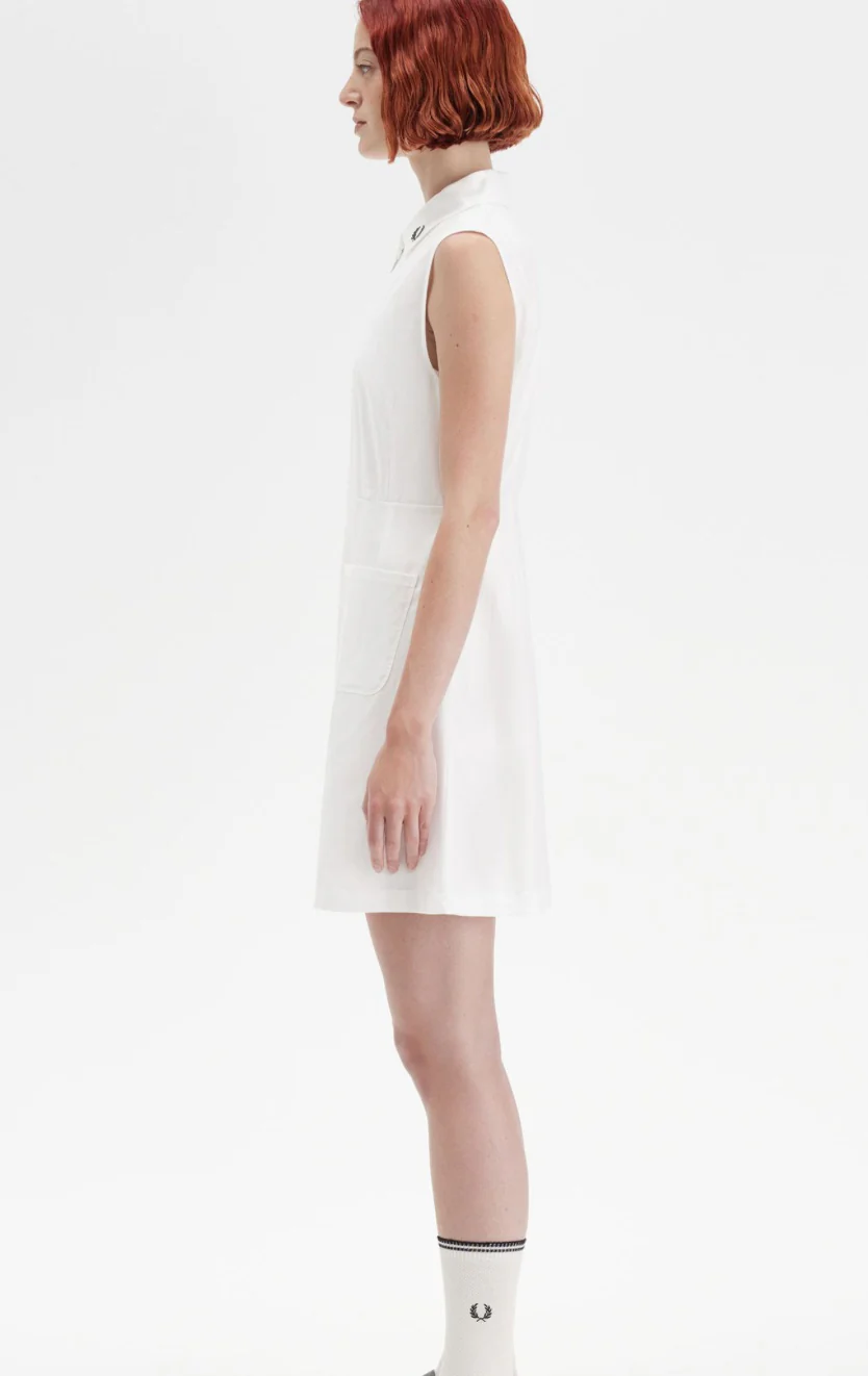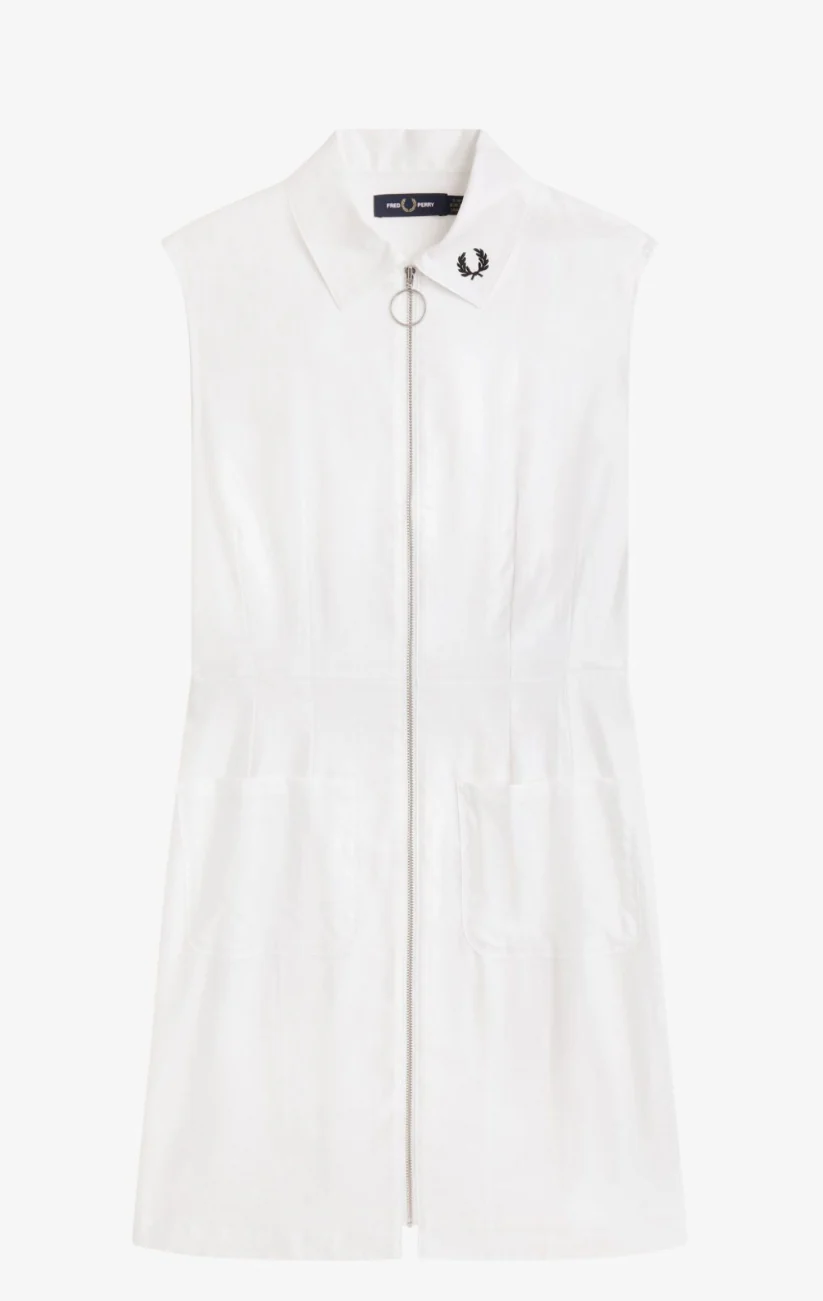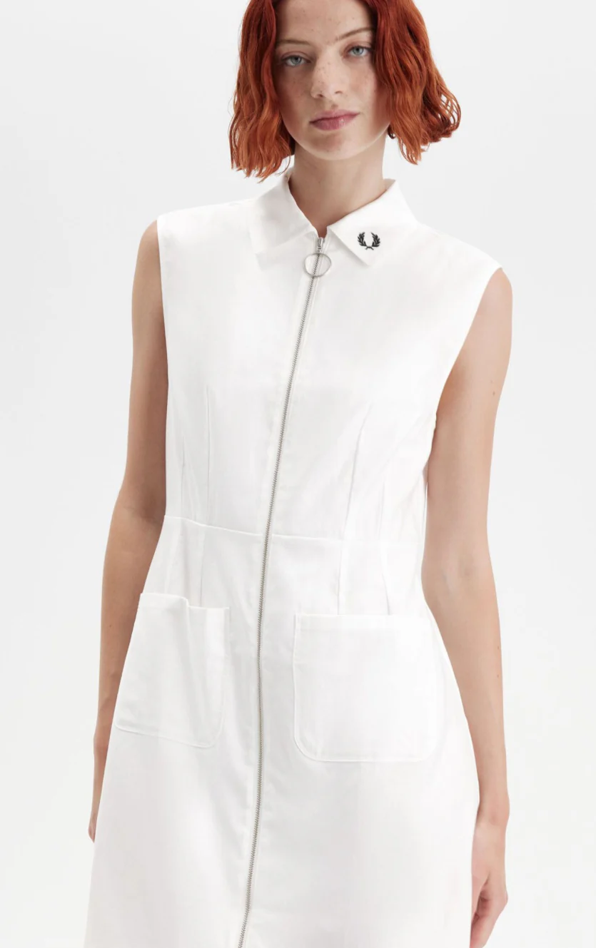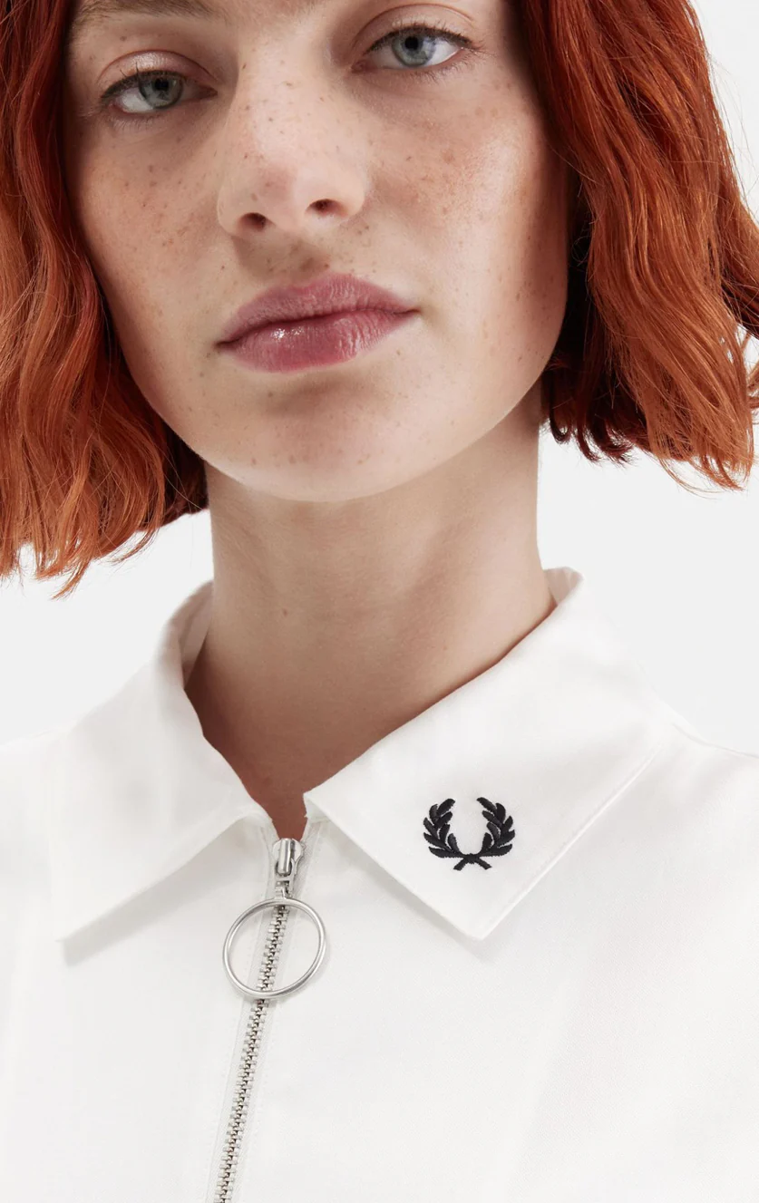 Mescolando dettagli sartoriali e finiture d’ispirazione sportiva, il nostro chemisier con zip intera ti porterà da bordo campo alla sala da ballo. Un must-have per l’estate completo di tasche applicate, zip intera con un nostalgico tiralampo ad anello e dettagli sartoriali sulla parte centrale per un punto vita aderente. Il capo è rifinito con un raro tocco Fred Perry: la nostra corona d’alloro ricamata in nero intenso a contrasto sul colletto sinistro. Per non smettere mai di giocare.