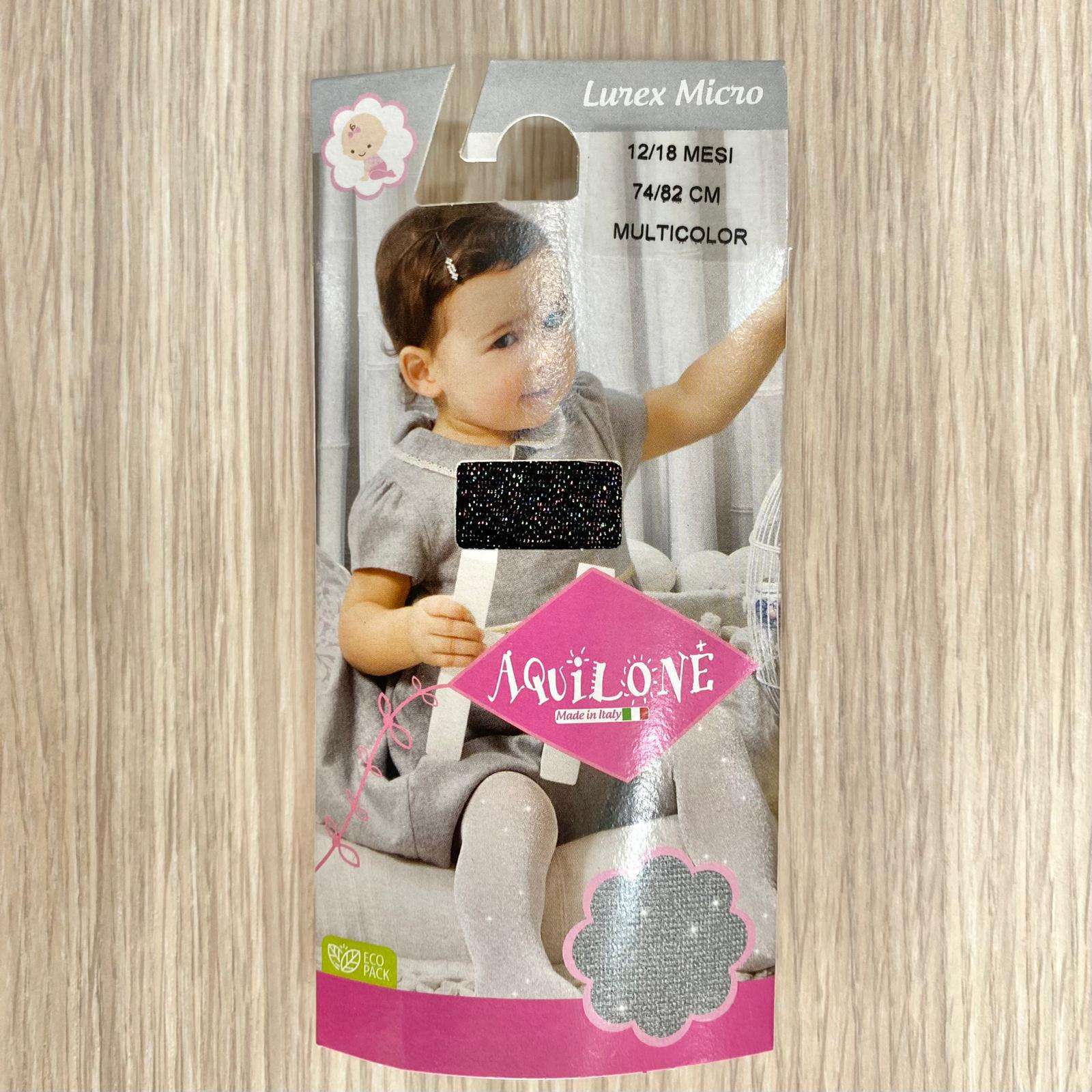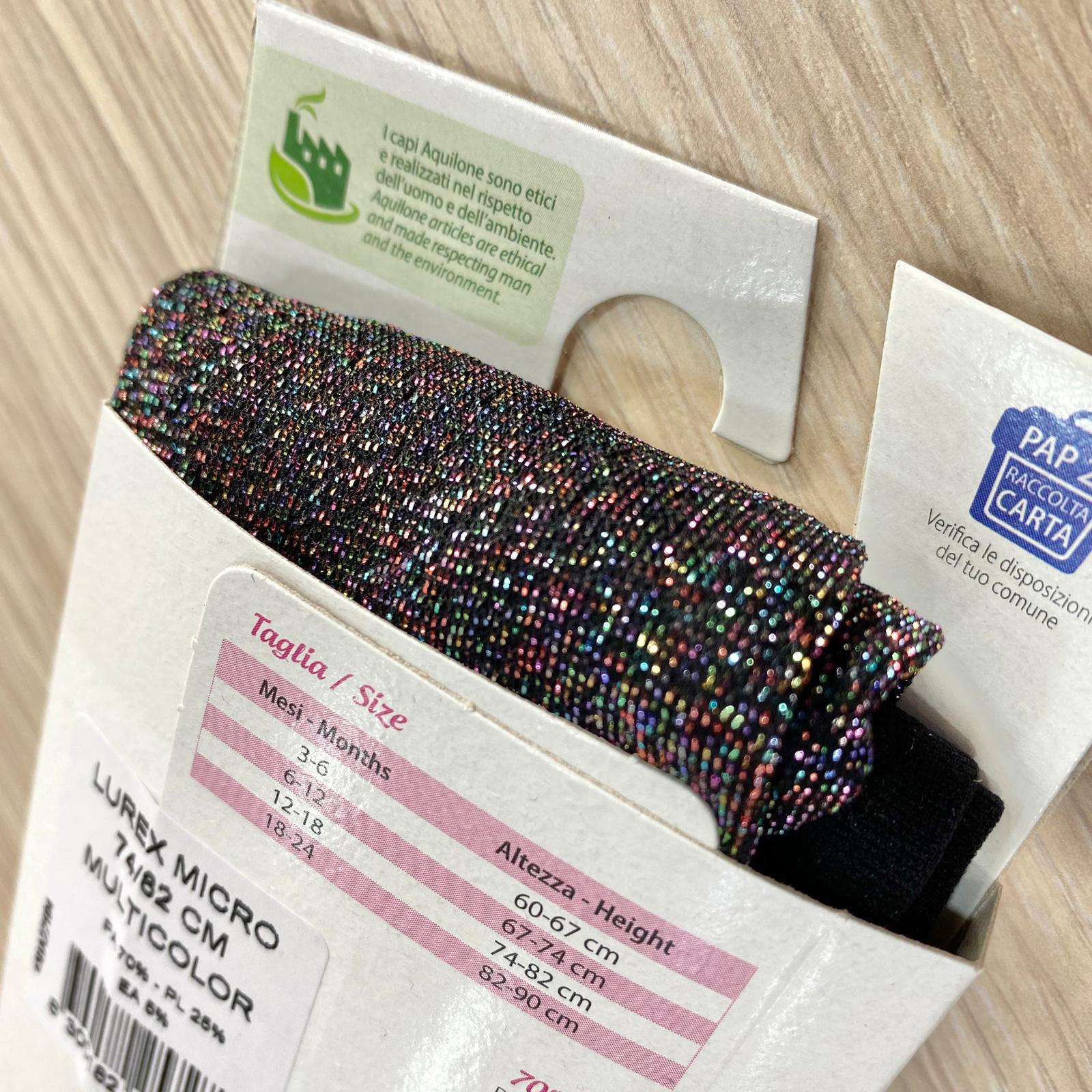 Collant neonata/bambina in microfibra in lurex di colore nero e con dettagli multicolor. 3/6 Mesi: 60/67 cm. 6/12 Mesi: 67-74 cm. 12/18 Mesi: 74-82 cm. 18/24 Mesi: 82-90 cm.