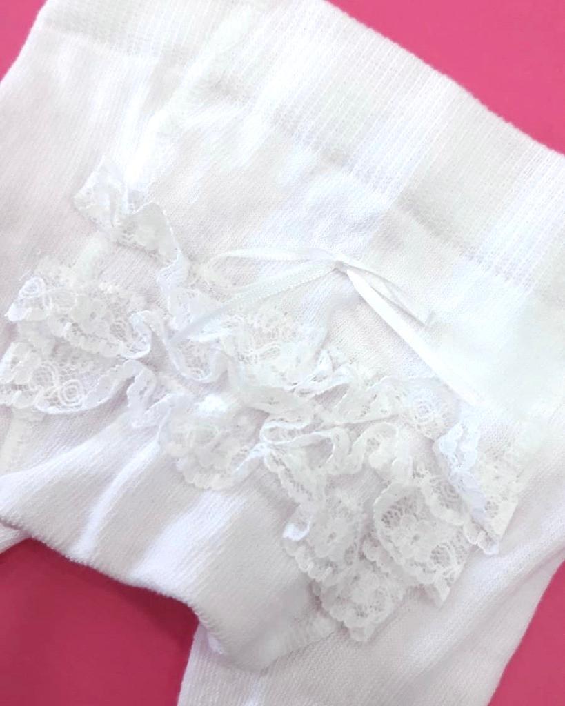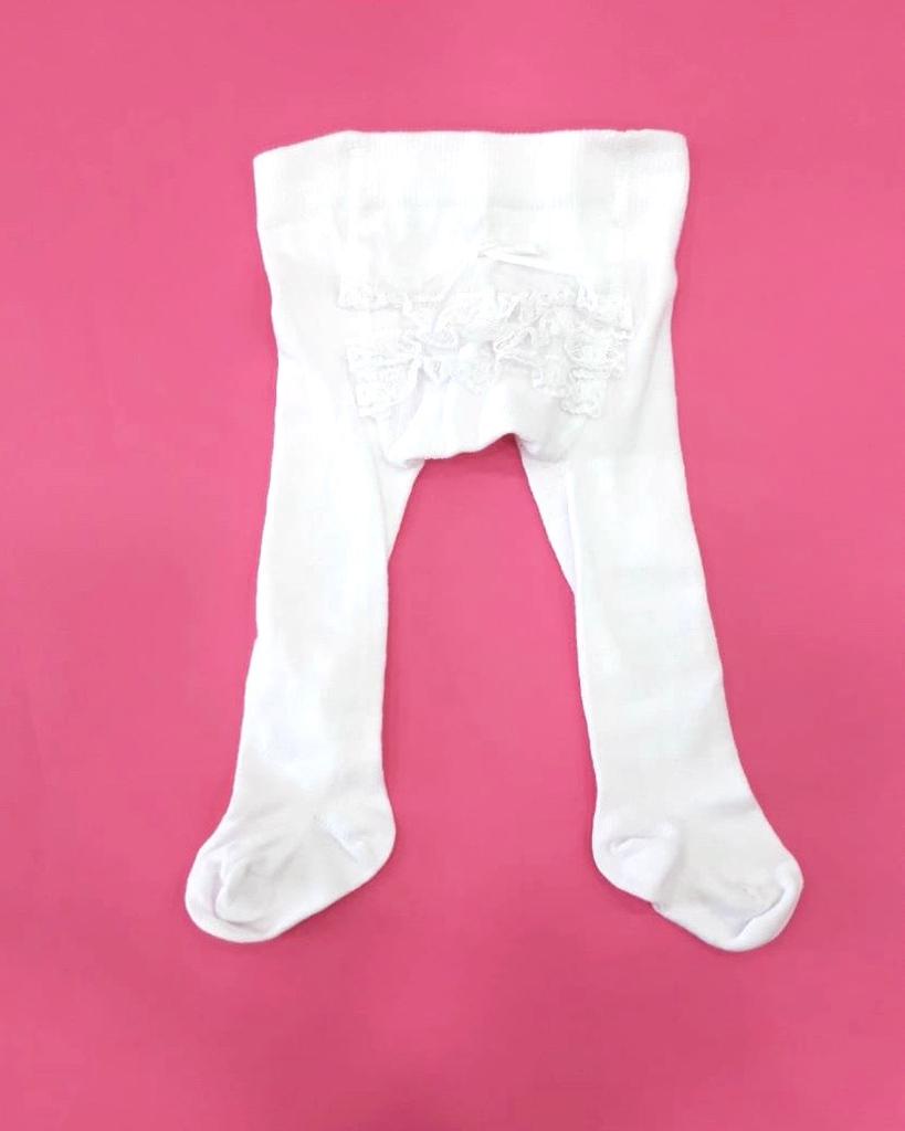 Collant neonata in cotone di colore bianco con applicazione di riccetto e fiocchetto. 90% Cotone. 5% Poliammide. 5% Elastan. Made in Italy.