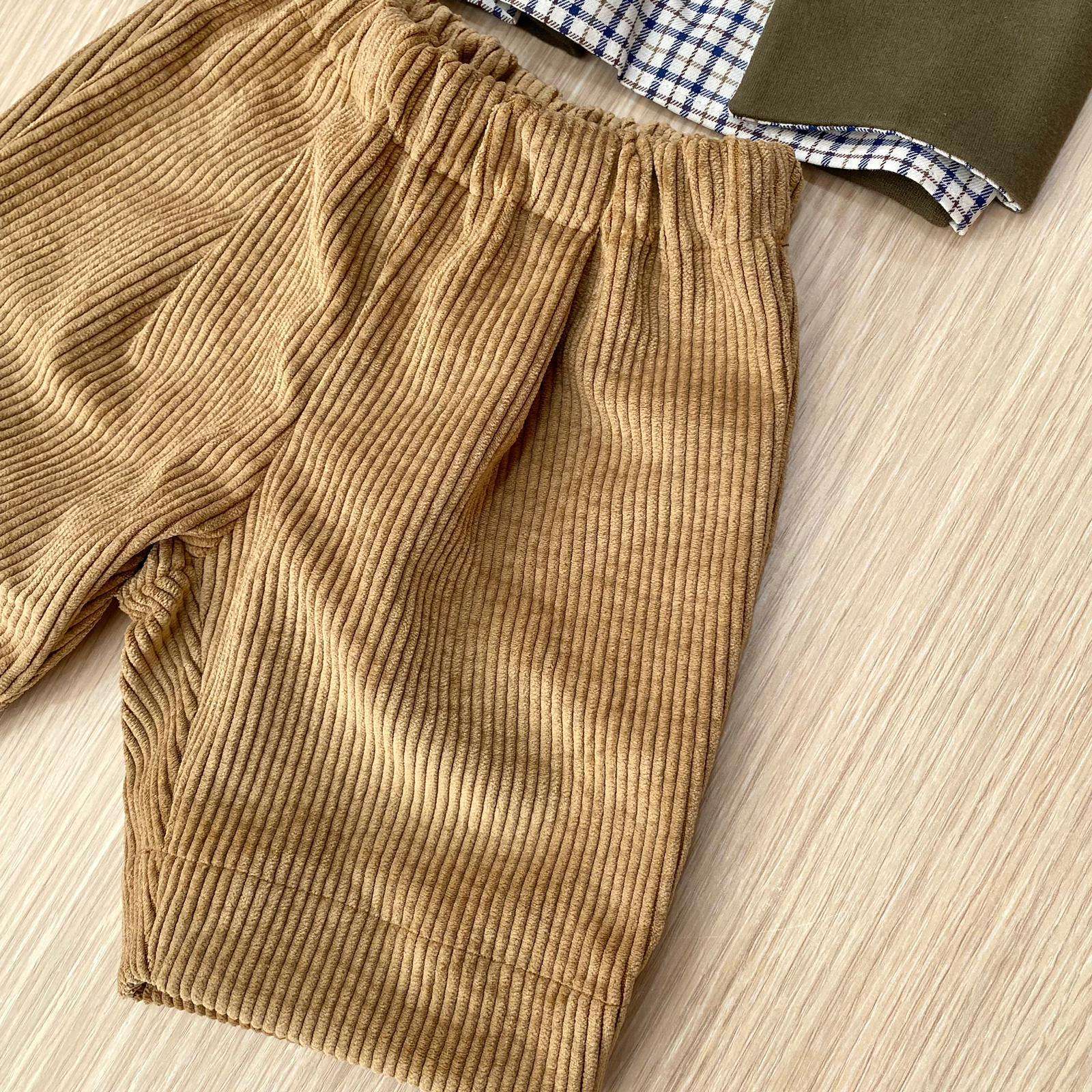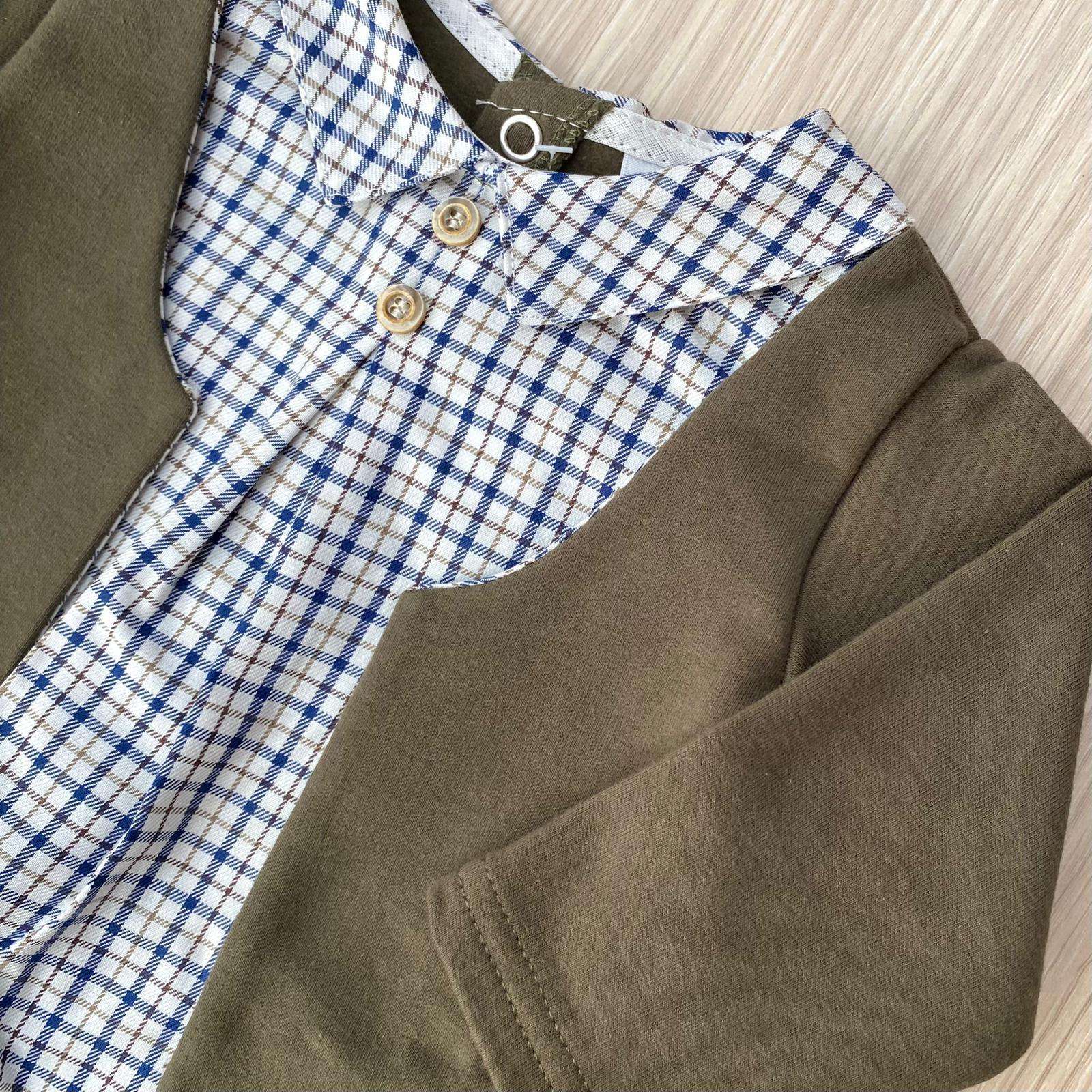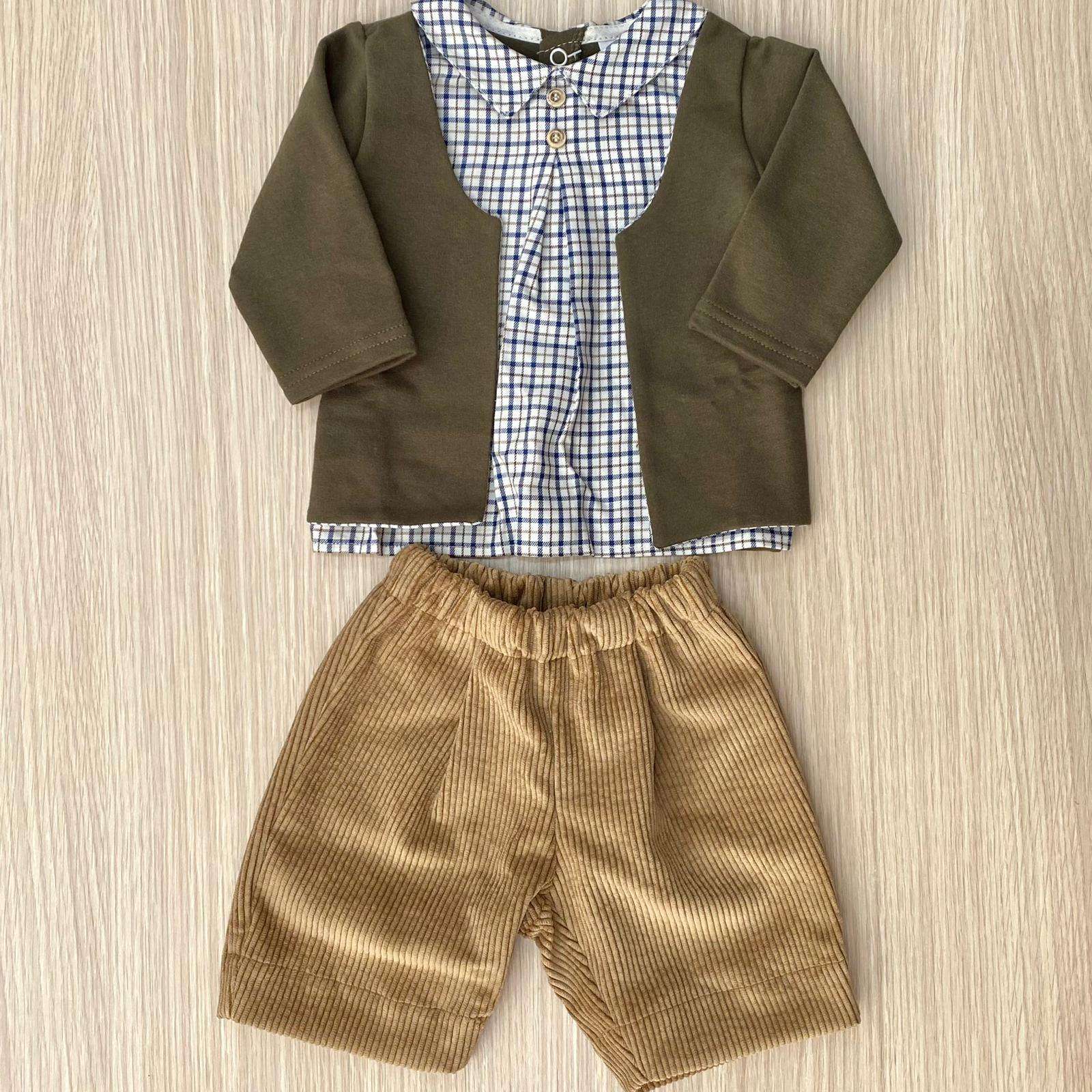 Completino con pantaloncino neonato in cotone felpato e pantaloncino in velluto, di colore verde e marroncino, con dettagli di colore blu. Completo con dettaglio di finto giacchetto. Made in Italy.