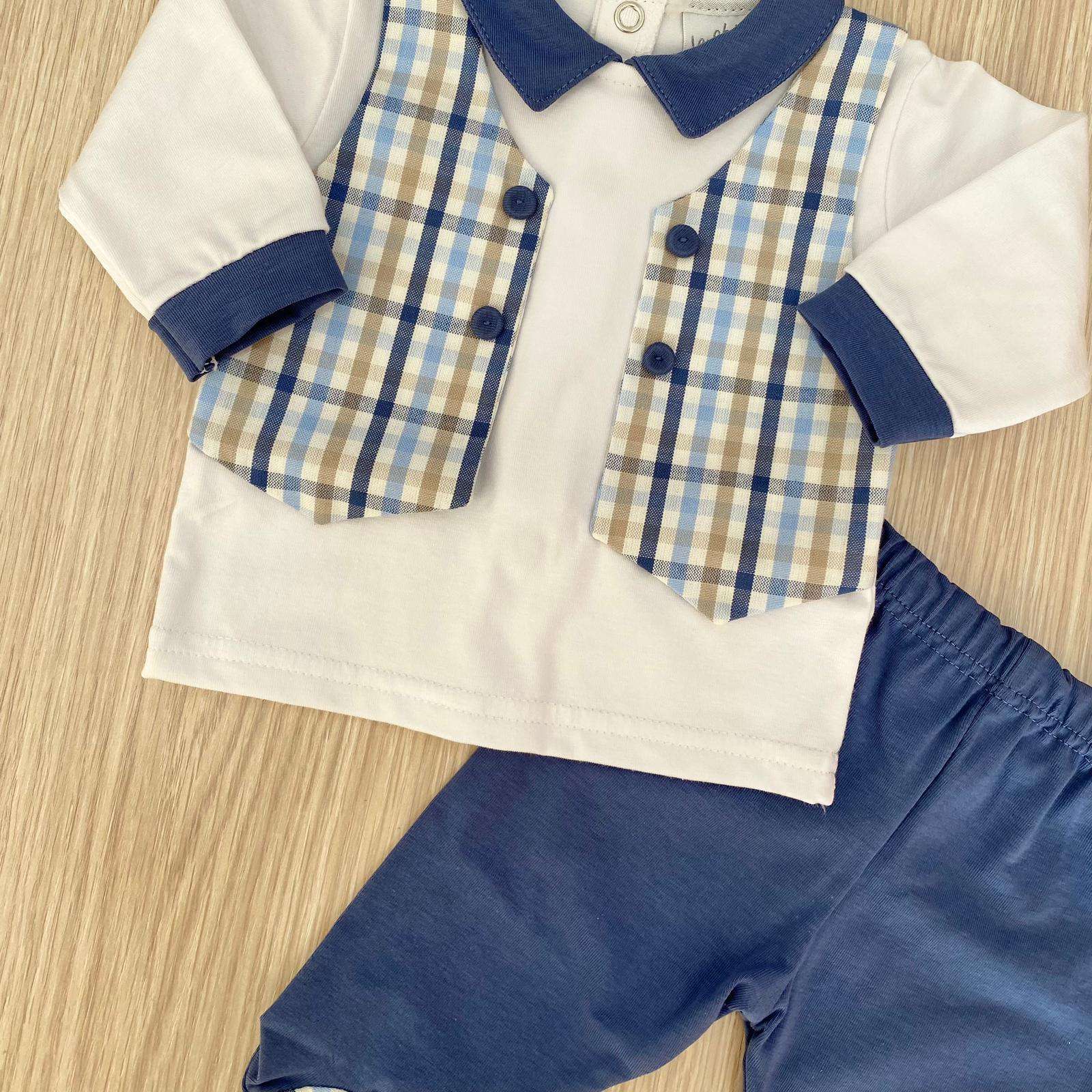 Completino due pezzi neonato in cotone, di colore bianco, blu e beige, con dettaglio di finto gilet. 0/1 Mese: 50/56 cm. 1/3 Mesi: 56/62 cm. Made in Italy.