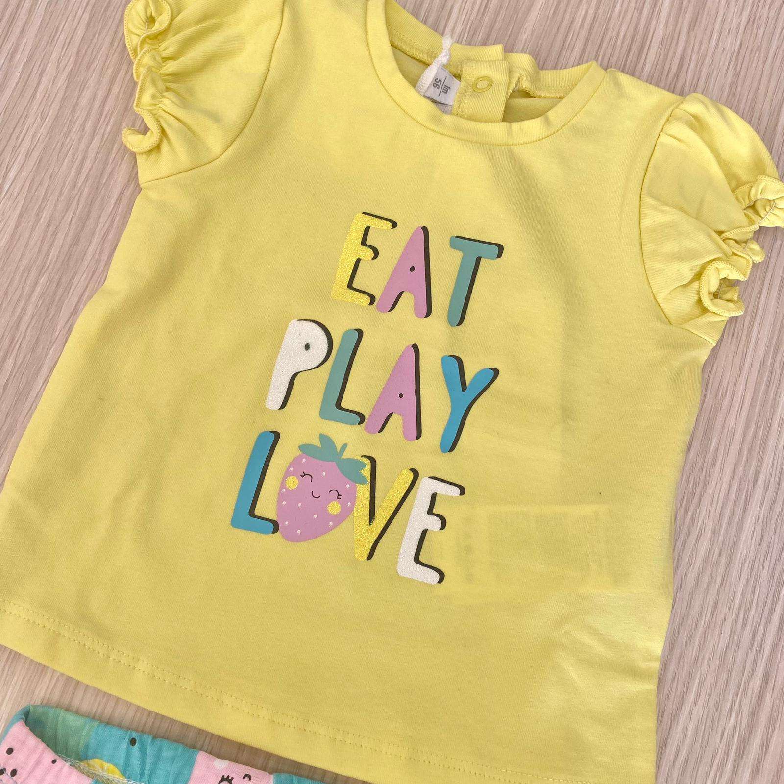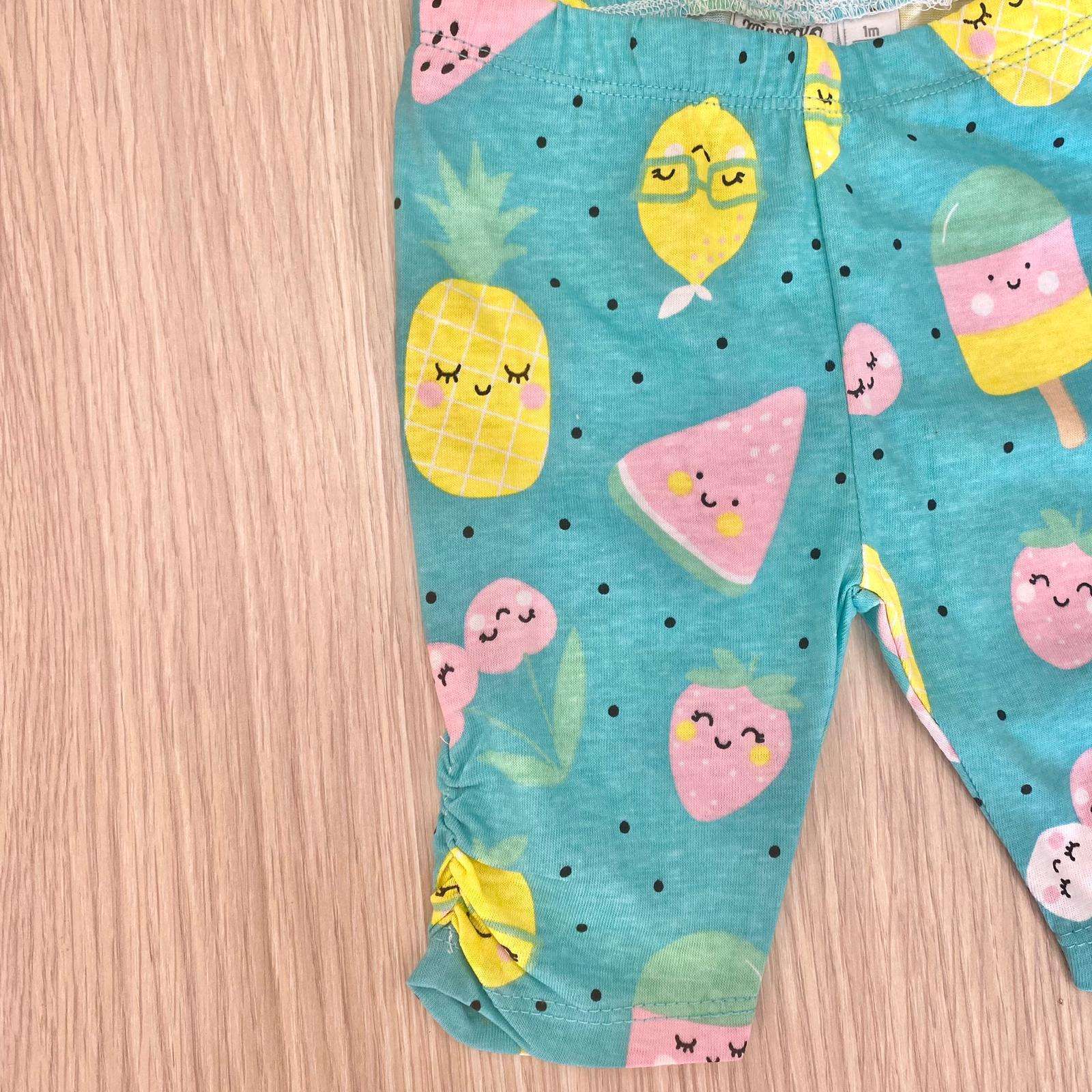 Completino due pezzi neonata/bambina in cotone, di colore giallo e verde marino, con stampa glitterata e disegni di vari colori.