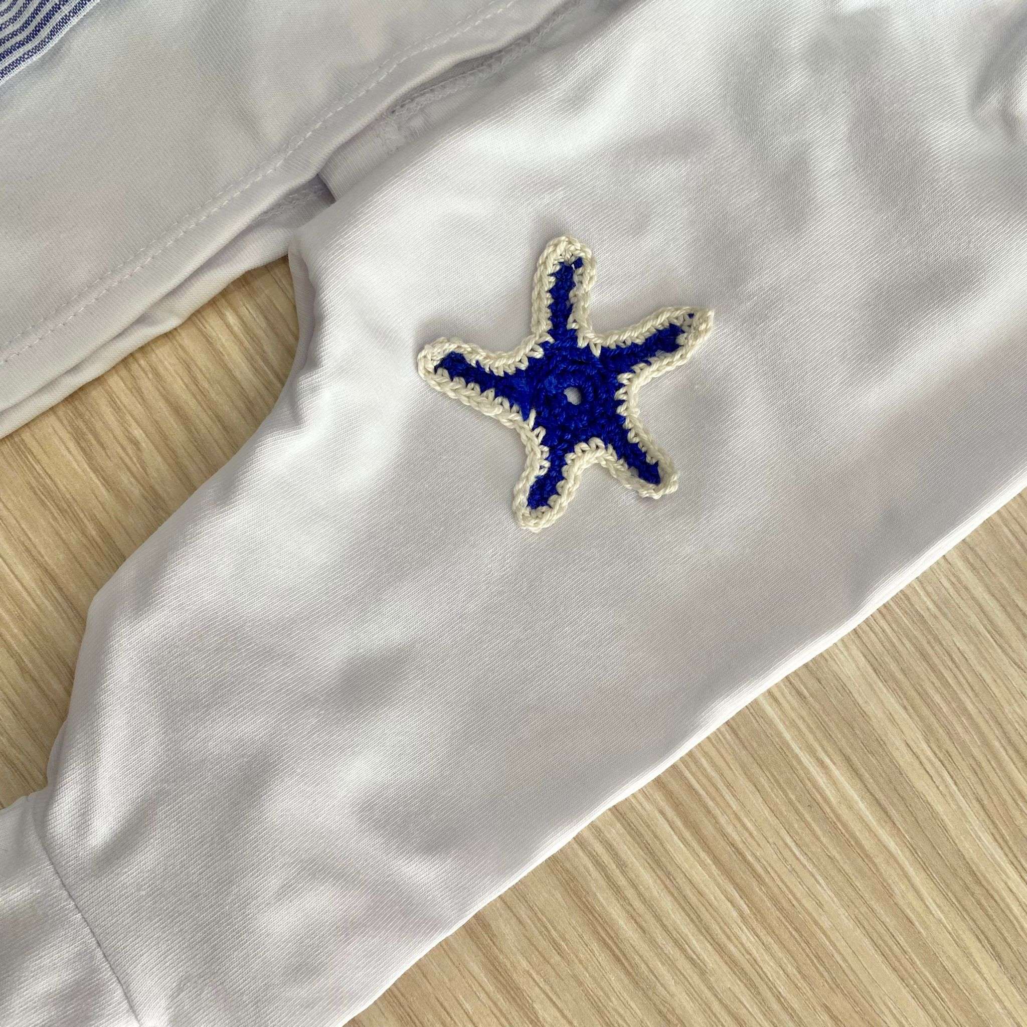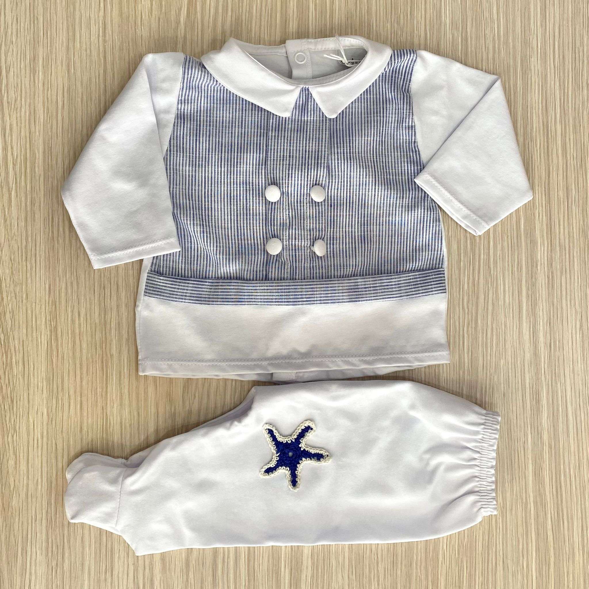 Completino due pezzi neonato in cotone, di colore bianco e blu, con dettaglio di stella marina. Completino con applicazione di bottoncini. 0/1 Mese: 50/56 cm. Tema: TOTO’ Articolo: J 22 4712