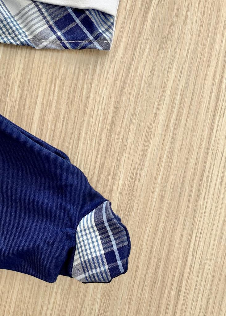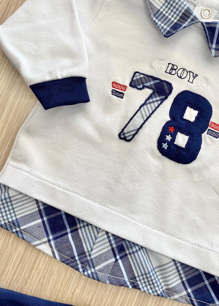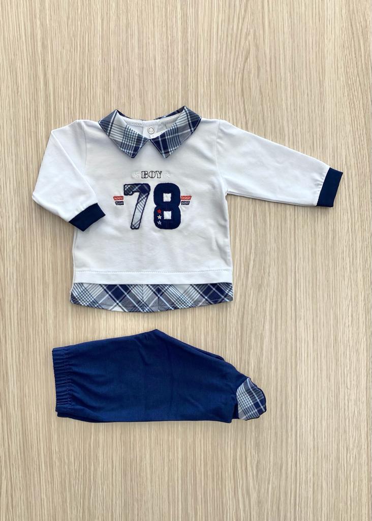Completino due pezzi neonato in cotone anallergico, di colore bianco e blu con applicazione in rilievo. Taglia 0/1 Mese: 50/54 cm. 93% Cotone. 7% Elastomero. Made in Italy.