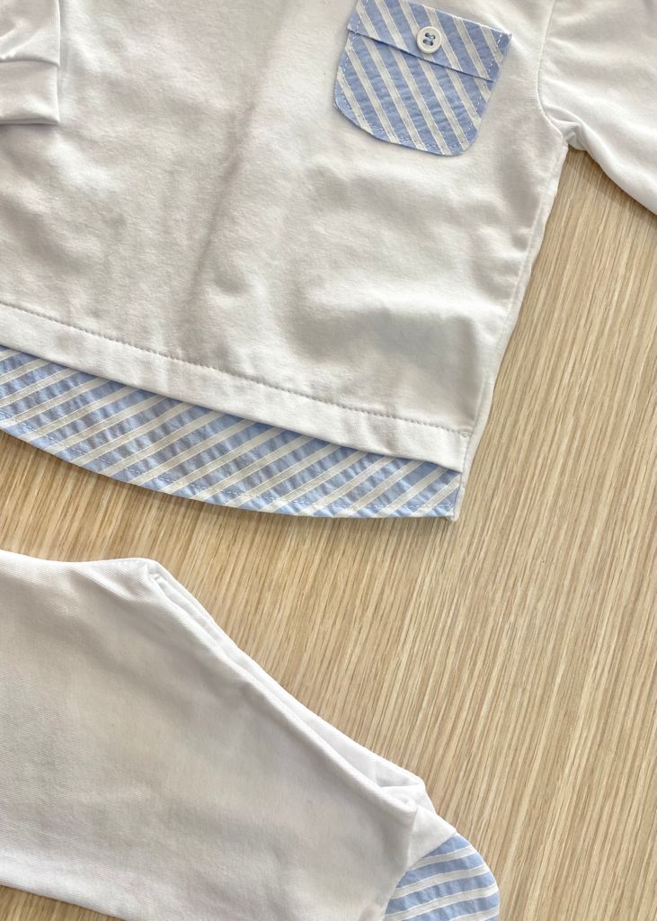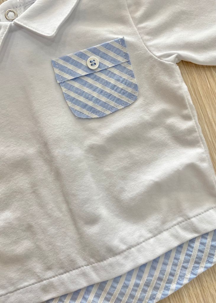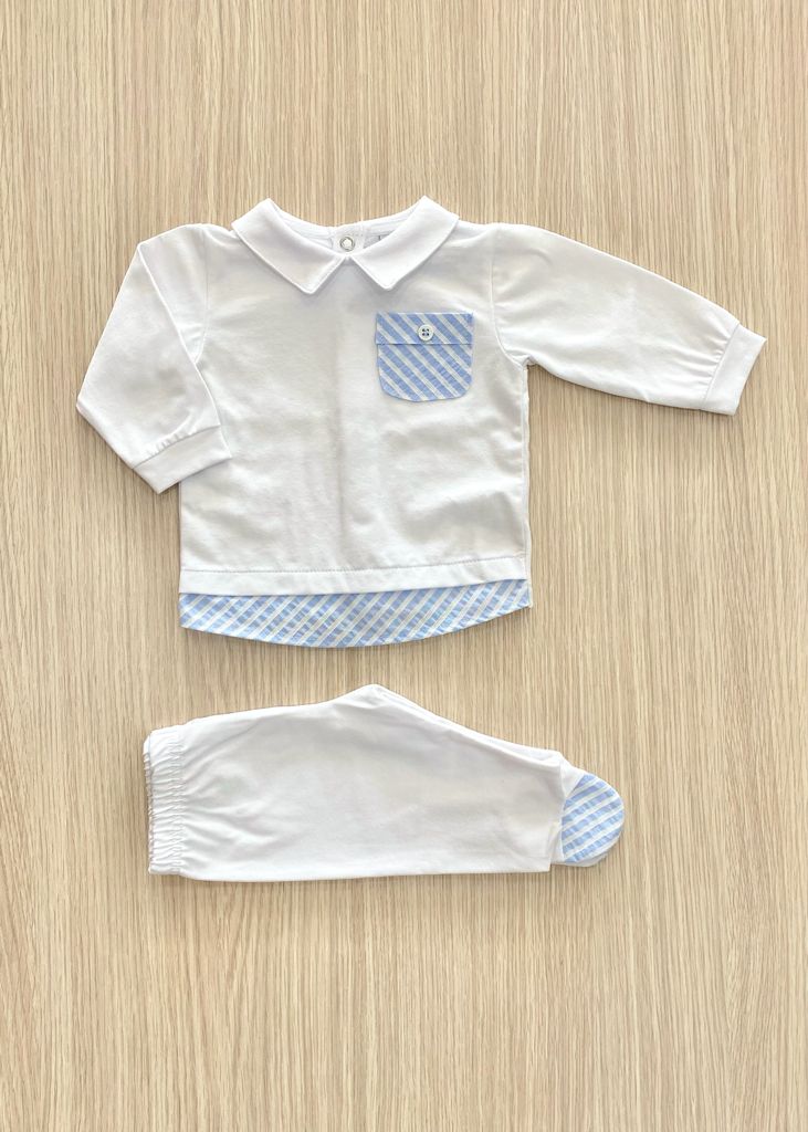 Completino due pezzi neonato in cotone di colore bianco con dettagli di colore azzurro, applicazione di bottoncini. Taglia 0/1 Mese: 50/54 cm. Taglia 1/3 Mesi: 54/60 cm. 93% Cotone. 7% Elastomero. Made in Italy.