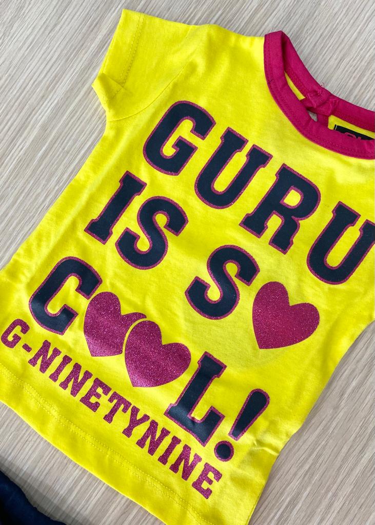 Completino due pezzi neonata/bambina in morbido cotone, di colore giallo e blu con dettagli di stampa glitterata. Completo due pezzi composto da t-shirt e pantaloncino. 100% Cotone.