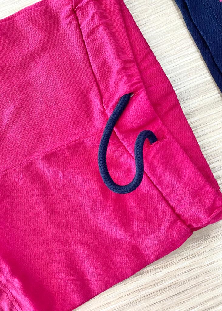 Completino due pezzi neonata/bambina in morbido cotone, di colore fucsia e blu con dettagli di stampa glitterata. Completo due pezzi composto da t-shirt e pantaloncino. 100% Cotone.