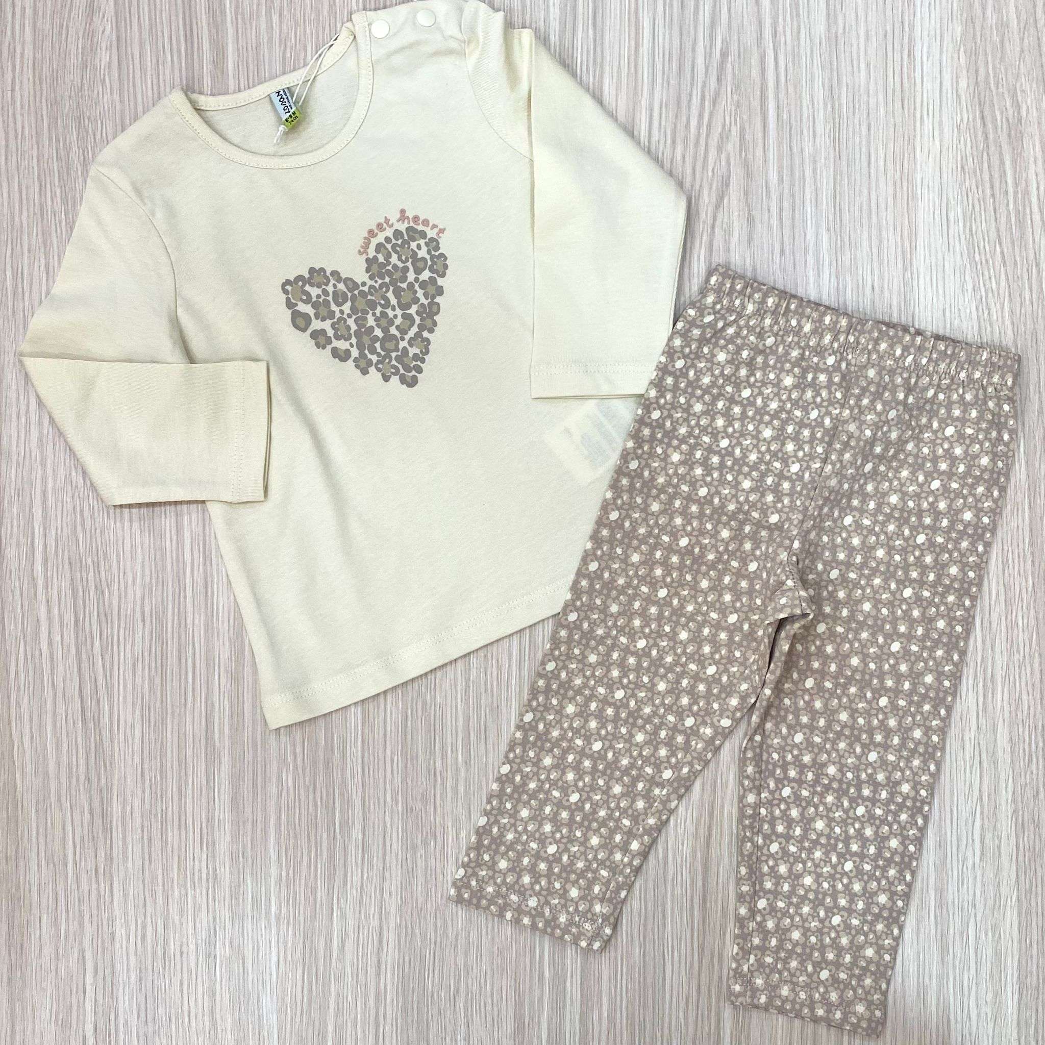 Completino due pezzi neonata/bambina in cotone, di colore beige e tortora, con stampe di disegni. 100% Cotone.