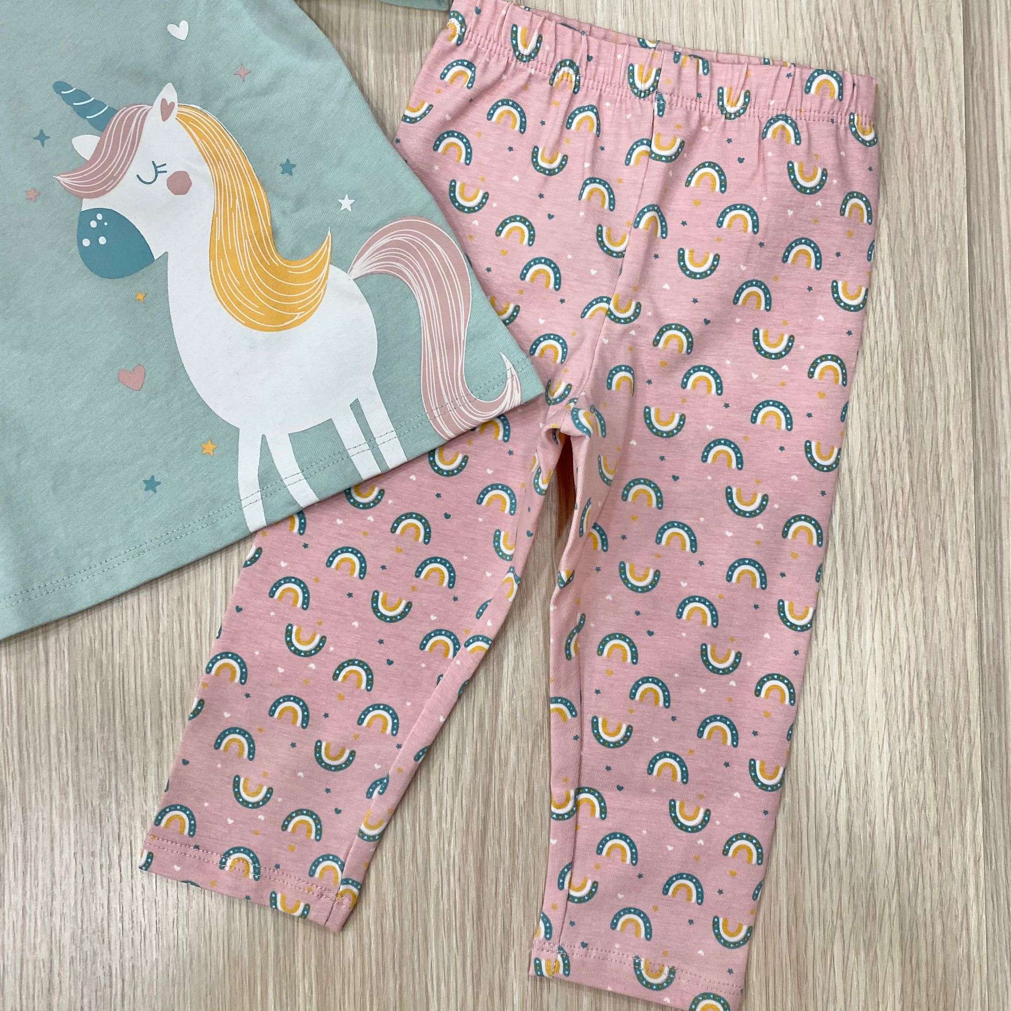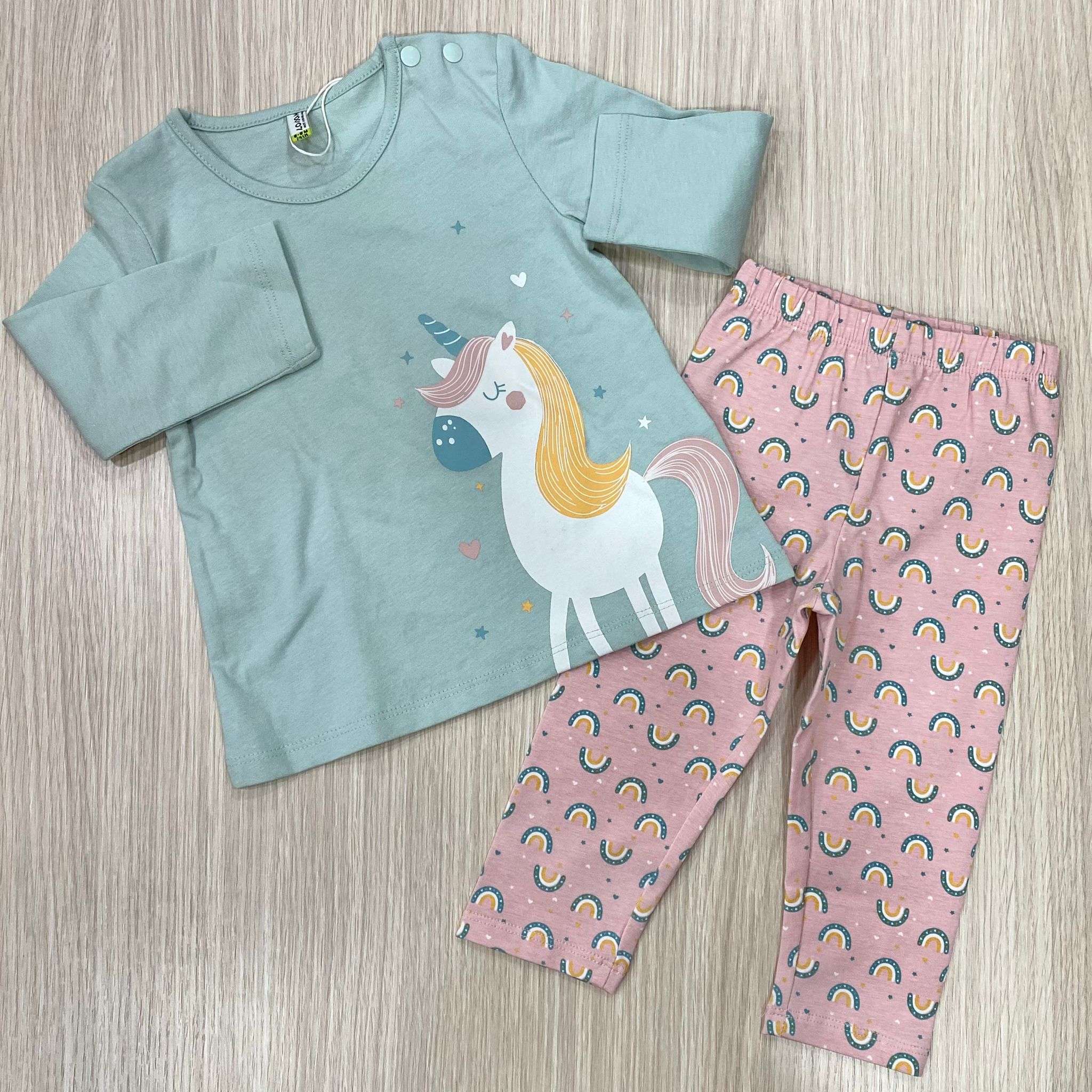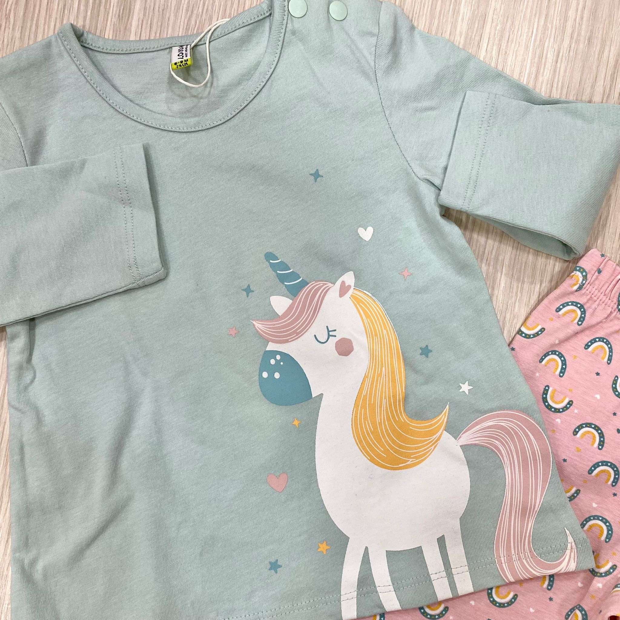 Completino due pezzi neonata/bambina in cotone, di colore verde acqua e rosa, con stampe di disegni di vari colori. 96% Cotone. 4% Elastane.
