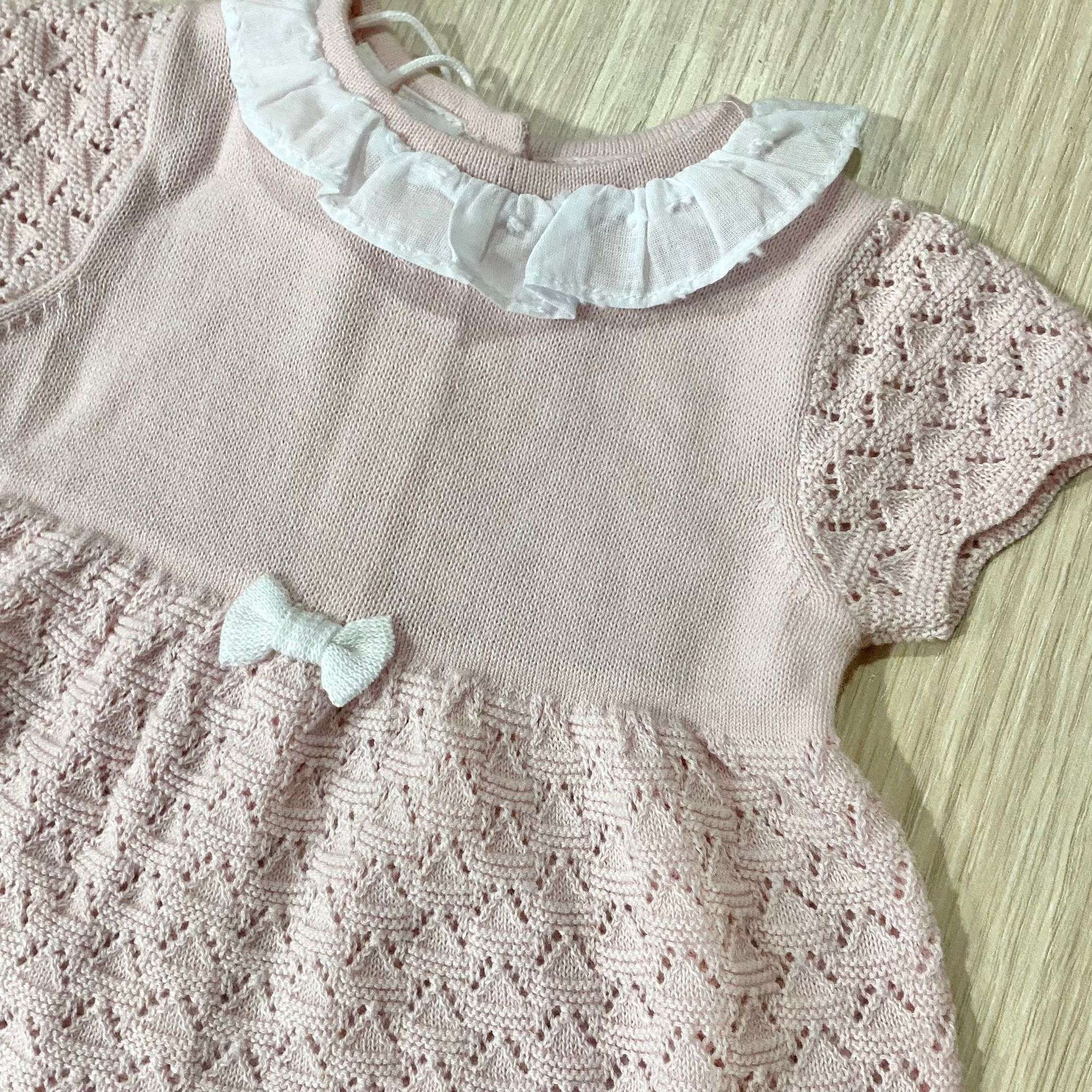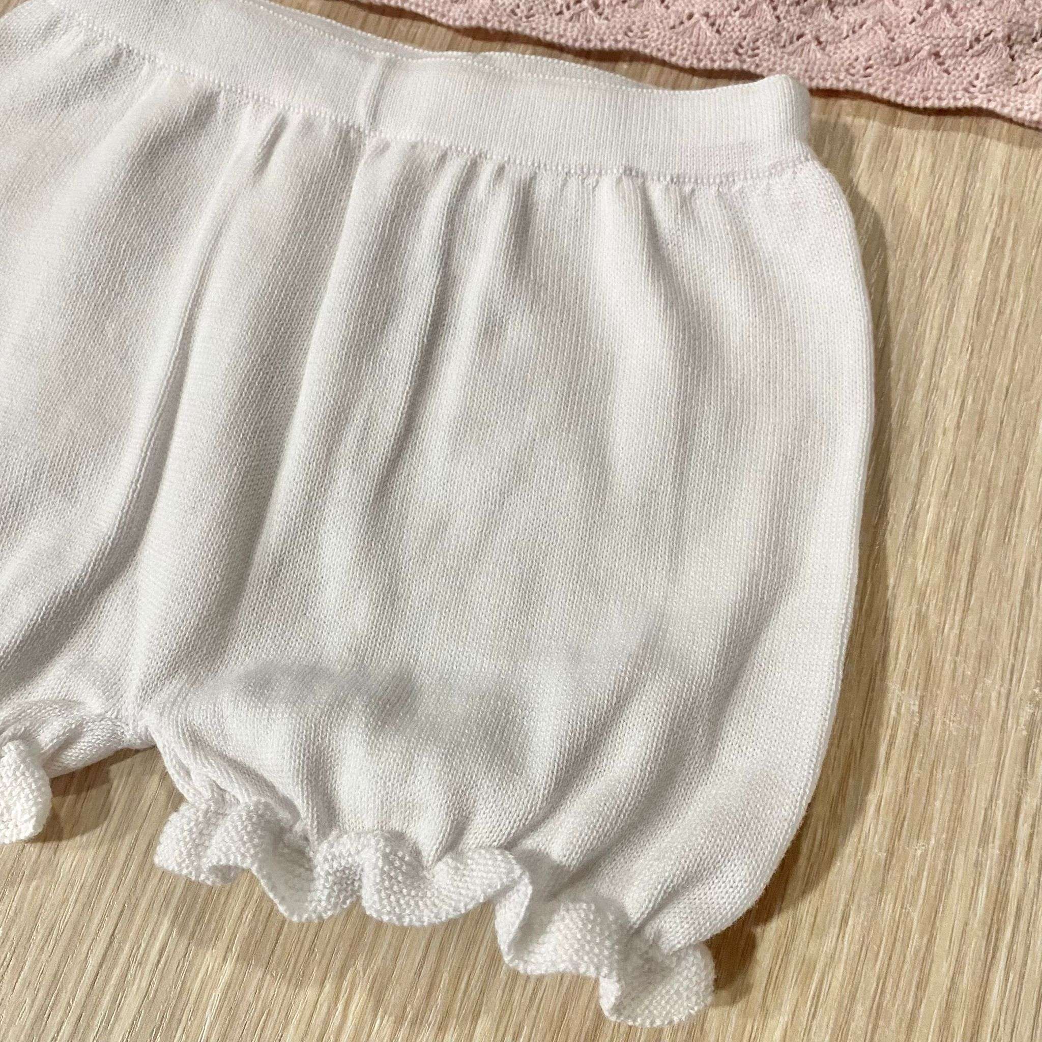 Completino due pezzi neonata in filo, di colore rosa e bianco, con mutandina copripannolino/pantaloncino. 100% Cotone.