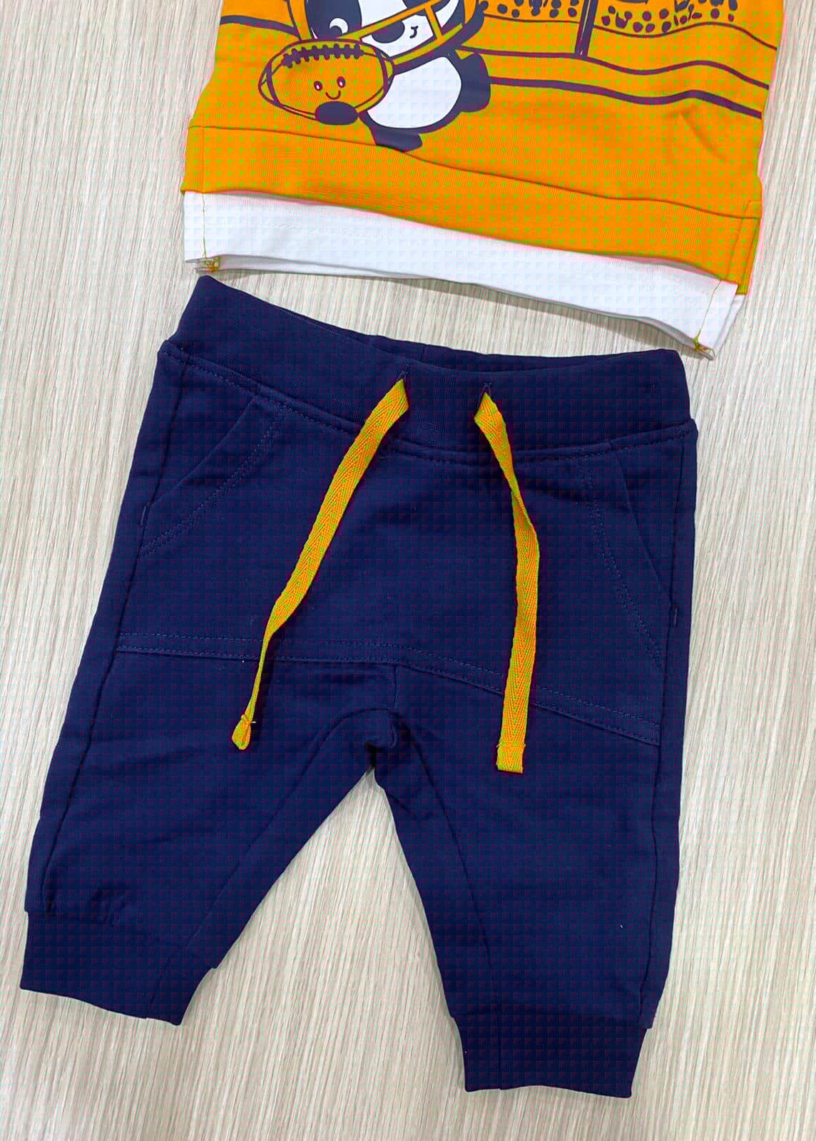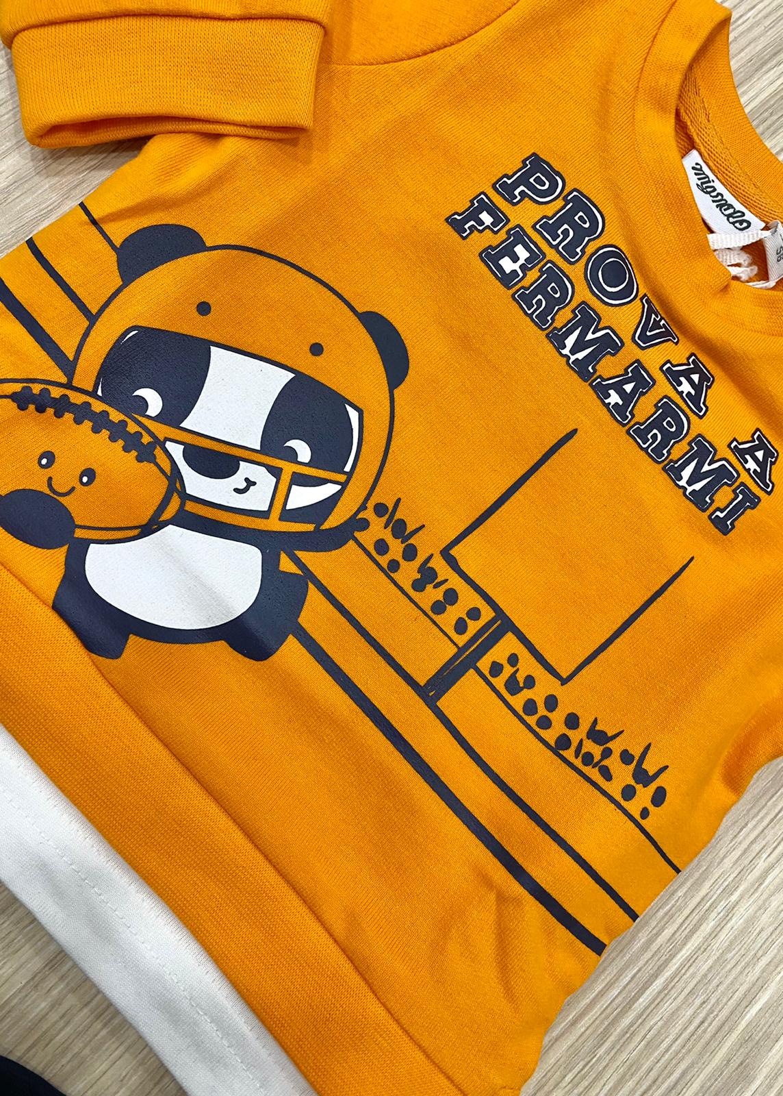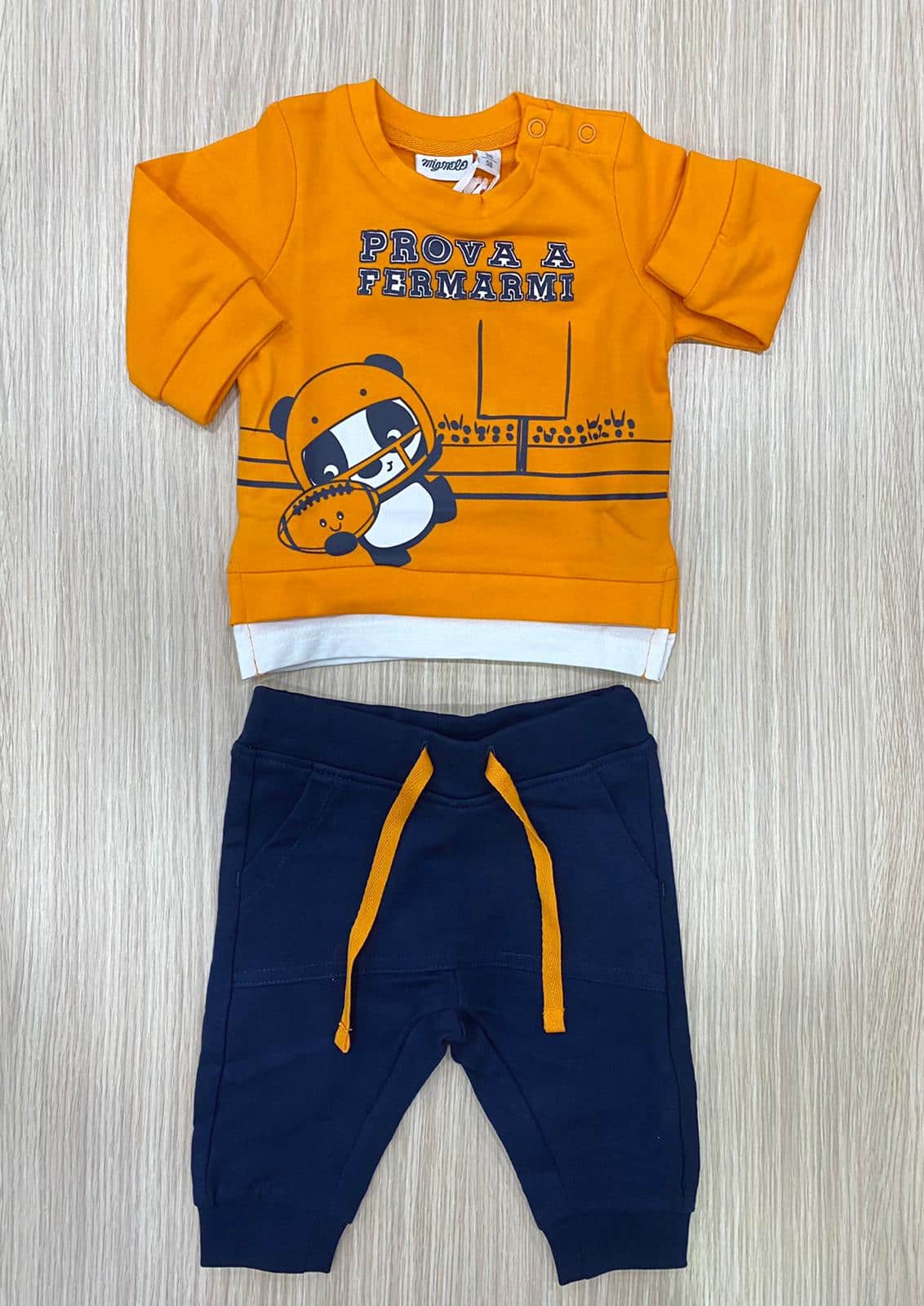 Completino neonato/bambino in cotone garzato, di colore arancione e blu con stampa di colore blu e bianco. Completino due pezzi con polsini. 100% Cotone.