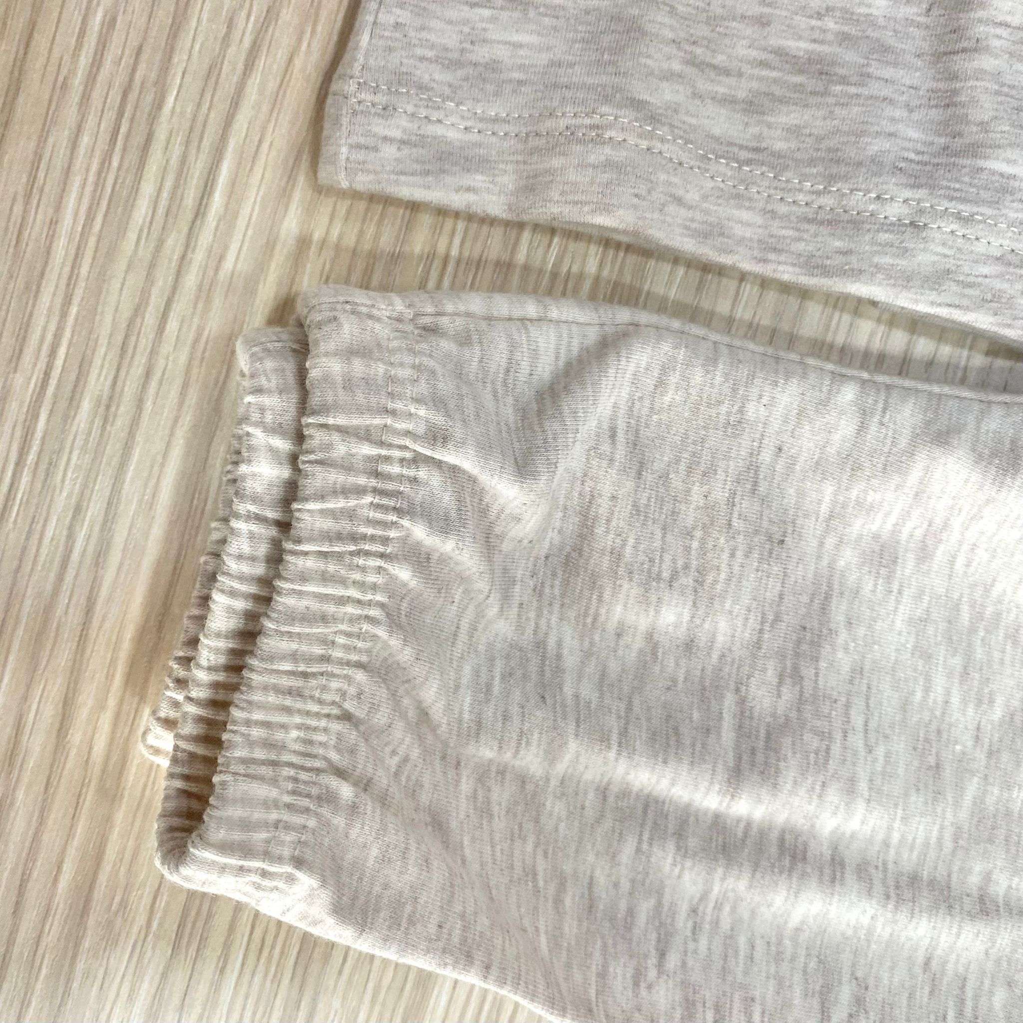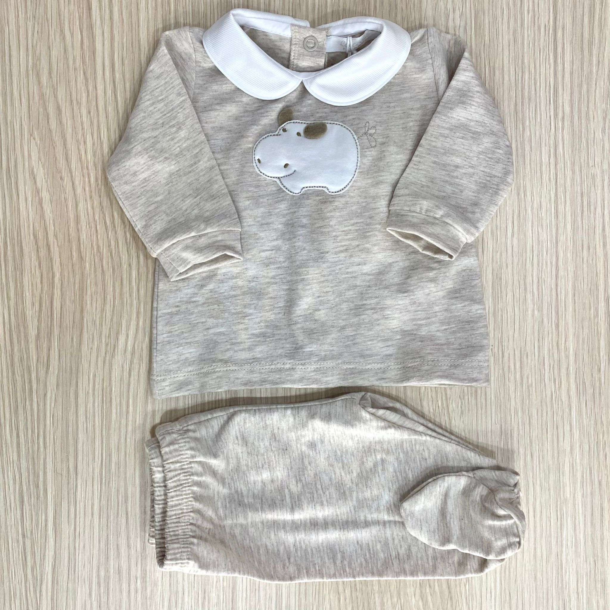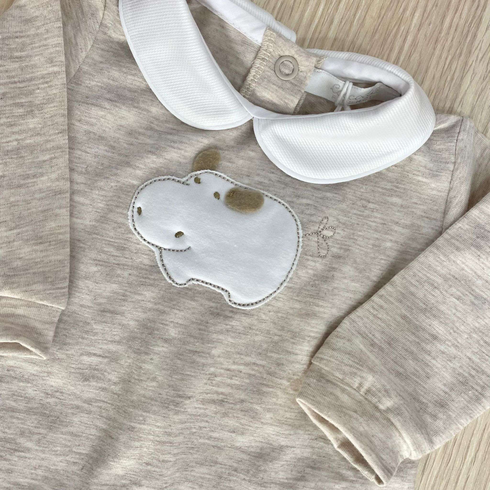 Completino due pezzi neonato in cotone bio, di colore sabbia e bianco, con disegno ricamato in rilievo. 0 Mesi: 50 cm. 1 Mese: 54 cm.