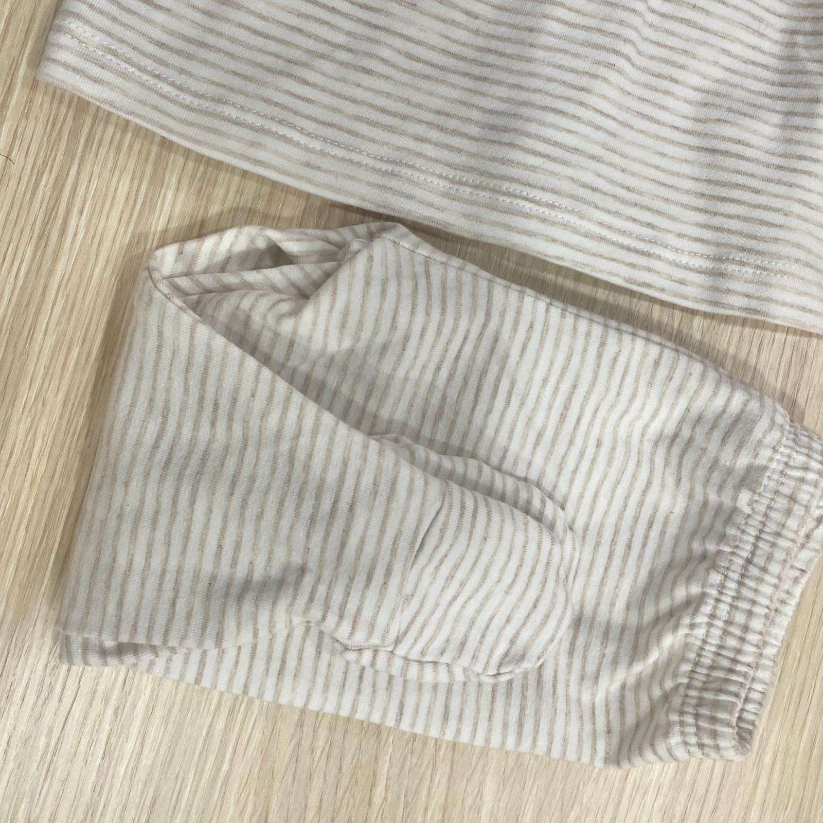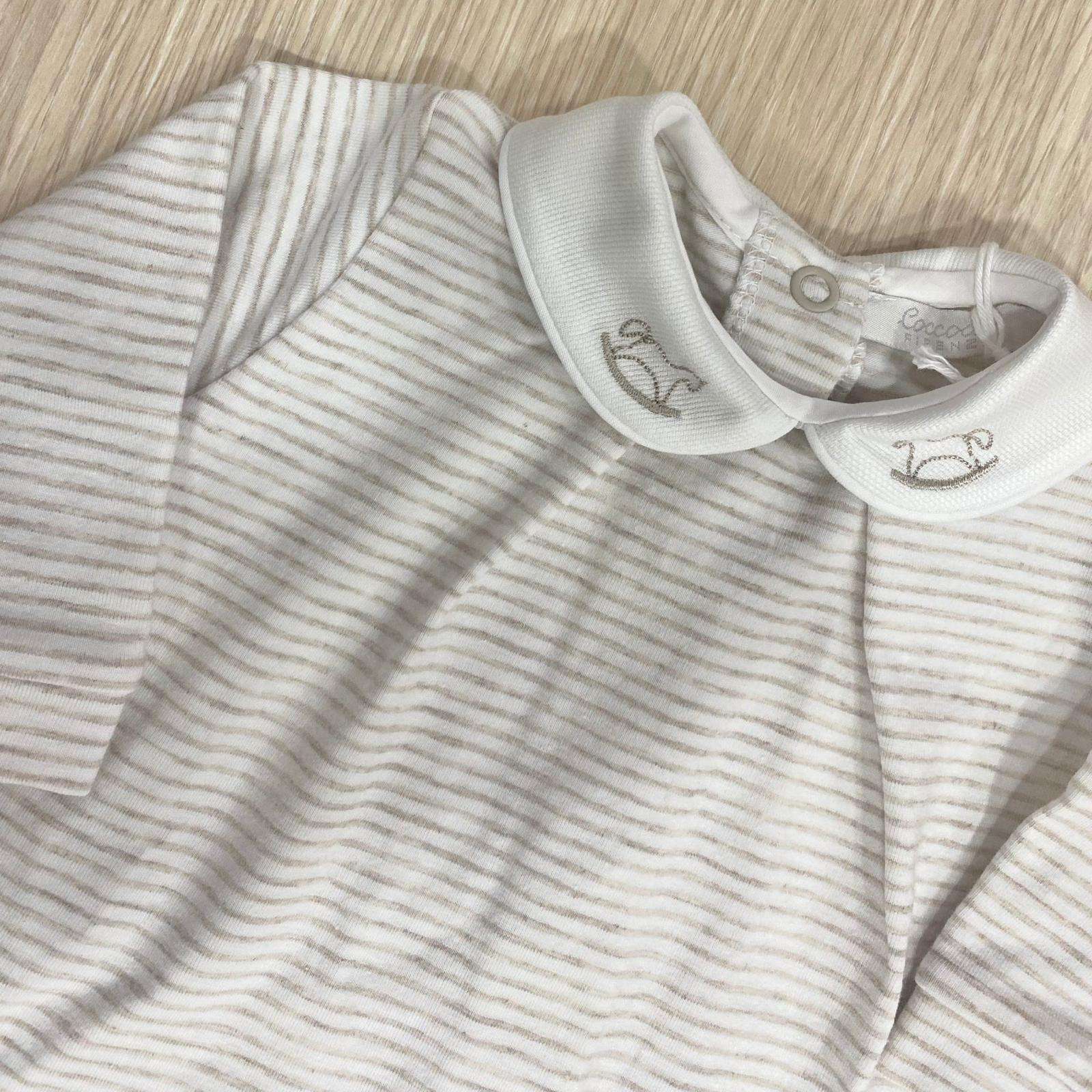 Completino due pezzi neonato in cotone bio, di colore sabbia e bianco, con disegno ricamato sul colletto. 0 Mesi: 50 cm. 1 Mese: 54 cm.