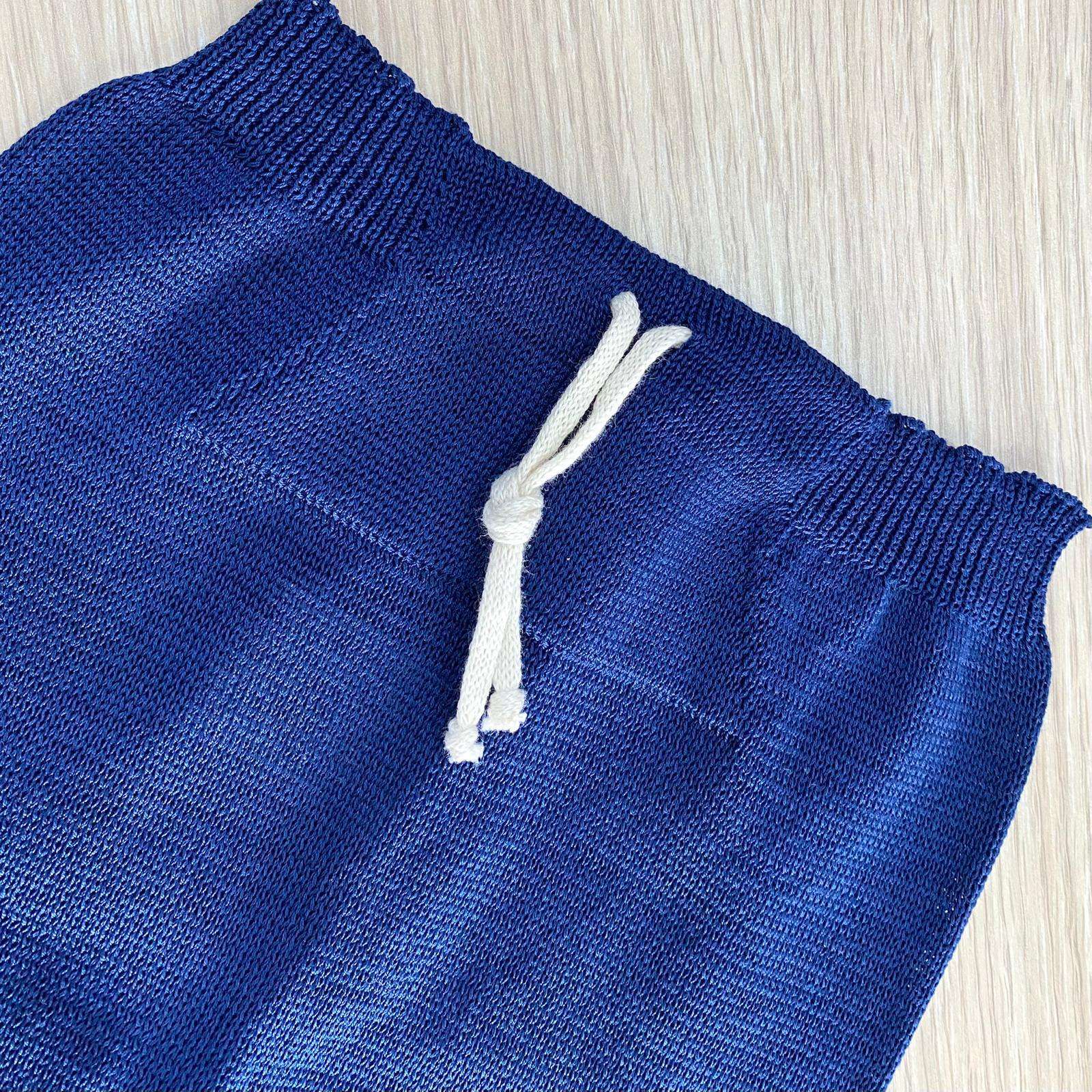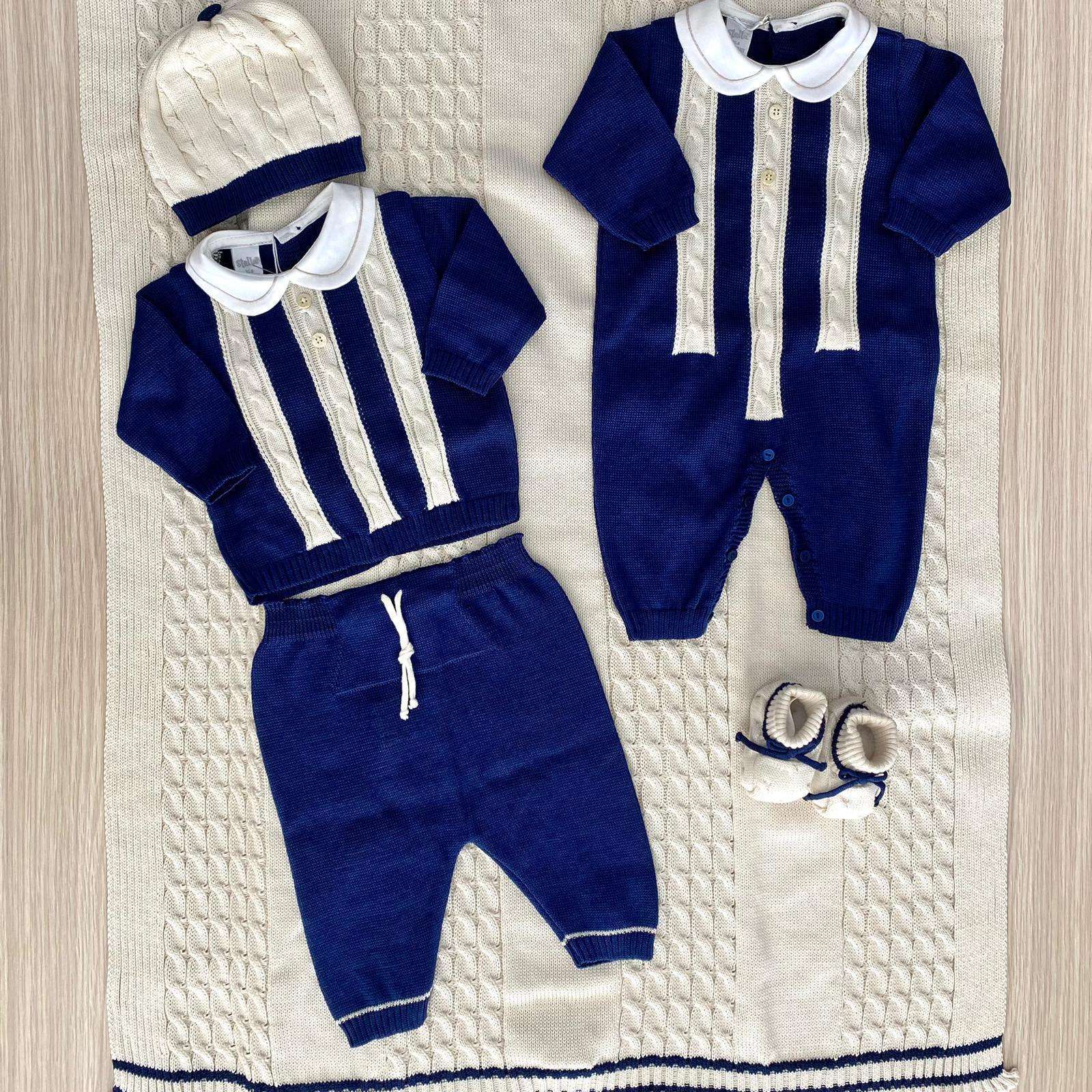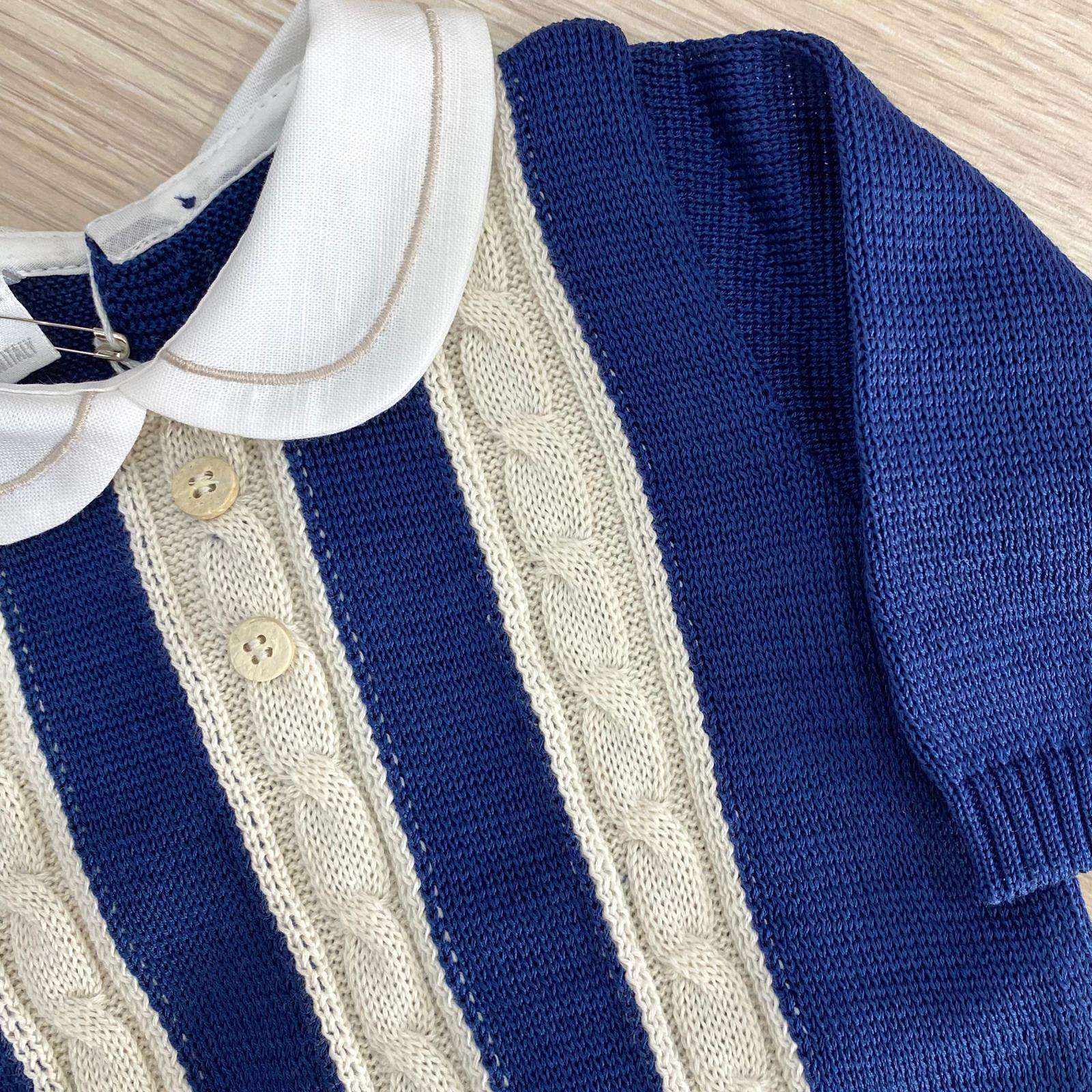 Completino due pezzi neonato in filo, di colore blu e beige, con colletto in cotone di colore panna. Completo con applicazione di bottoncini. 0/3 Mesi: 50/60 cm. 100% Cotone. Made in Italy.