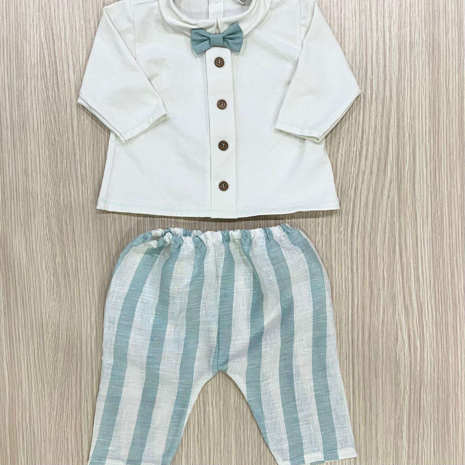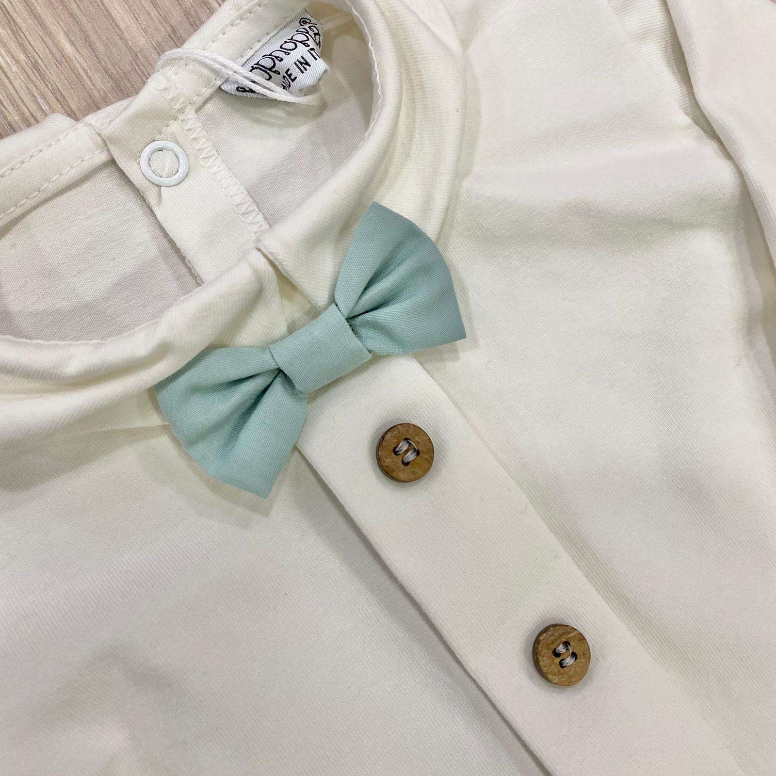 Completino due pezzi neonato in cotone, di colore panna e turchese, con applicazione di bottoncini e finto papillon. Pantalone in lino di cotone. 1/3 Mesi: 56/62 cm. Tema: ILARIO Articolo: J 23 6712