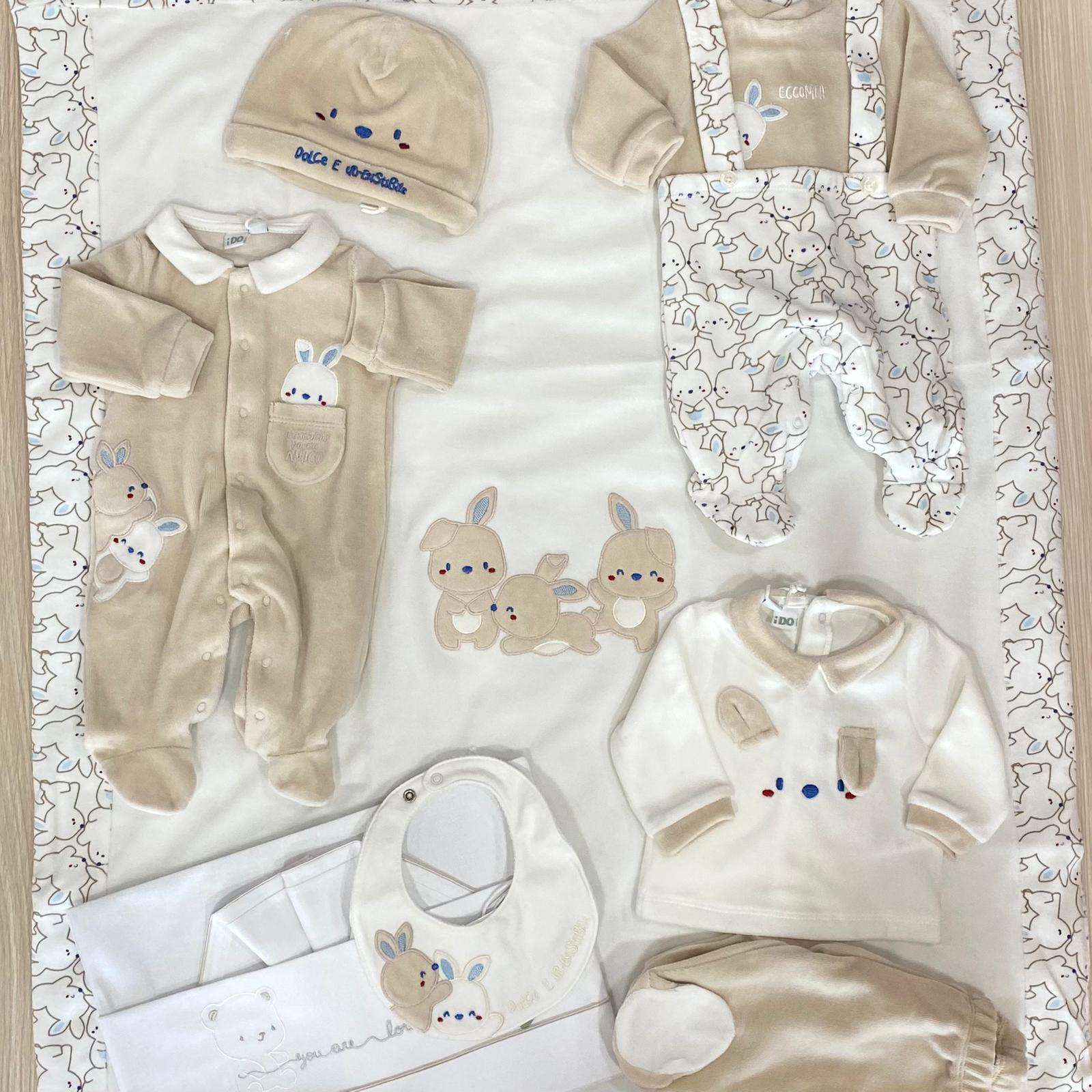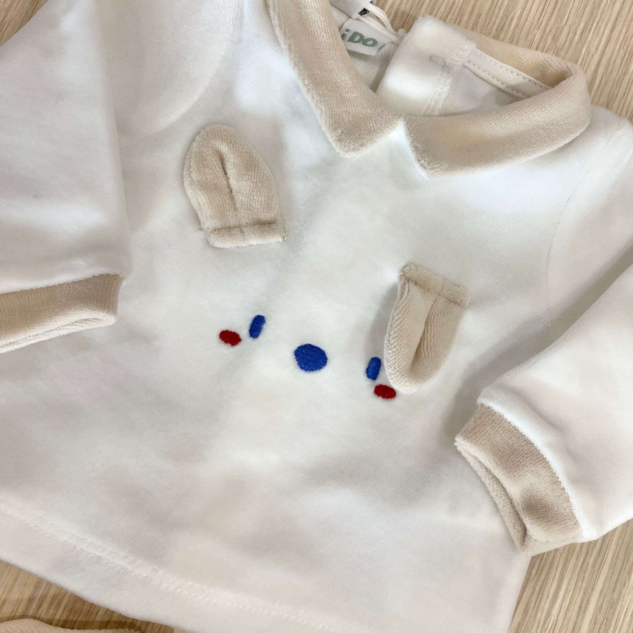 Completino due pezzi neonato in ciniglia, di colore beige e panna, con disegno ricamato e dettaglio in rilievo. 80% Cotone. 20% Poliestere.
