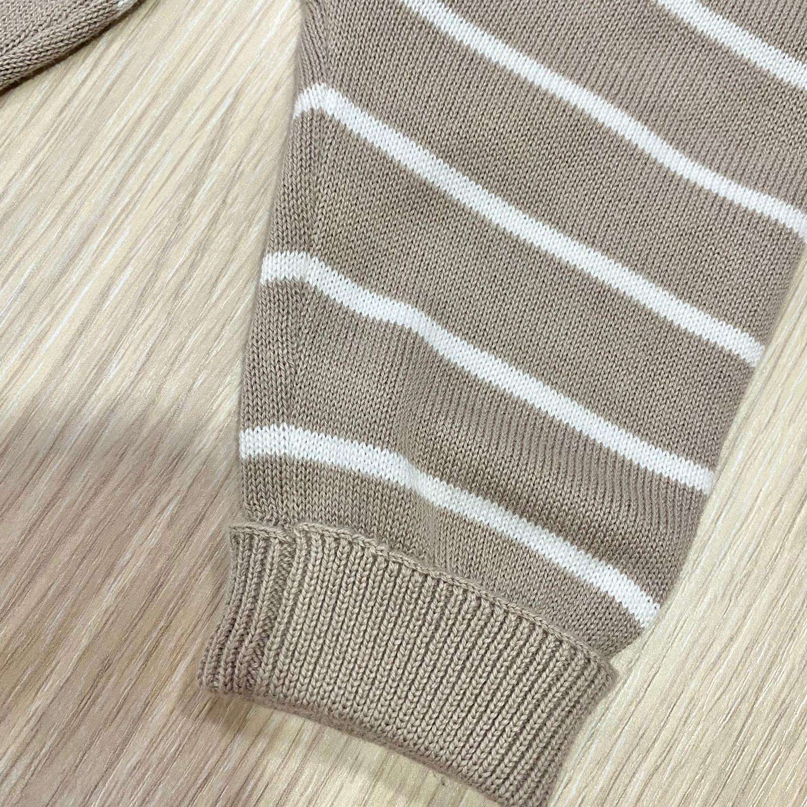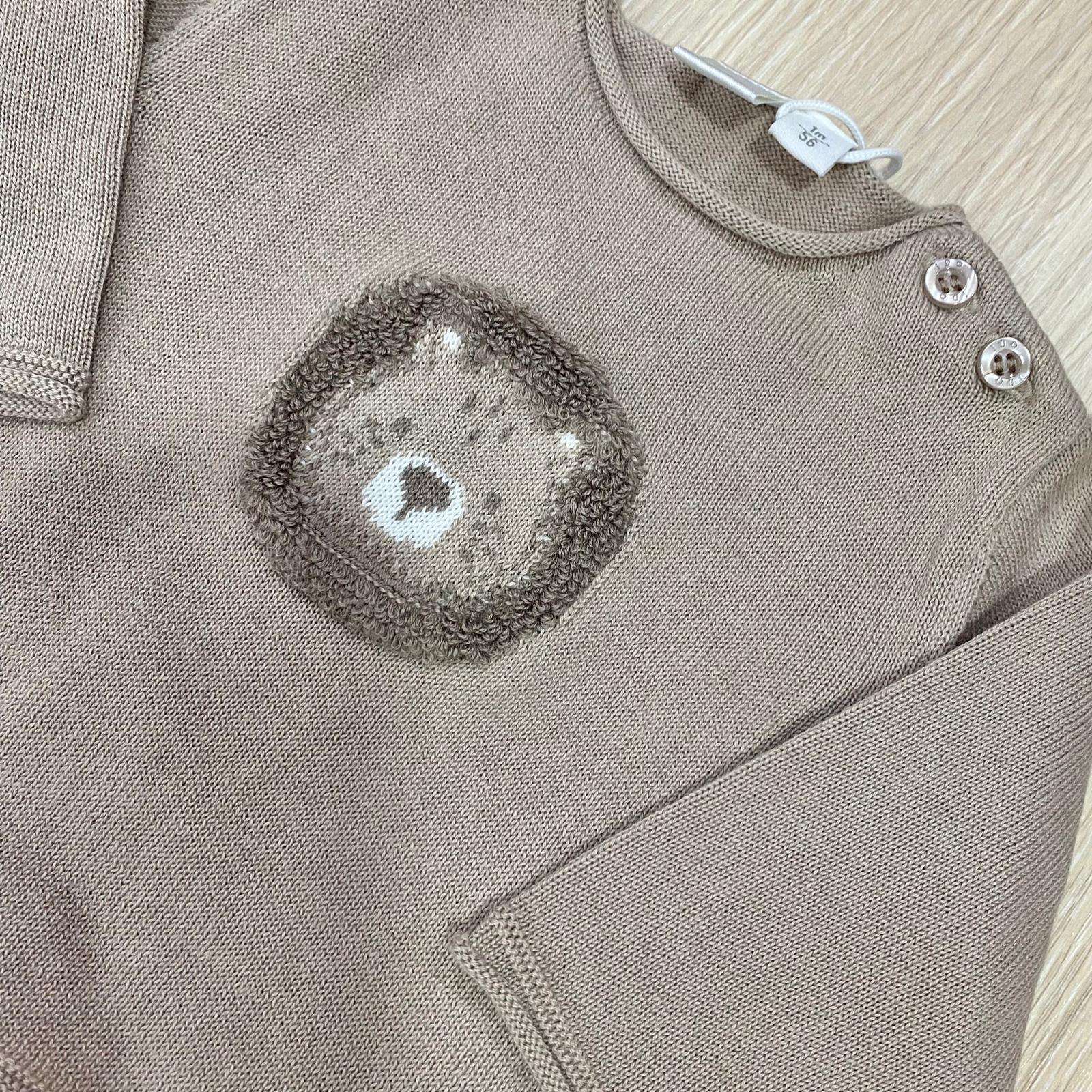 Completo due pezzi neonato in filo, di colore beige e panna, con disegno in rilievo. Completo con bottoncini. 100% Cotone.