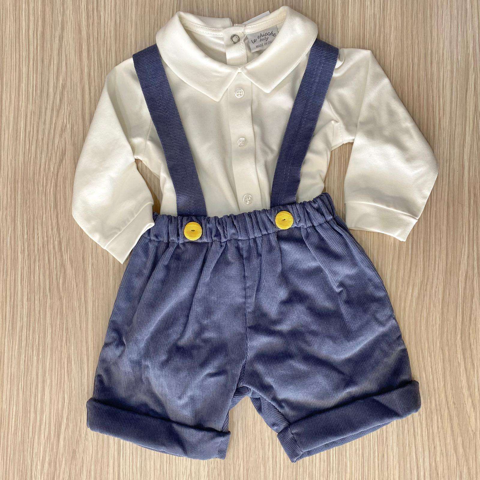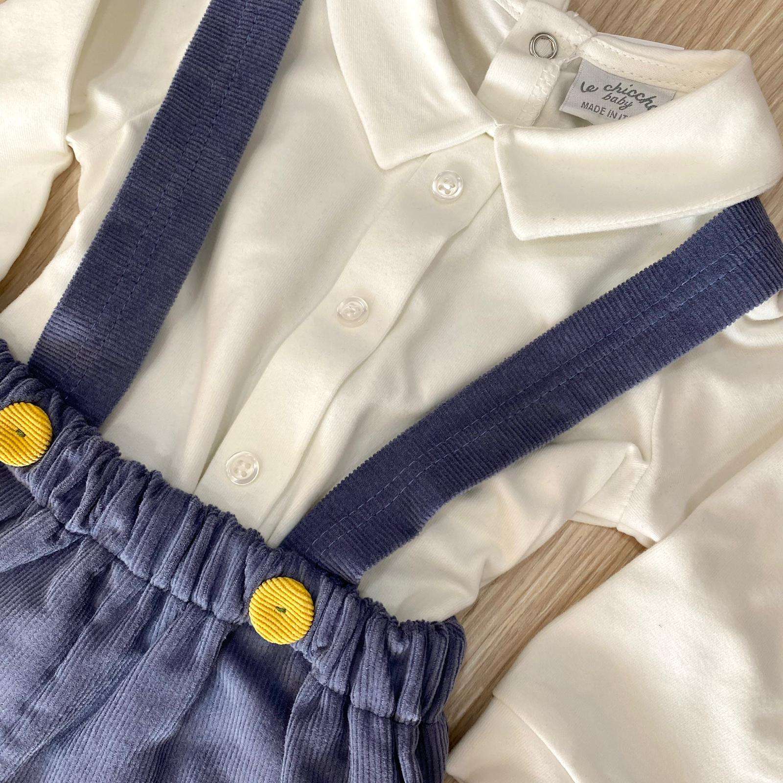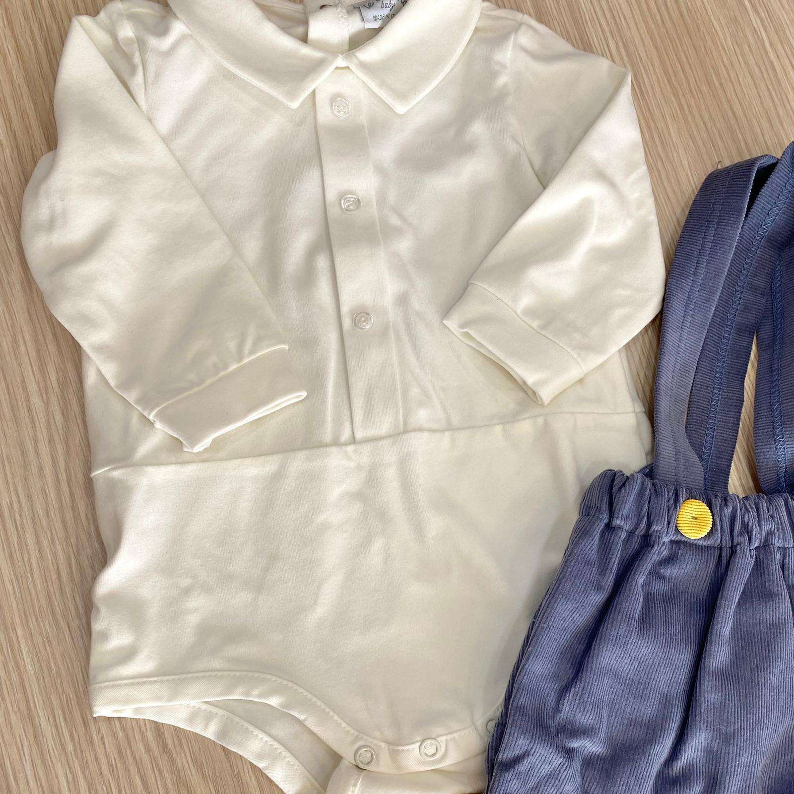 Salopette due pezzi neonato/bambino, di colore panna e jeans. Body in caldo cotone felpato. Salopette in velluto. Made in Italy.