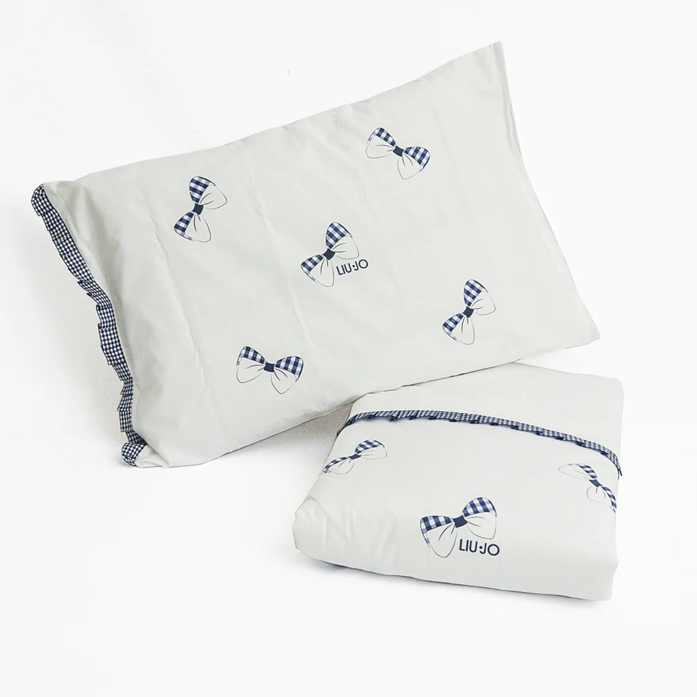 Set Culla ( Passeggino) 4 pezzi Lenzuolo sotto con angoli Sacco copripiumino con stampa fiocchi 70 x 95 cm Piumino interno Federa 45 x 30 cm Made in Italy