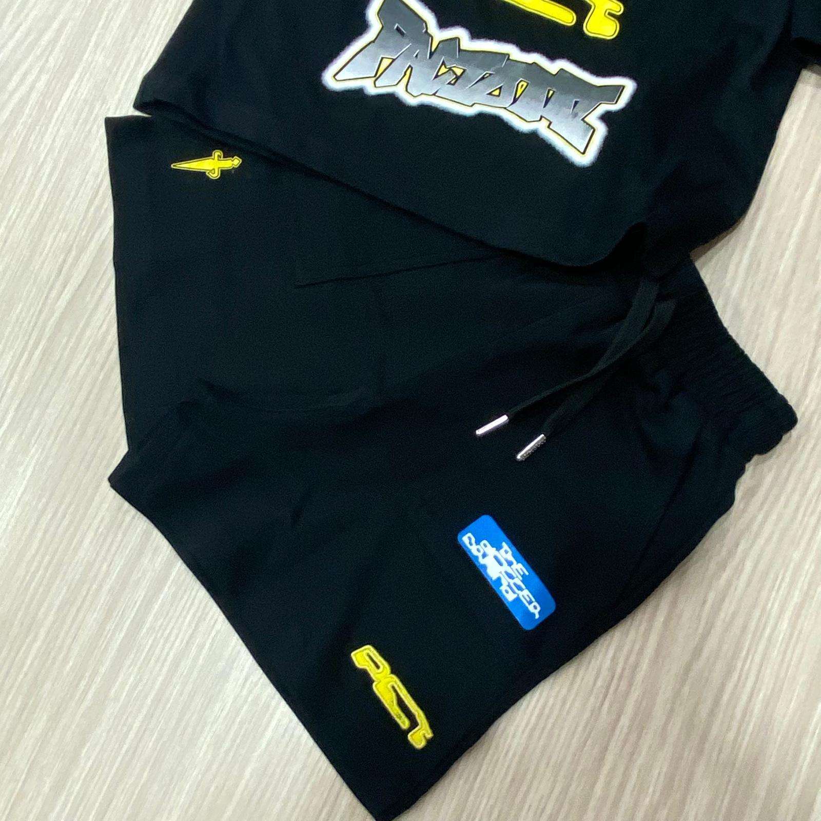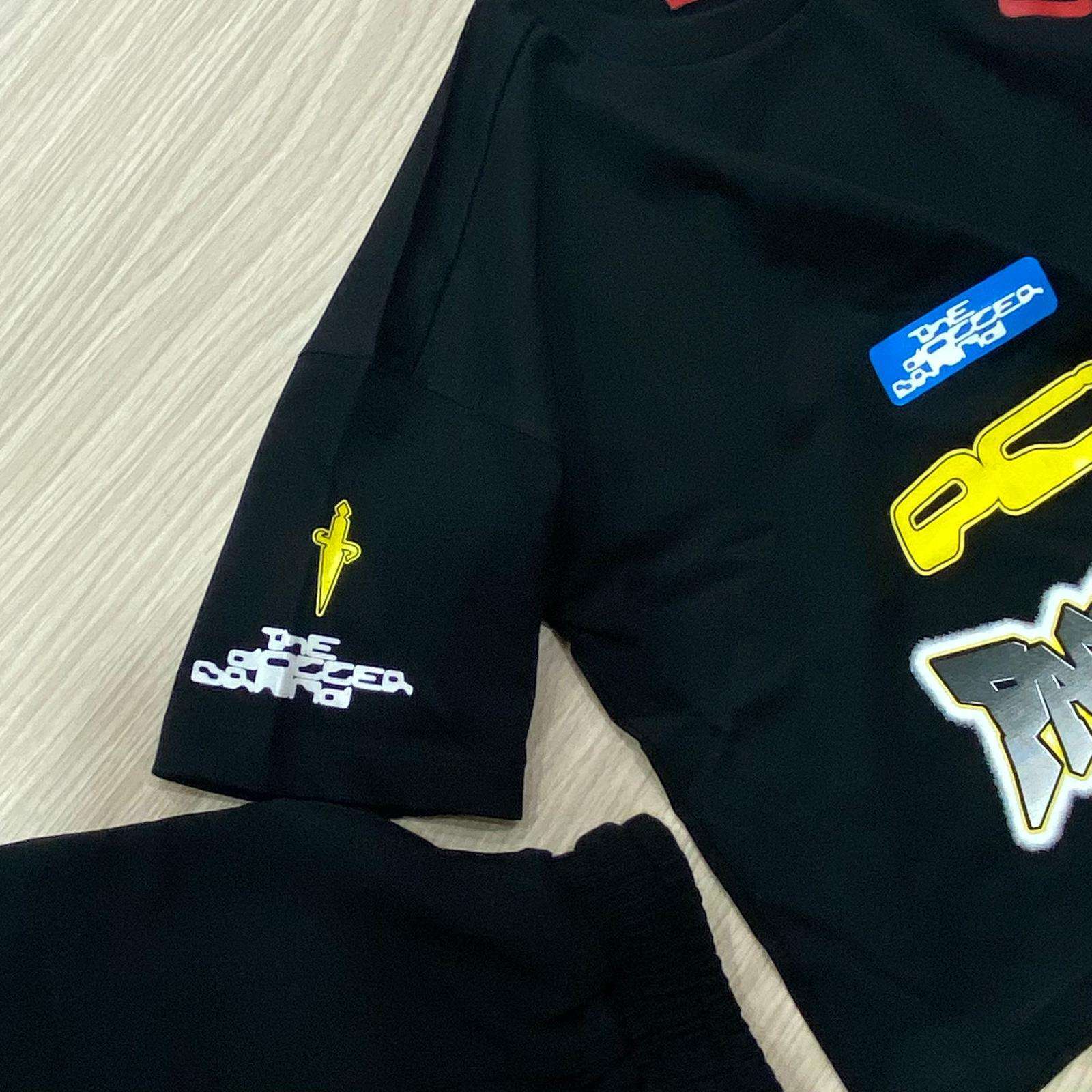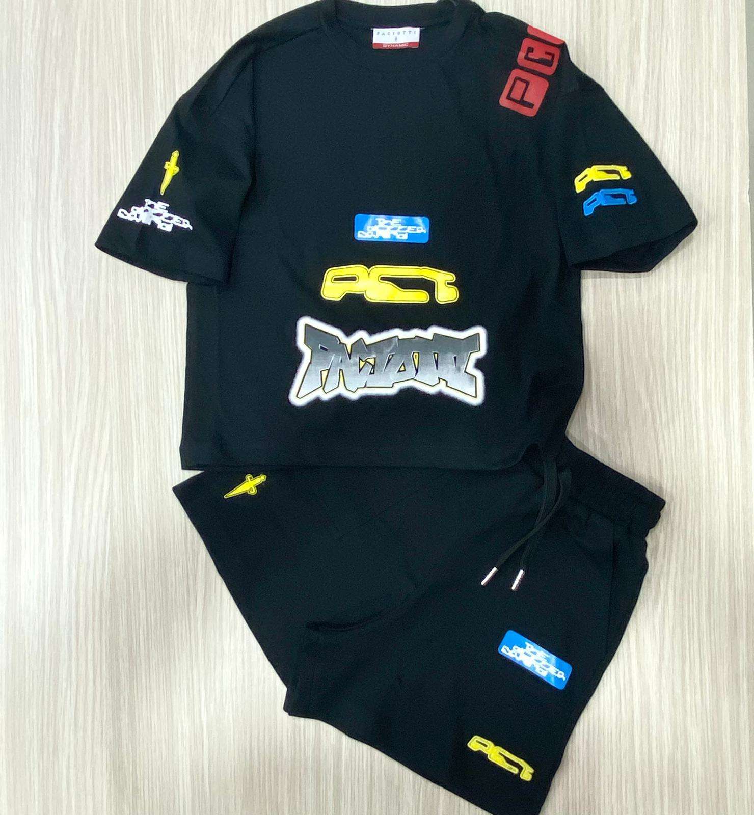 Completo due pezzi firmato Paciotti realizzato in cotone, pensato per chi ama uno stile urbano deciso senza rinunciare alla comodità. Il set è composto da t-shirt a manica corta e pantaloncino coordinato, entrambi in tonalità nera con applicazioni grafiche colorate che donano carattere e personalità al look. La t-shirt presenta un design ricco di dettagli: patch e stampe multicolor distribuite su fronte e maniche, con lettering a contrasto che richiama lo stile streetwear contemporaneo. Il pantalone è dotato di vita elasticizzata con coulisse regolabile per una vestibilità perfetta e massima praticità. Le tasche laterali aumentano la funzionalità, mentre le applicazioni…