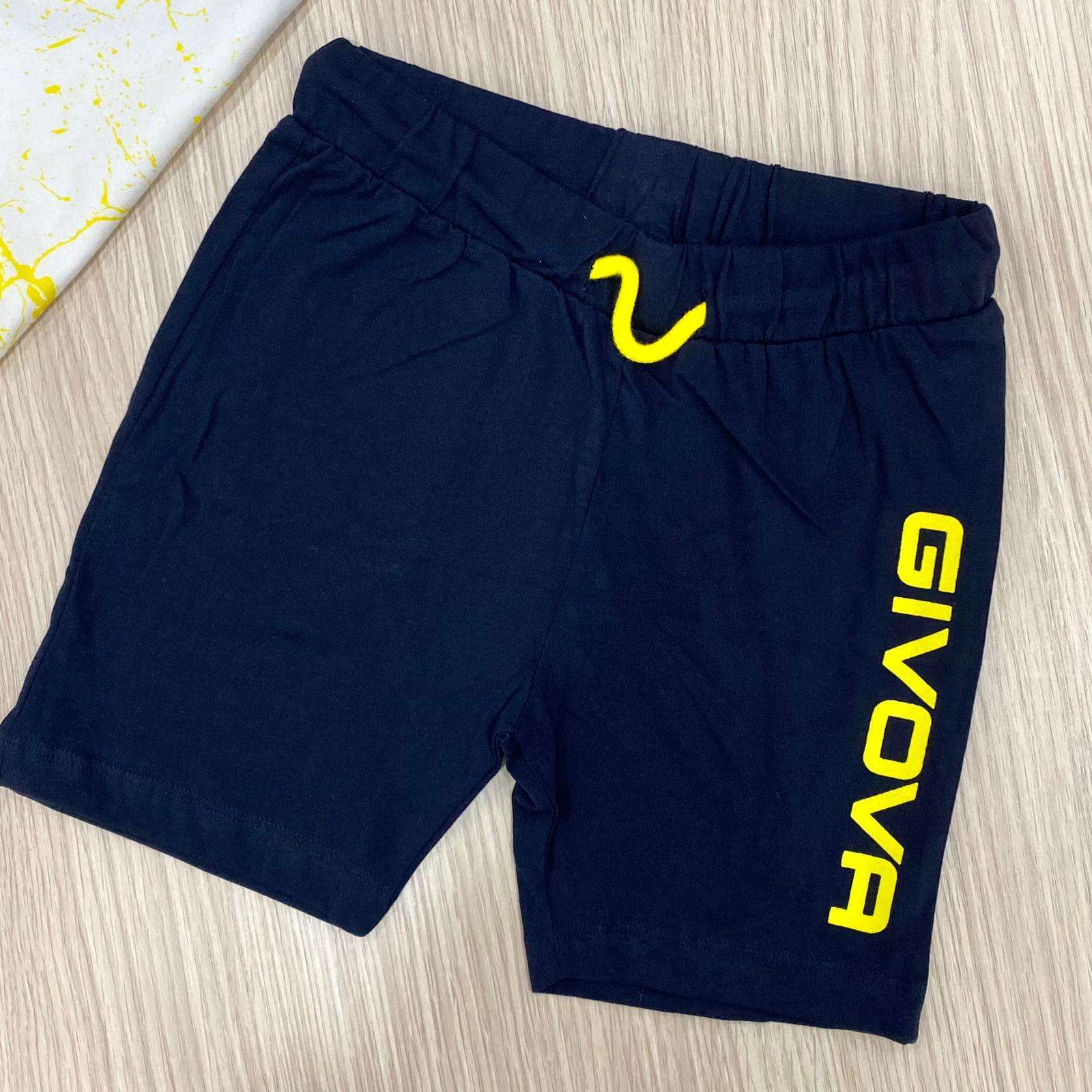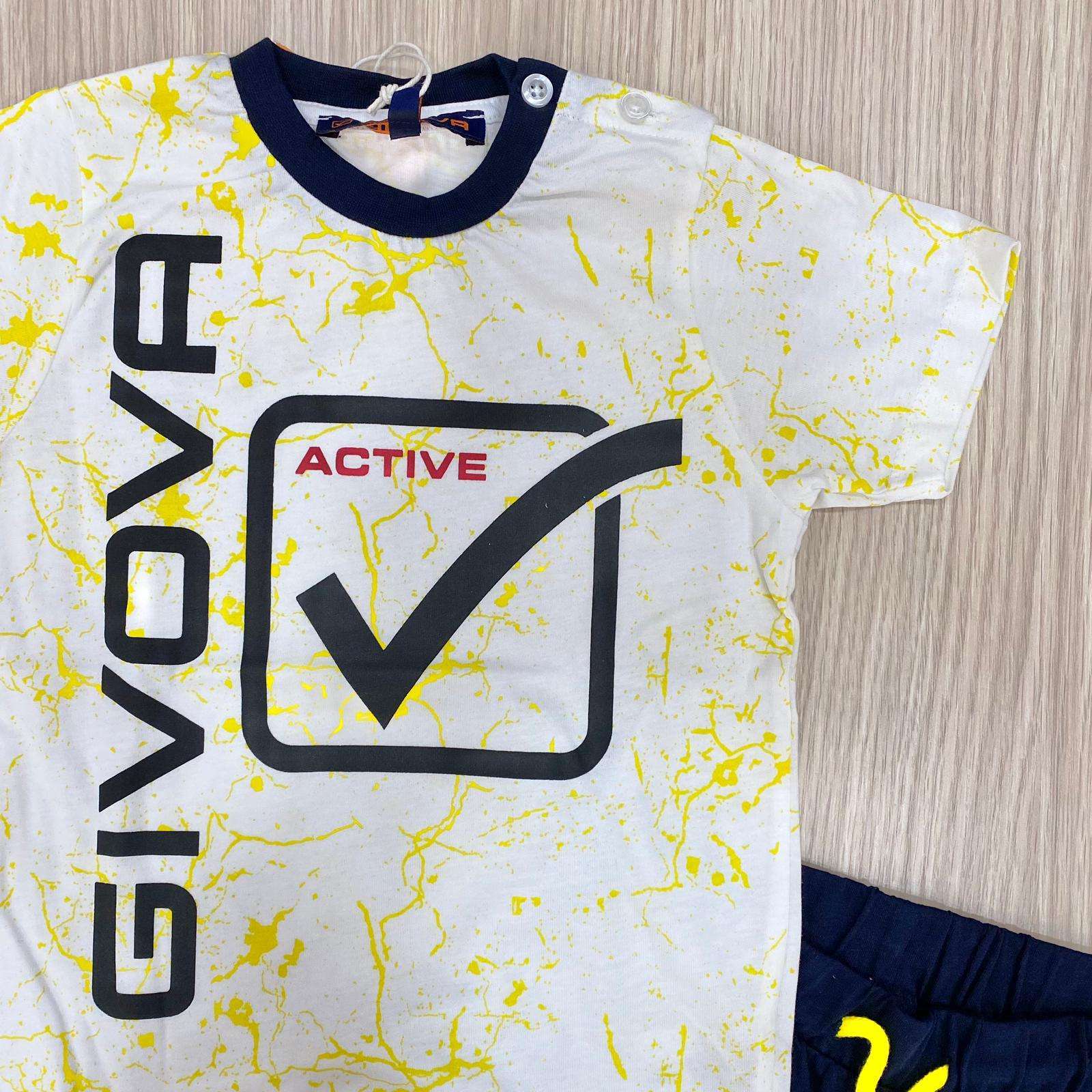 Completo due pezzi bambino in cotone, di colore bianco e blu, con stampa di vari colori. Completo due pezzi composto da t-shirt e pantaloncino. 100% Cotone.