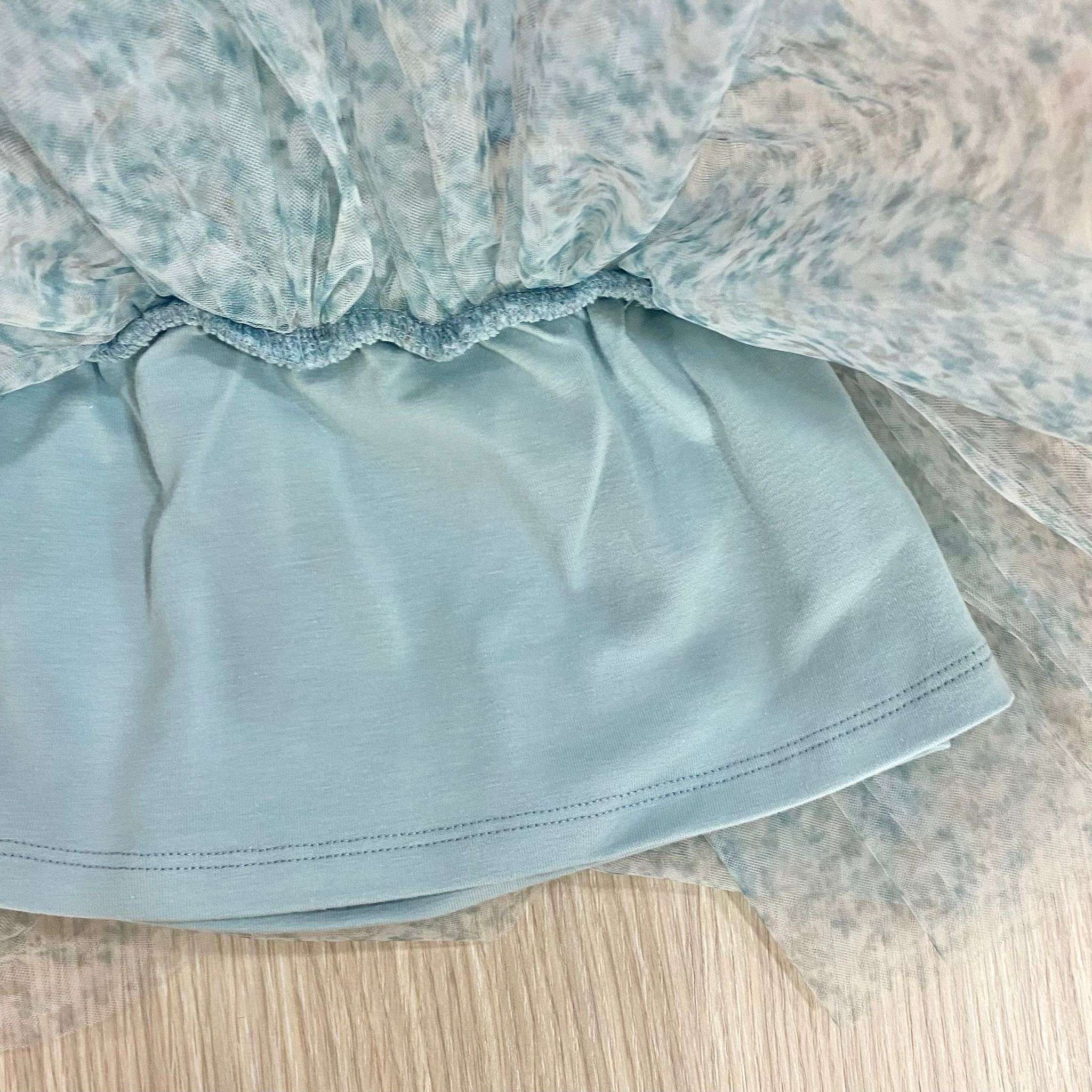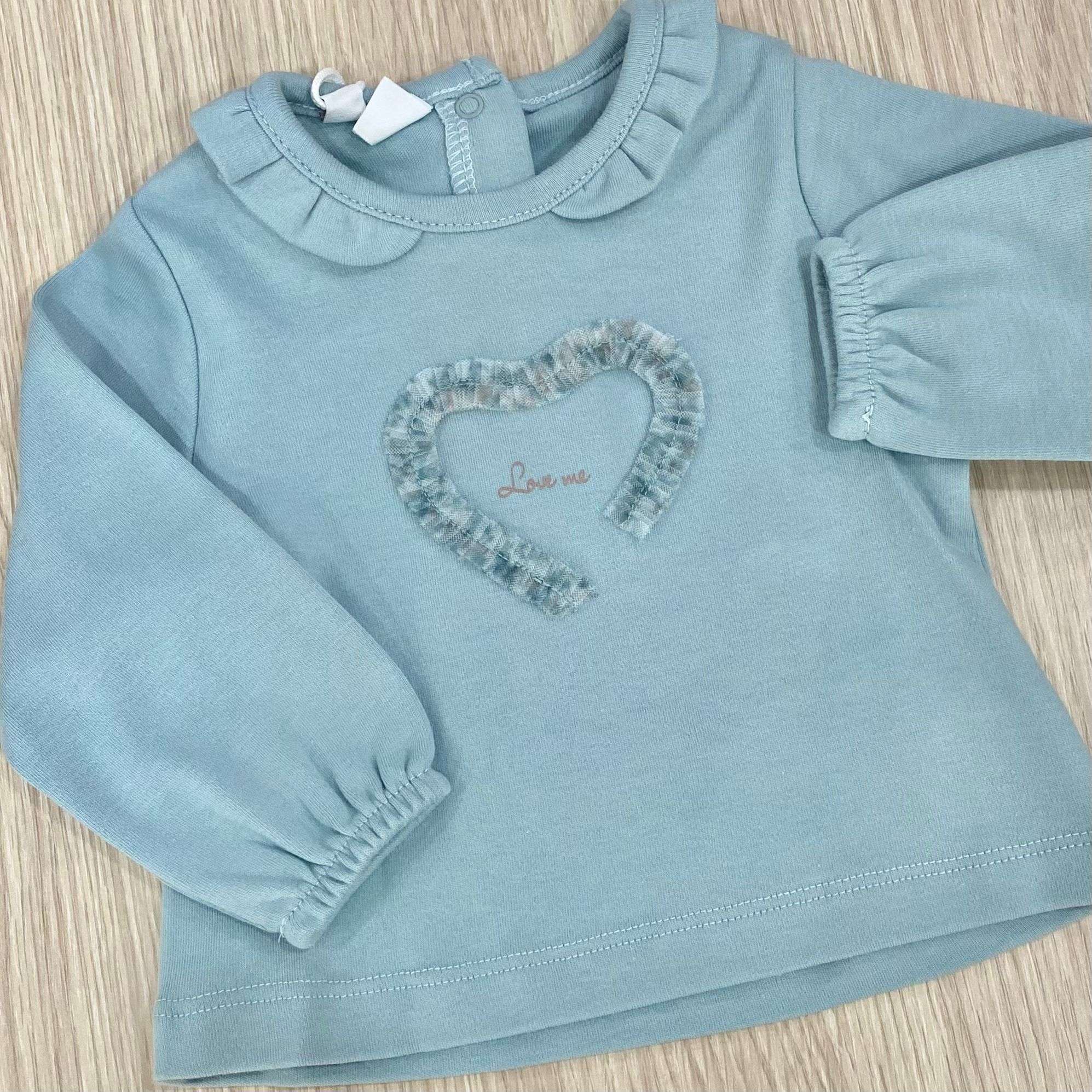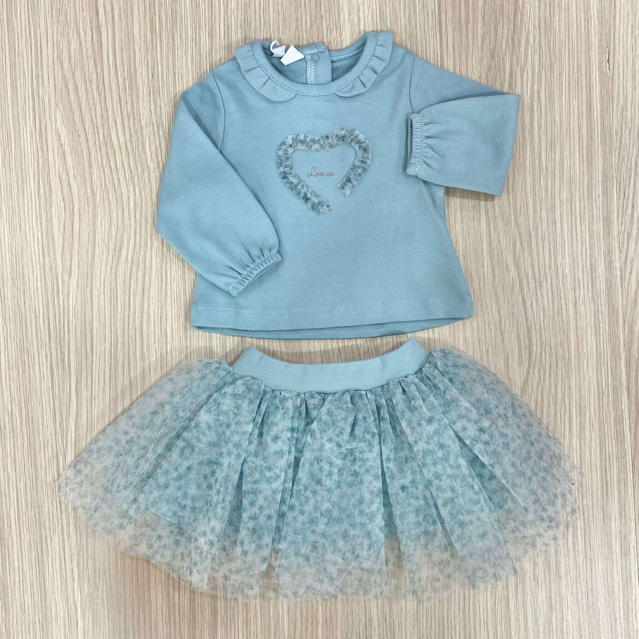 Completo due pezzi neonata/bambina in caldo cotone, di colore verde acqua. Completo con gonna in tulle e fodera.