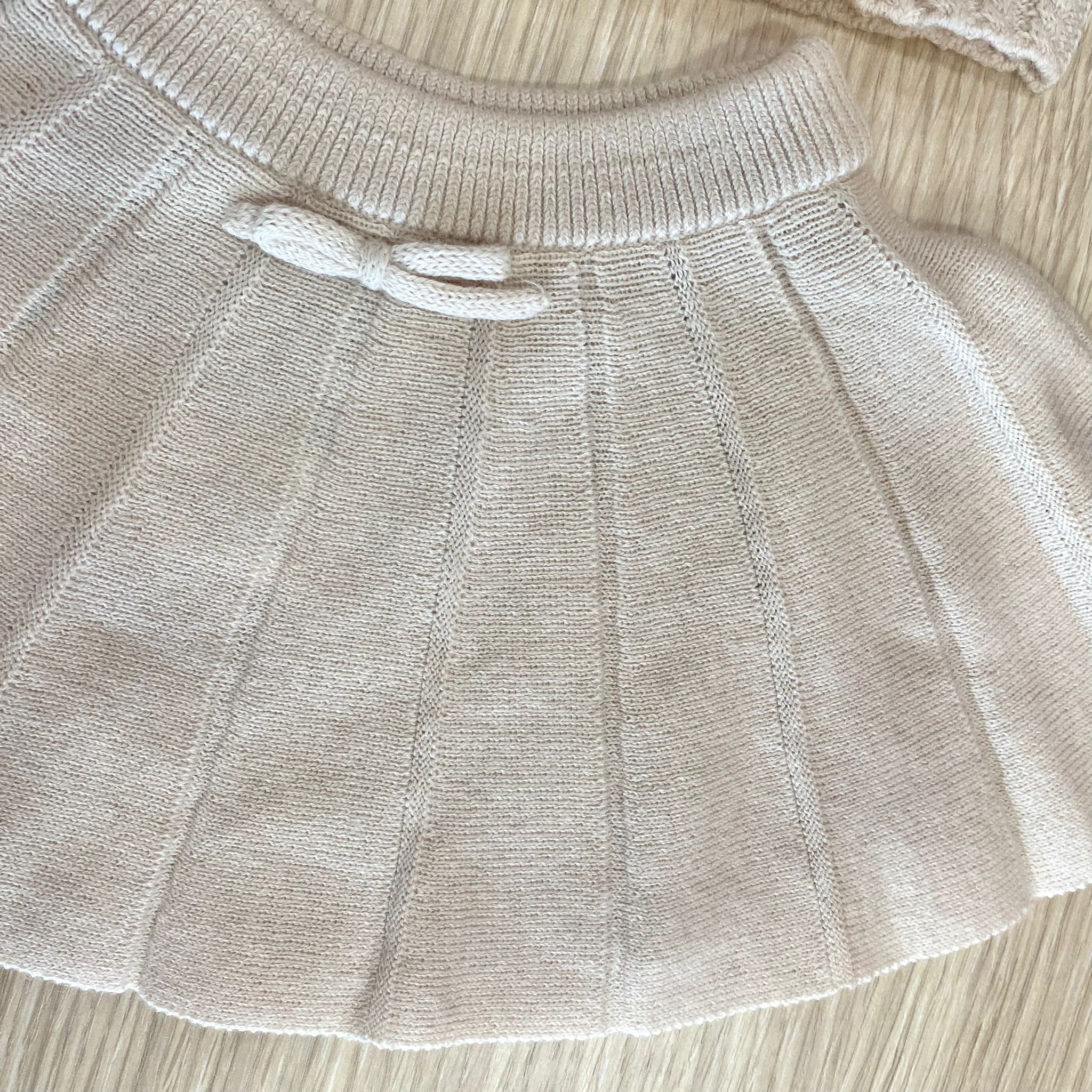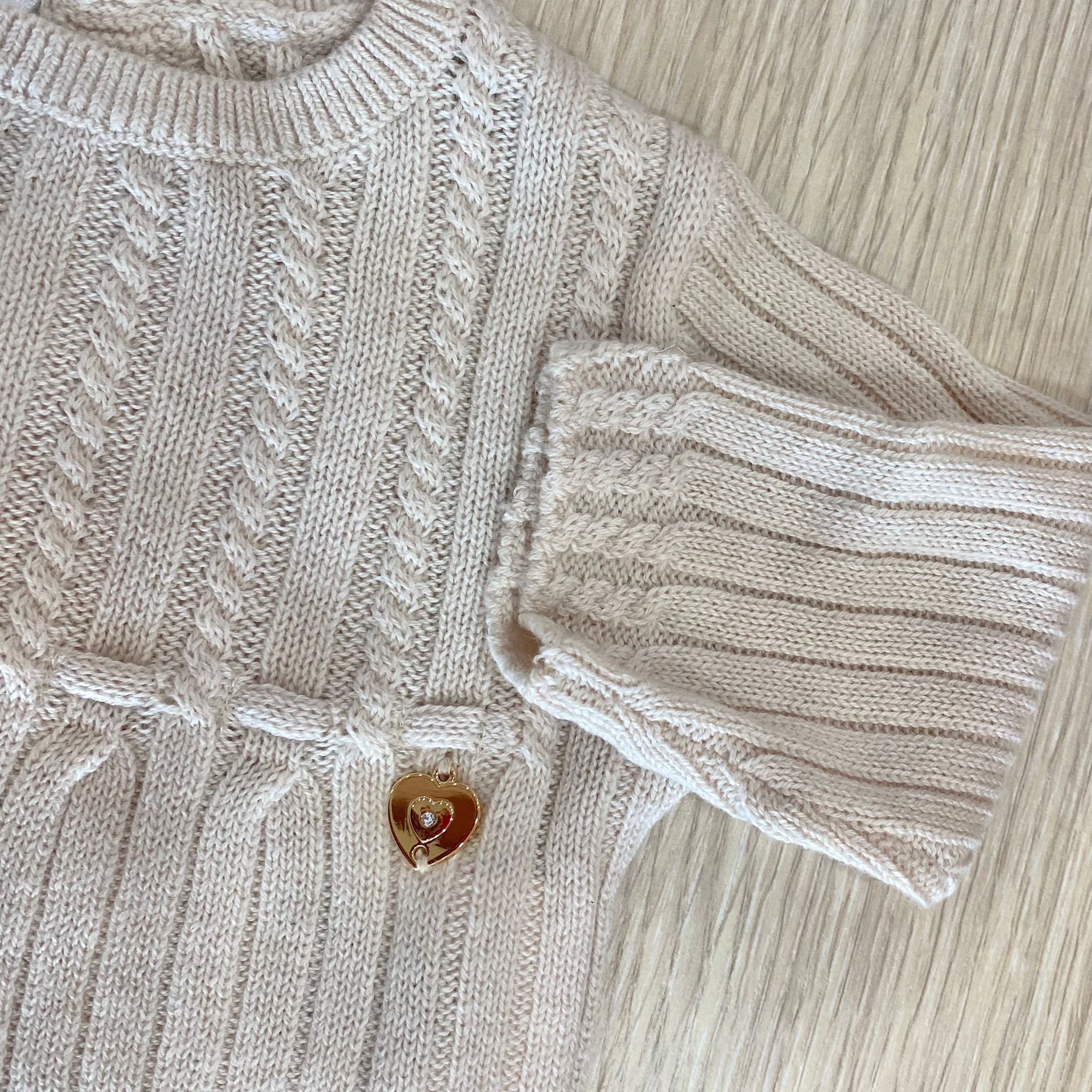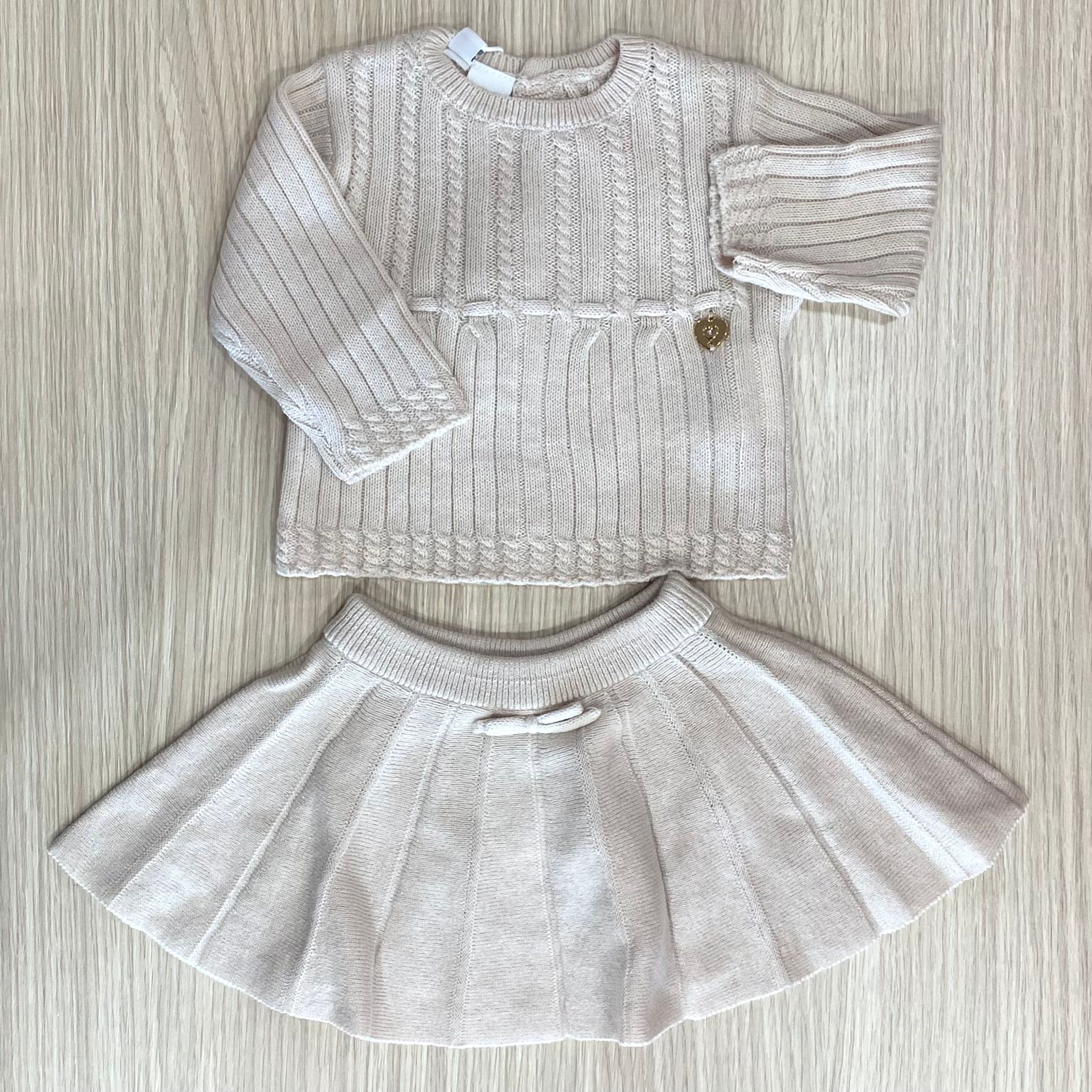 Completo due pezzi neonata/bambina in caldo cotone misto lana, di beige, con applicazione di cuoricino in rilievo. Completo composto da: maglia e gonna. 80% Cotone. 20% Lana.