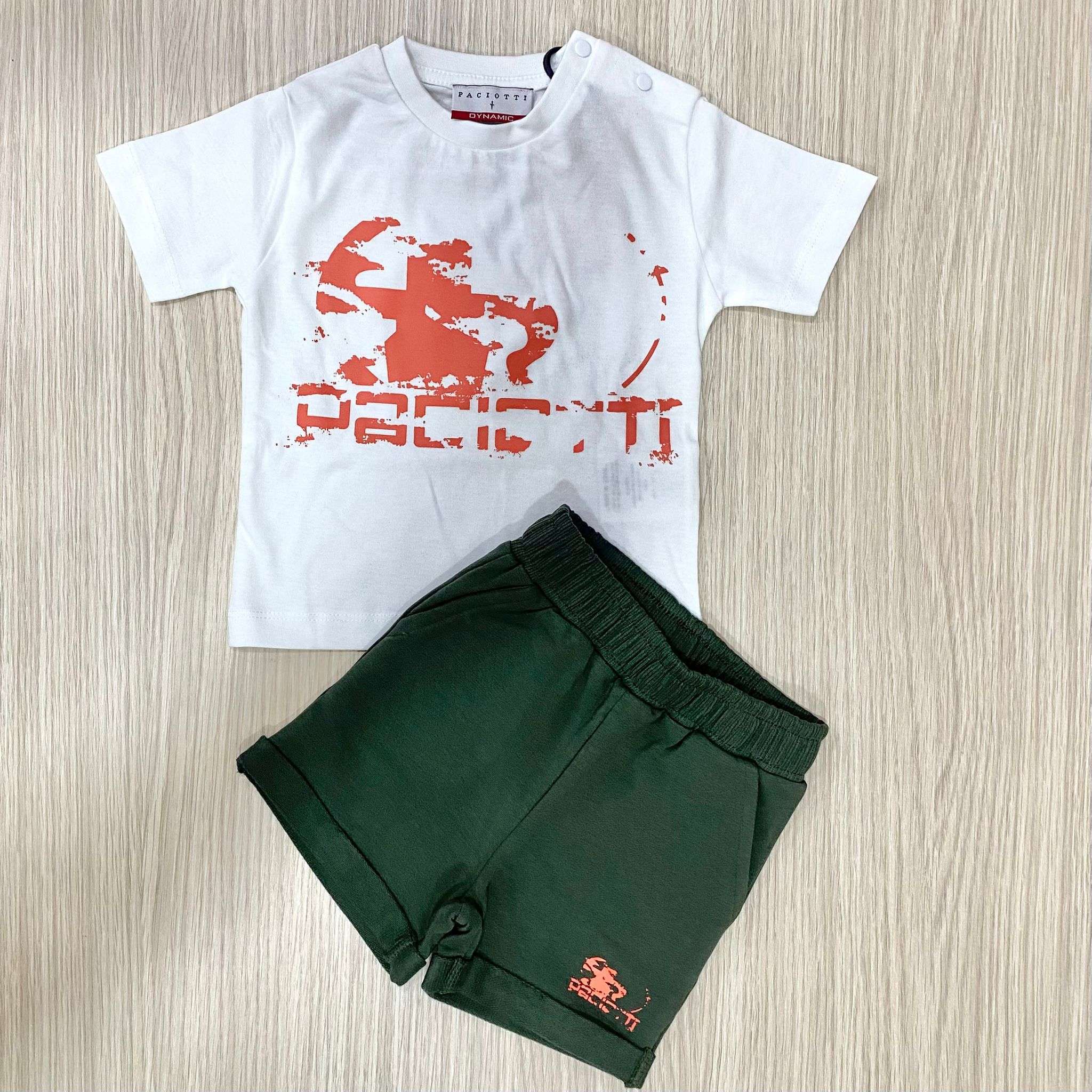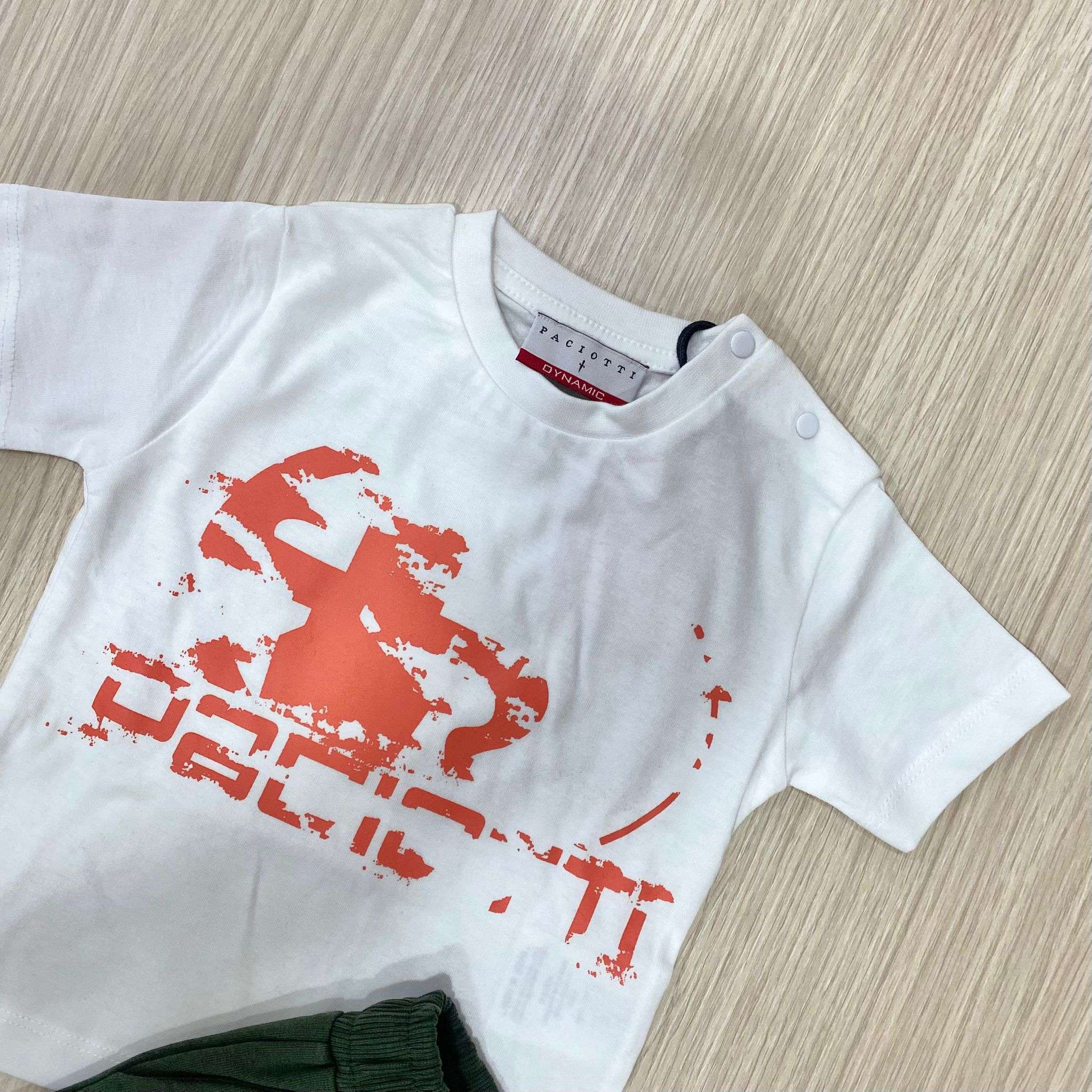 Completo Neonato Paciotti – T-shirt e Shorts Un look fresco e grintoso per i più piccoli: questo completo neonato firmato Paciotti unisce comfort e stile in un outfit perfetto per la stagione calda. La t-shirt bianca a manica corta è impreziosita da una maxi stampa frontale dal carattere deciso, mentre la pratica apertura con bottoncini sulla spalla facilita la vestizione. Gli shorts verde militare con elastico in vita assicurano libertà di movimento e una vestibilità comoda, completati dal logo coordinato sul fondo per un tocco distintivo. Ideale per il tempo libero, le passeggiate estive o come regalo speciale, è un…