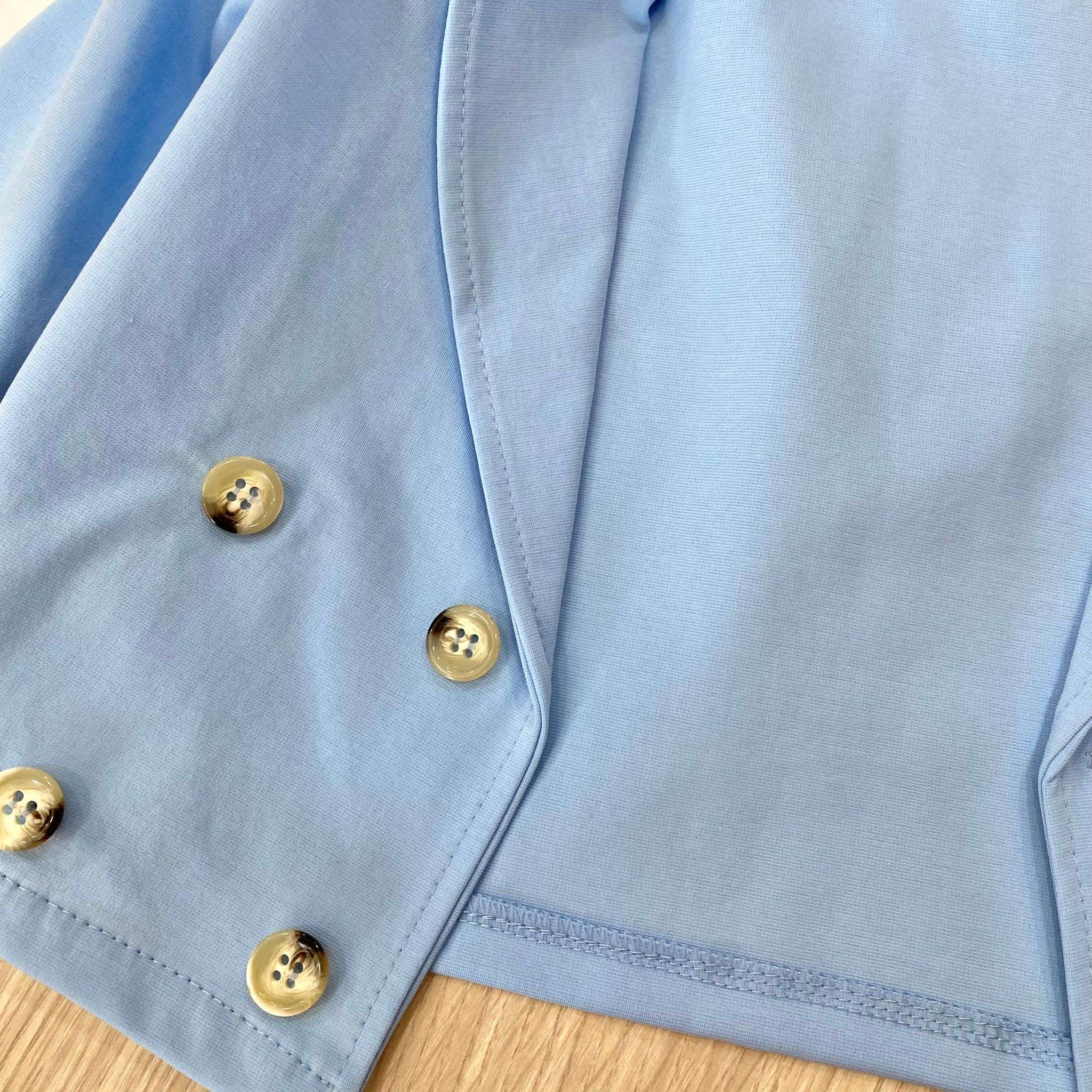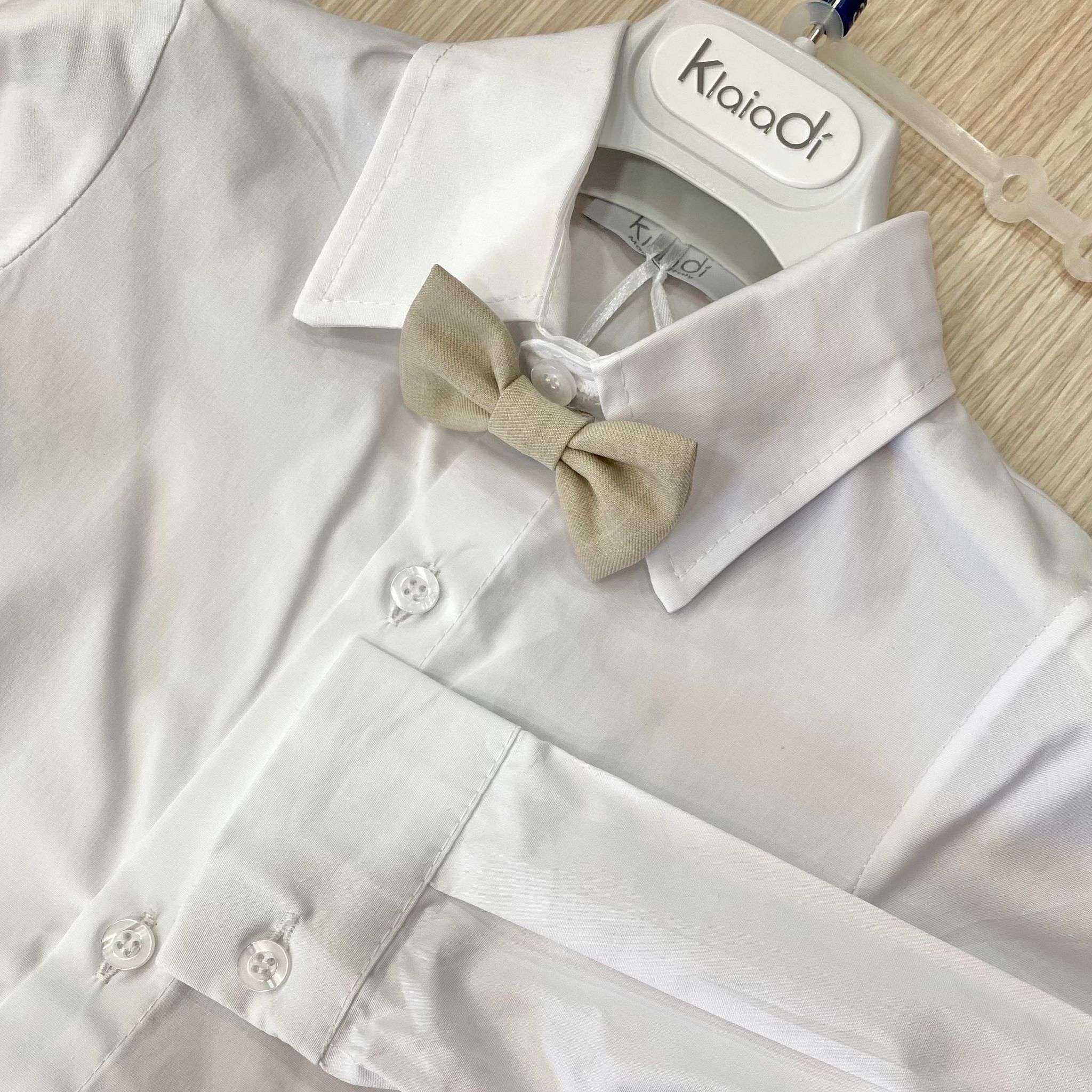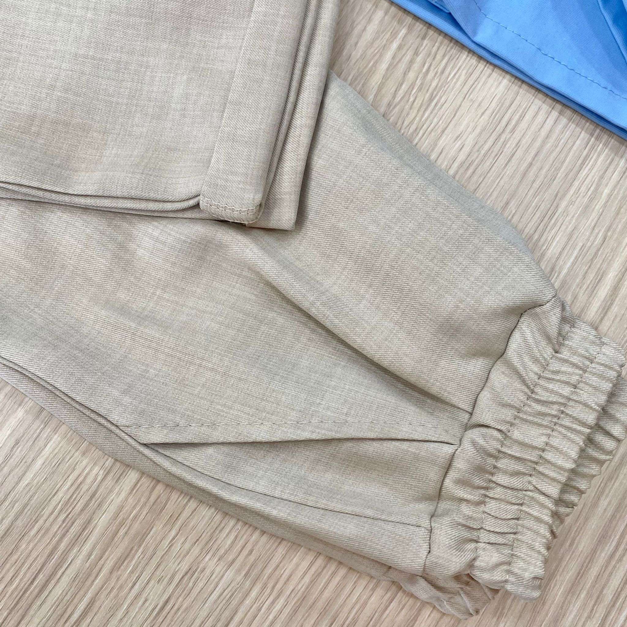 Completo elegante bambino in fesco tessuto, di colore azzurro, bianco e beige. Completo elegante composto da: camicia, pantalone, papillon, giacca. Completo ideale per battesimo e cerimonia. 65% Viscosa. 30% Nylon. 5% Elastane.