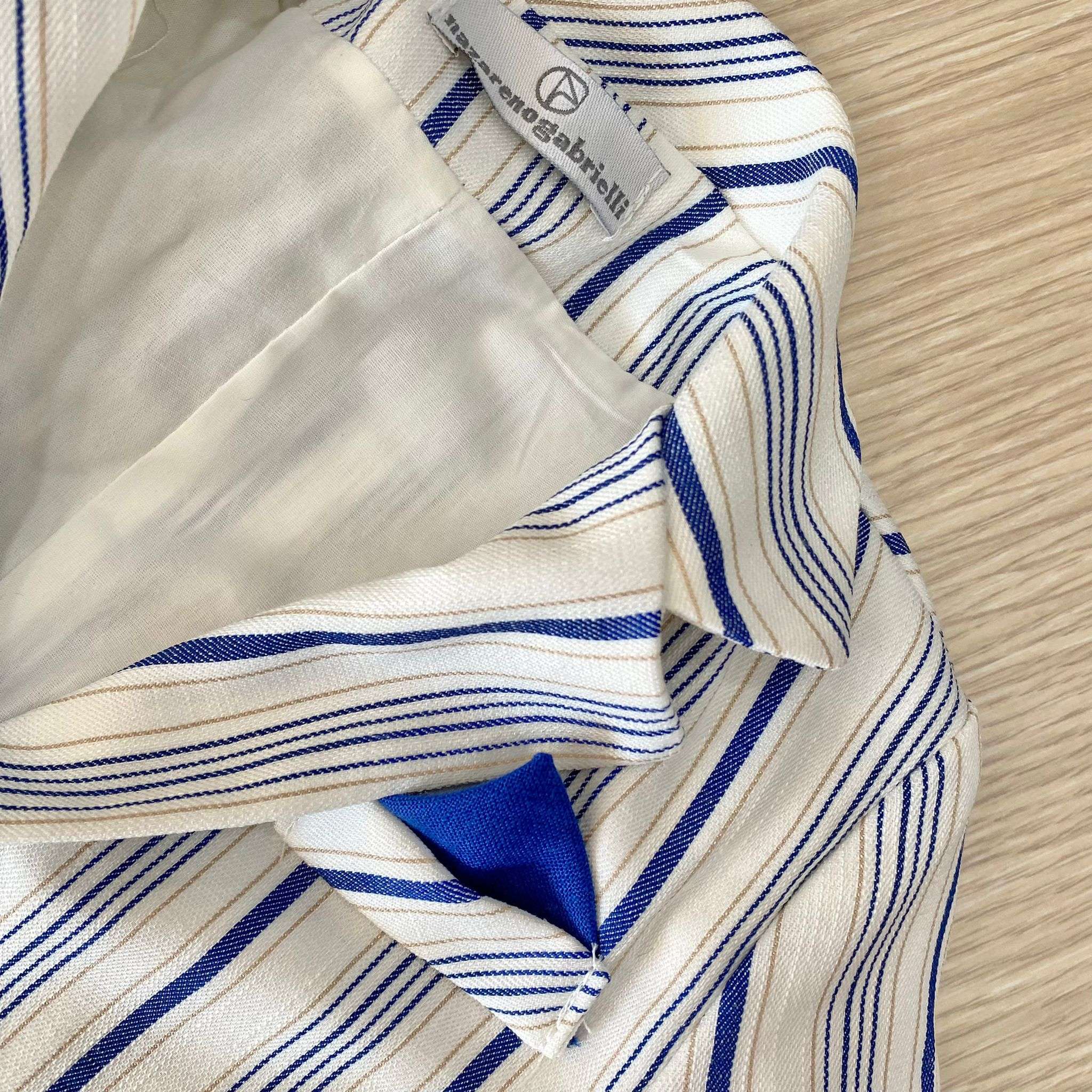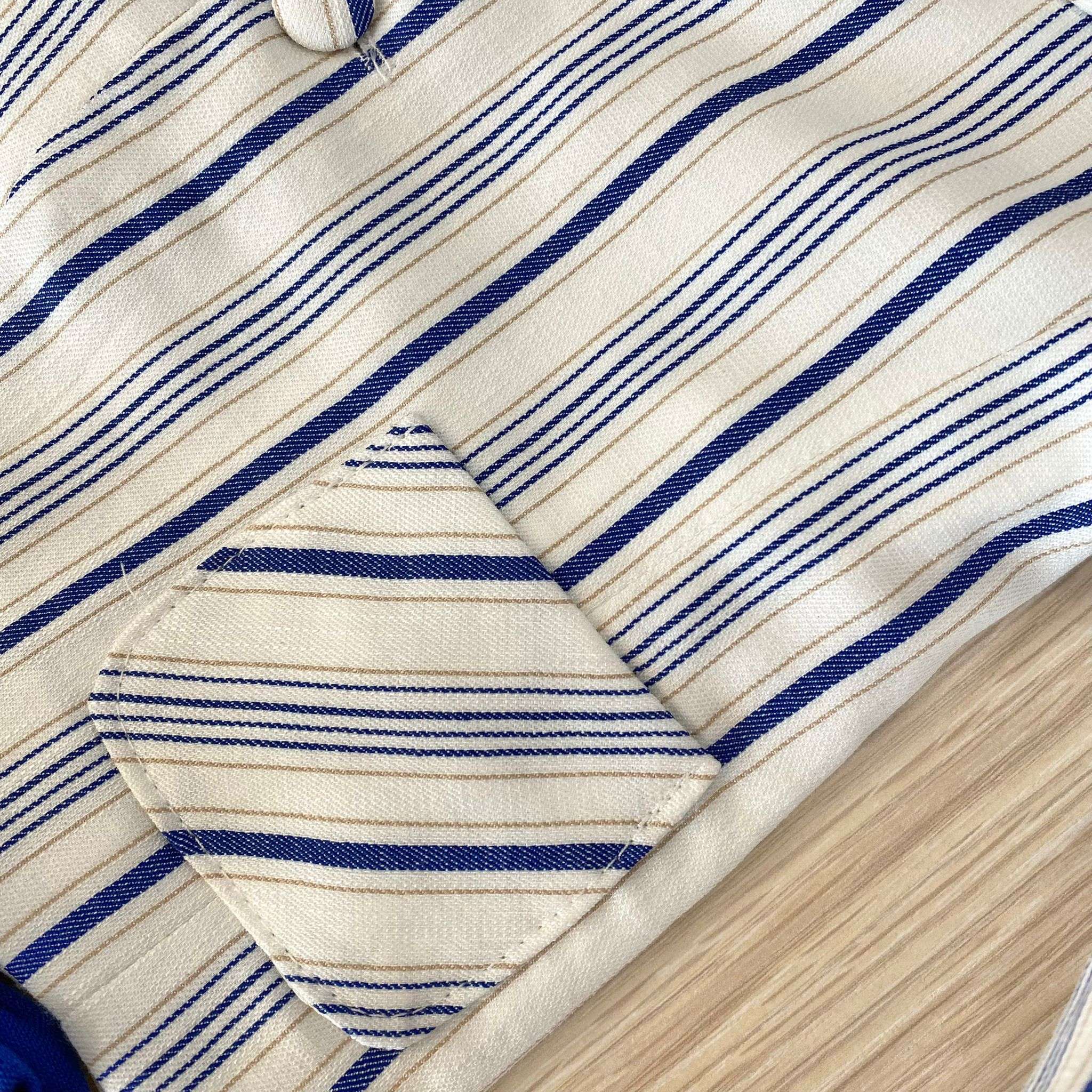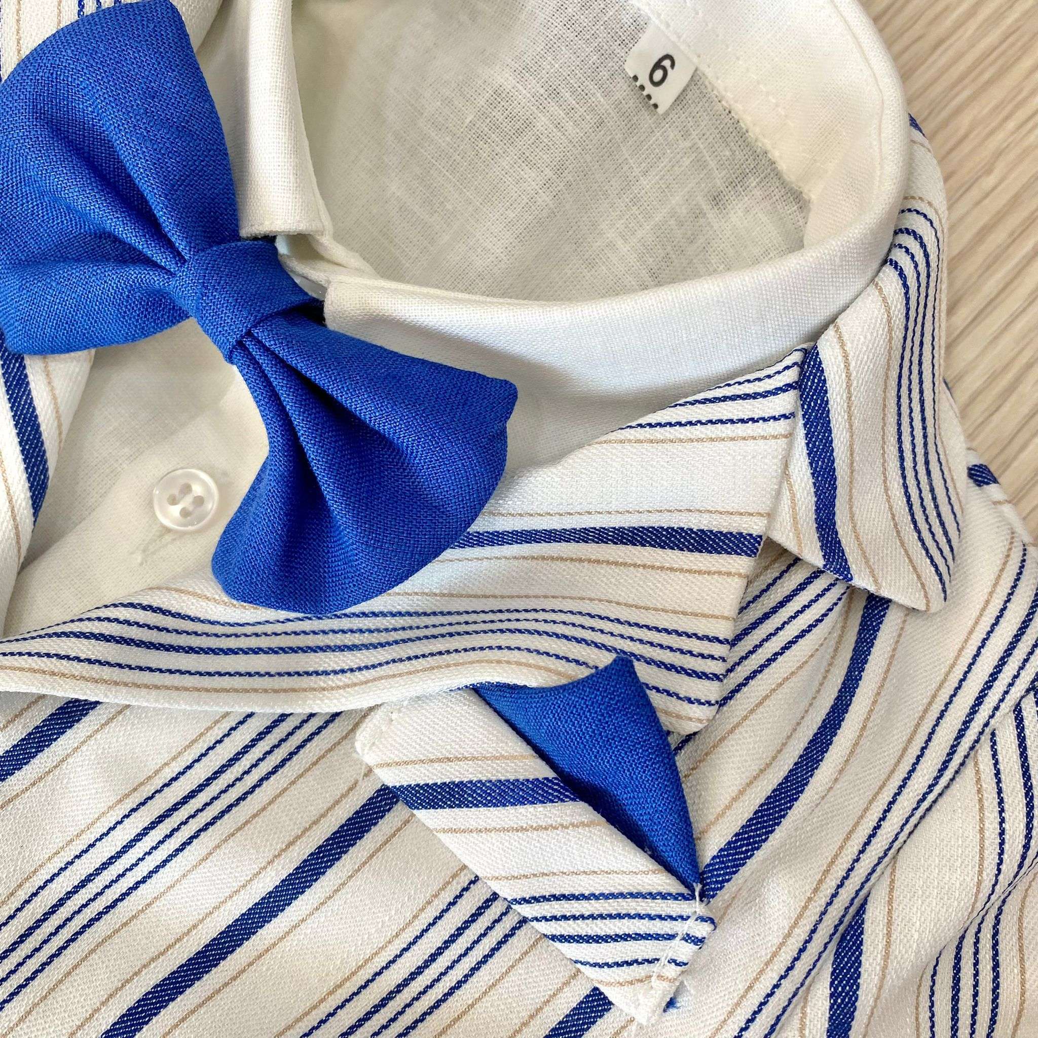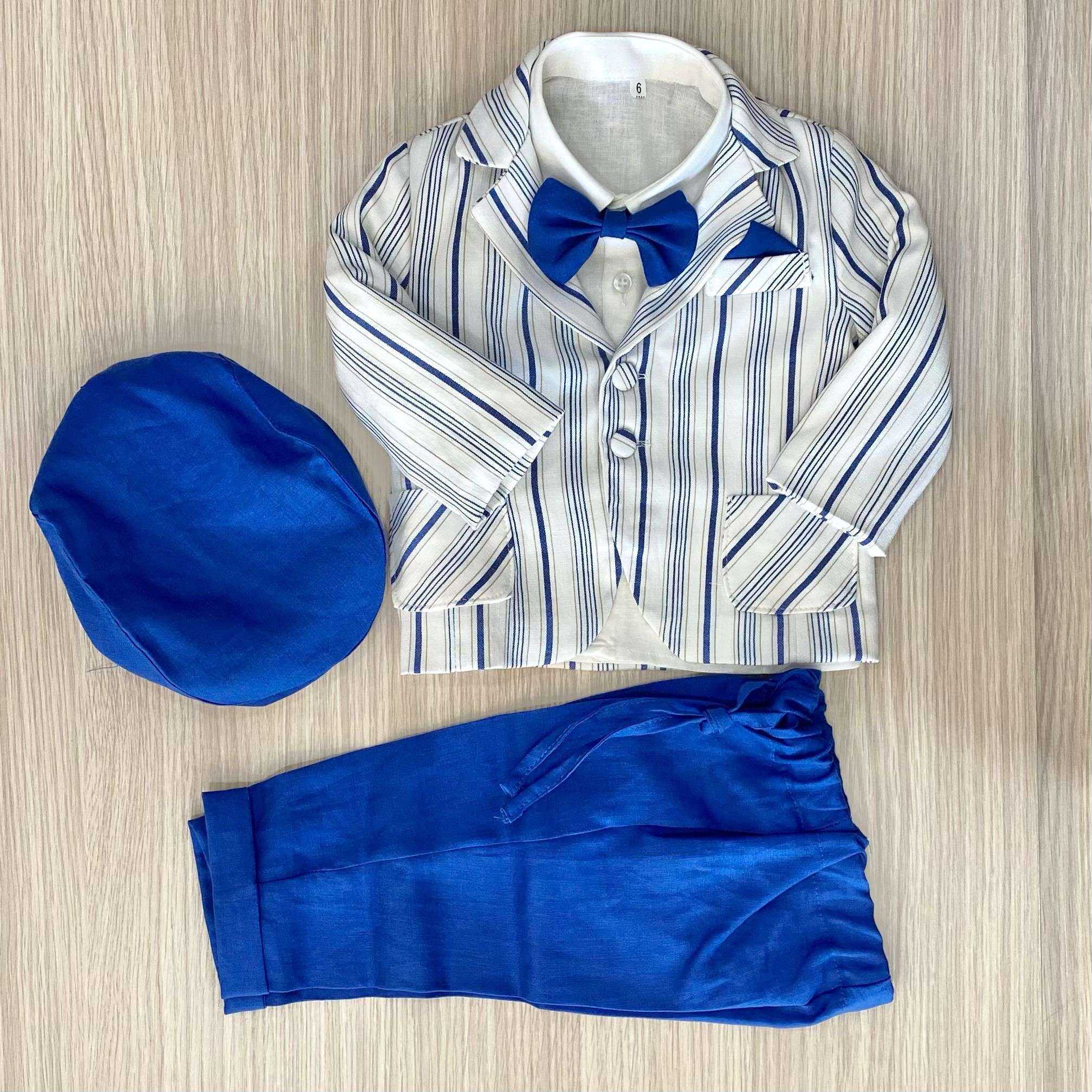 Completo elegante in lino ideale per battesimo e cerimonia. completo composto da: Giacca foderata in 100% Cotone, con dettaglio di taschino e finto fazzoletto, di colore panna con strisce di colore beige e royal. Camicia in lino di colore panna, con papillon regolabile ed estraibile. Pantalone in lino con elastico e regolabile, di colore royal.
