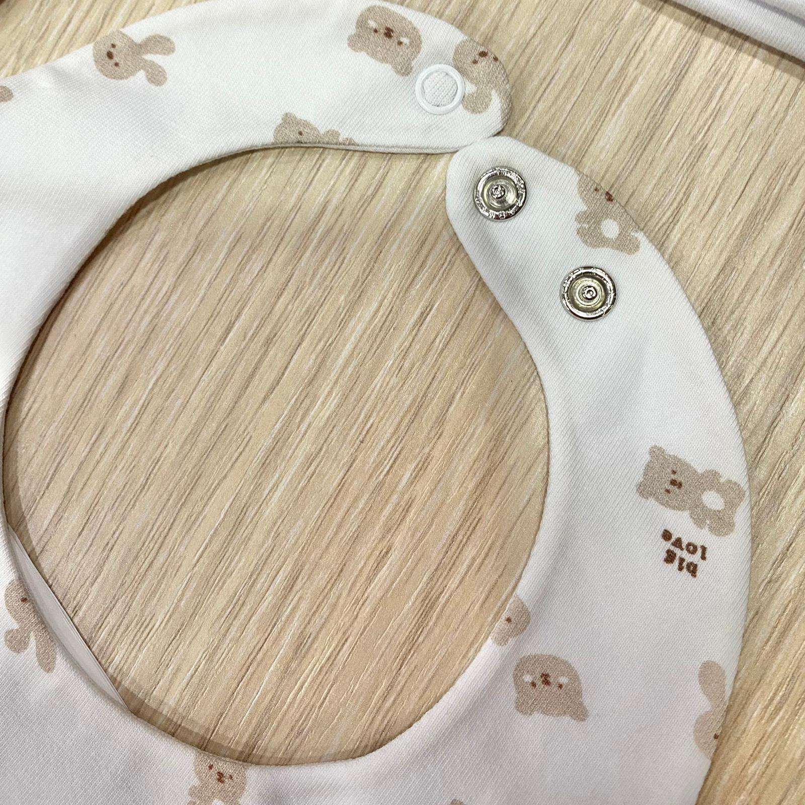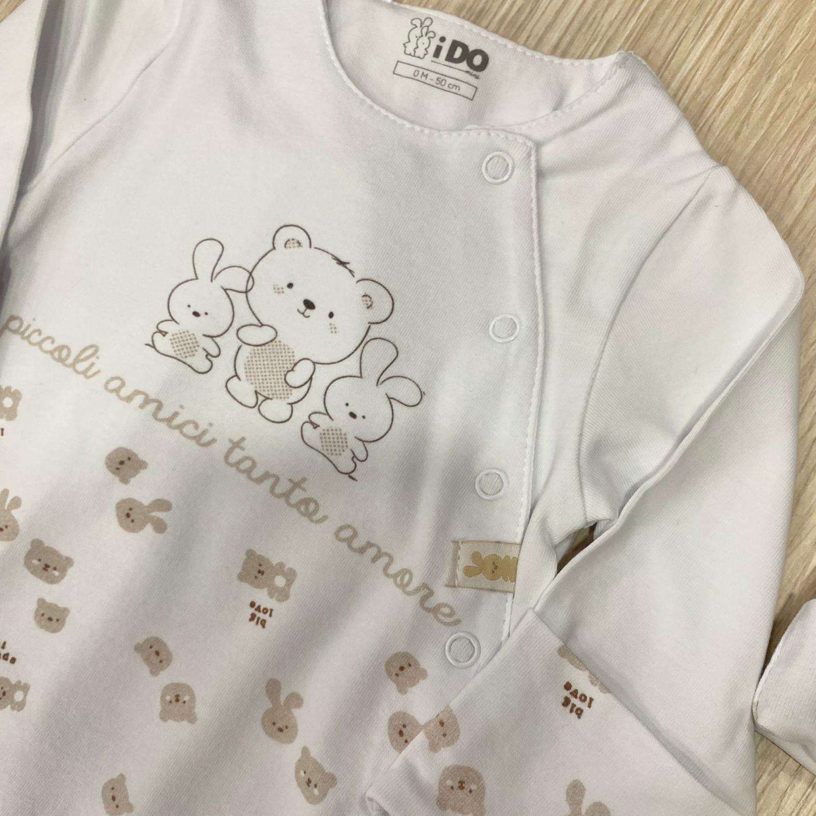 Completo tre pezzi neonato/a in cotone, di colore bianco e beige, con disegni e scritta di vari colori. Completo tre pezzi composto da: tutina intera, cappellino e bavetta.