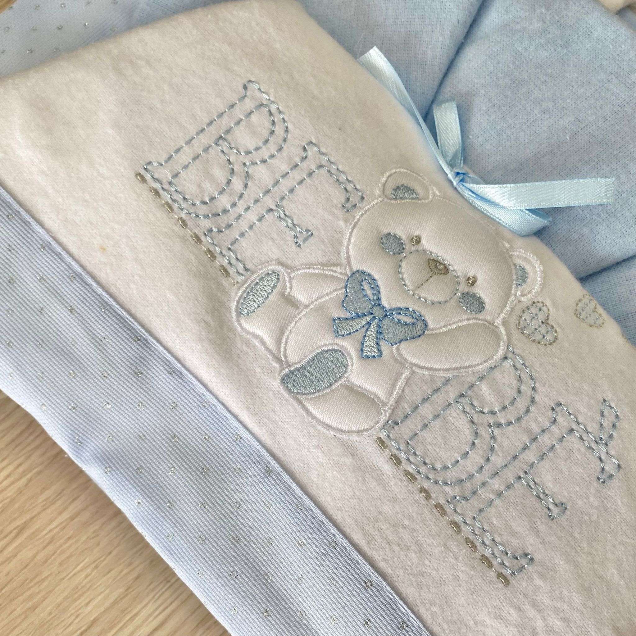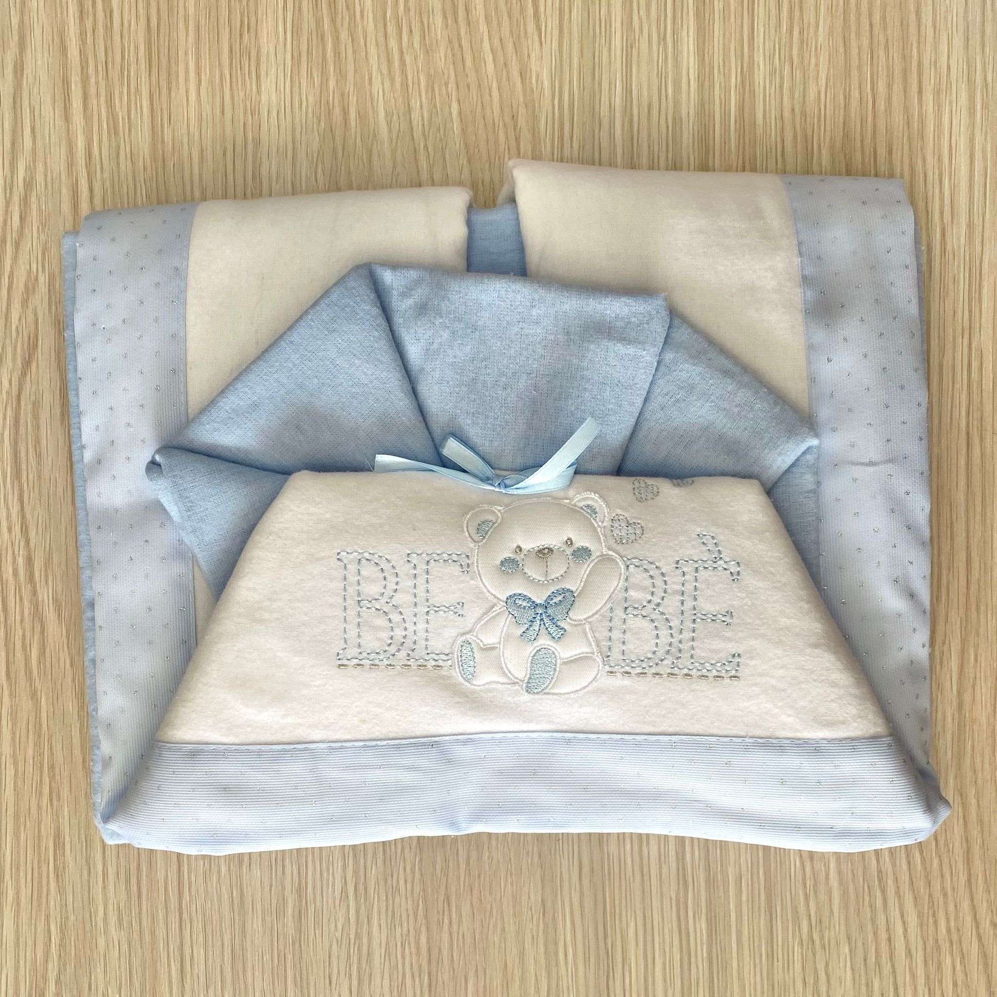 Composè lettino/culla grande in flanella, di colore azzurro e panna con pois argentati. Composè lettino/culla grande composto da: lenzuolo sopra 120×180 cm. Lenzuolo sotto con angoli 140×68+15 cm. Federa: 40×55 cm.