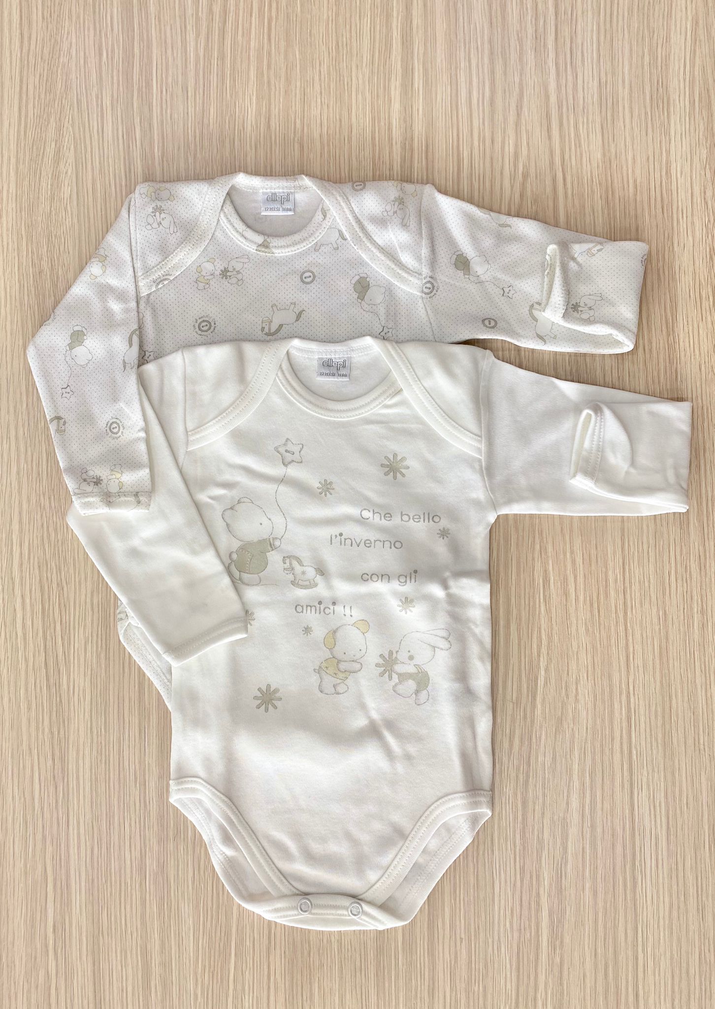 Coppia body bambino/a in caldo cotone, leggermente felpato, di colore bianco e grigio. 12 Mesi: 80 cm. 3 Anni: 98 cm. 100% Cotone.