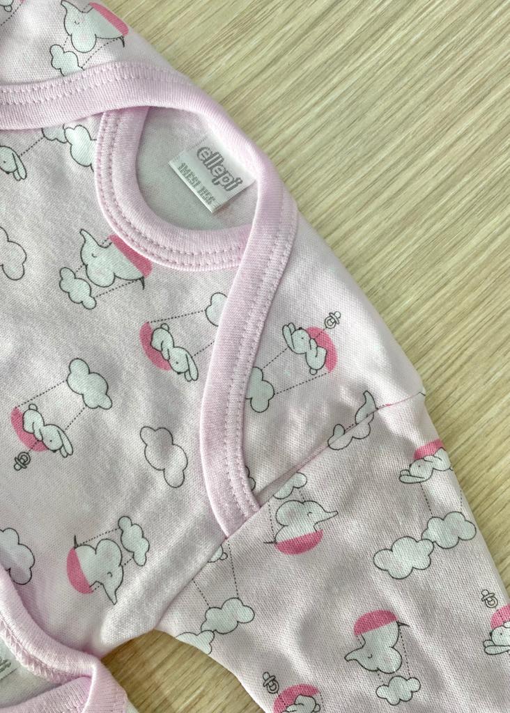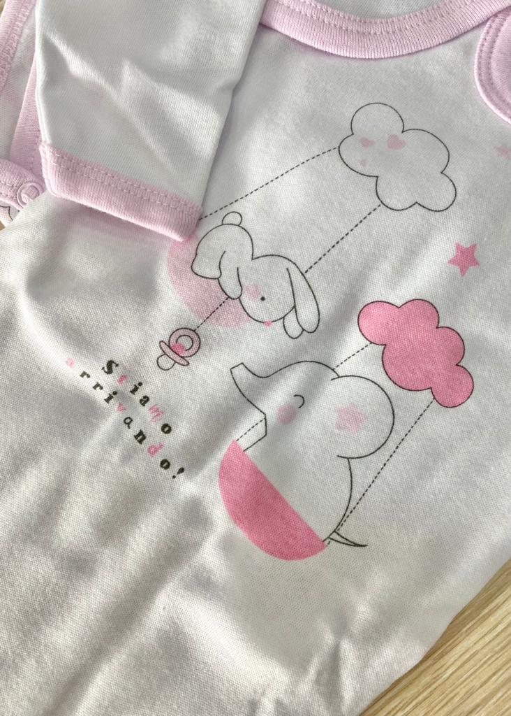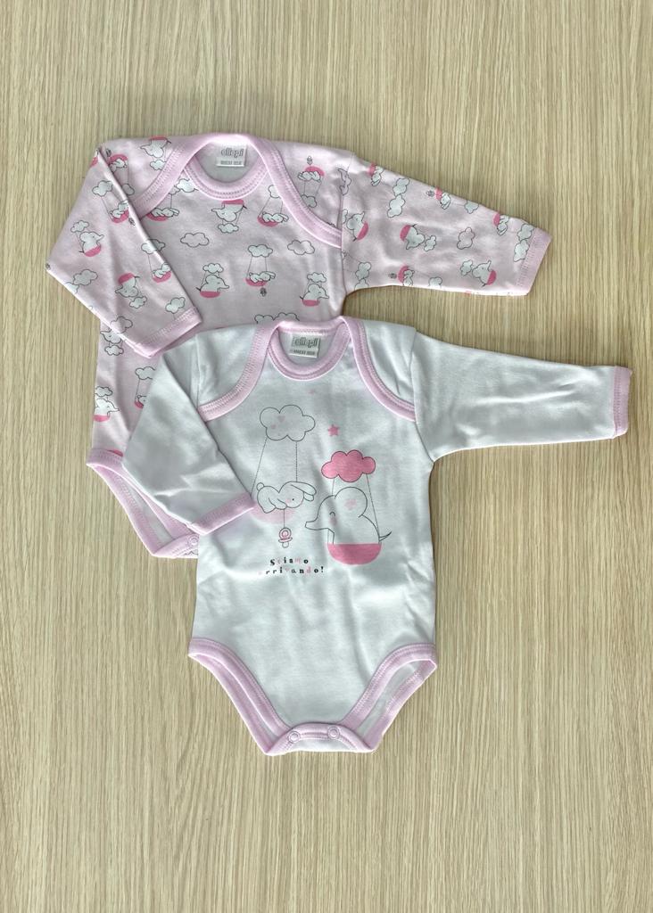 Coppia body neonata in caldo cotone, leggermente felpato, di colore bianco e rosa. 100% Cotone.
