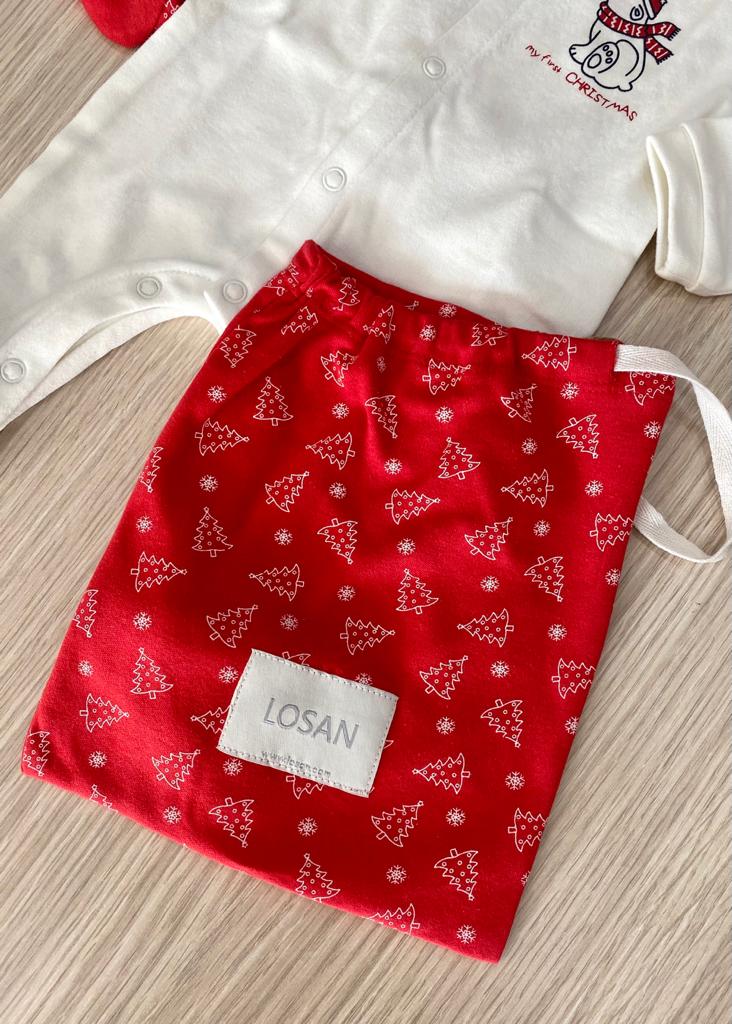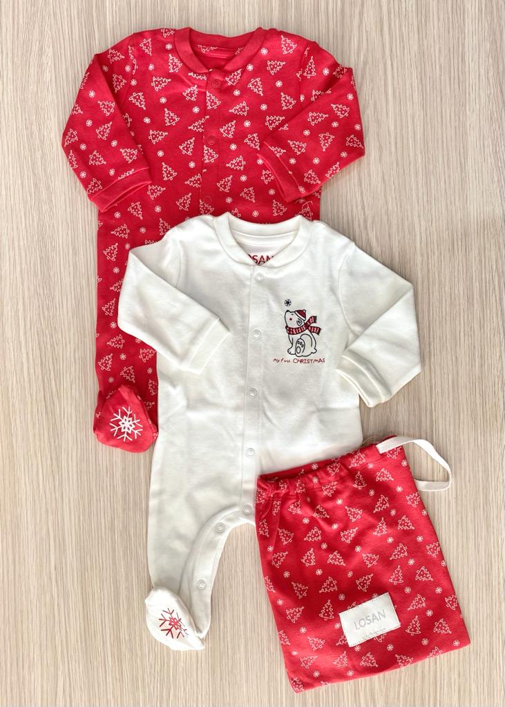 Coppia di pigiamini neonata in caldo cotone. Pack di due pigiami di cotone organico. Uno di colore écru e l’altro di colore rosso. Con stampe invernali e natalizie. Apertura sul davanti nel cavallo con automatici. Stampa di fiocco di neve anti-scivolo nella suola. Presentato in sacchetto di tela. 100% Cotone.