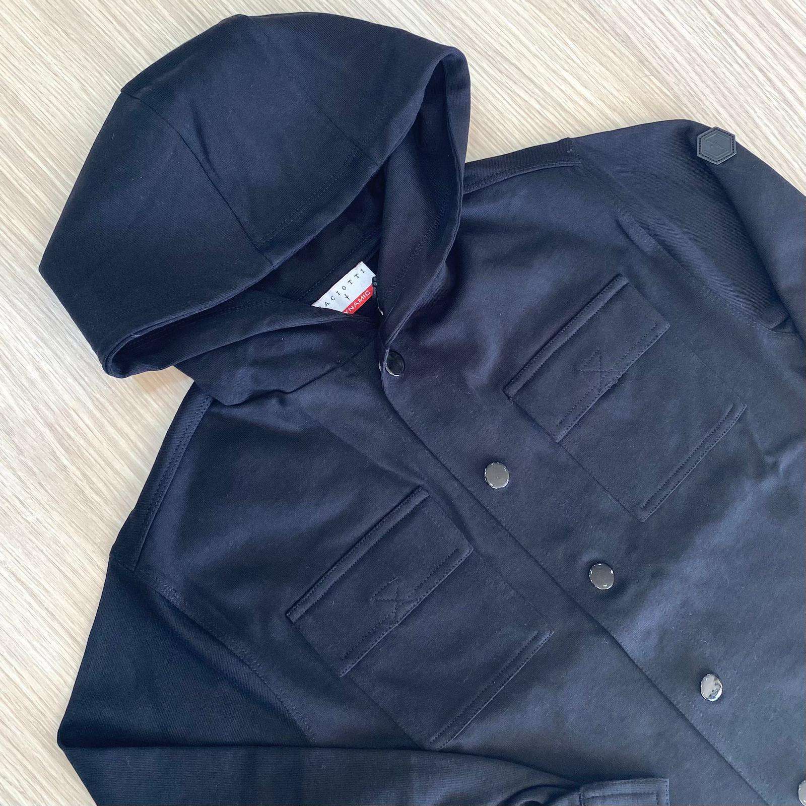 Giacca bambino/ragazzo in cotone, di colore nero, firmata Paciotti Dynamic, perfetta per la mezza stagione. Modello con cappuccio fisso, chiusura frontale con bottoni a pressione e tasche applicate sul petto con pattina. Stile casual e grintoso, ideale da abbinare a jeans o pantaloni jogger. Logo tono su tono su una manica per un tocco distintivo e discreto. Morbida, comoda e versatile, pensata per i ragazzi dallo stile moderno. 100% Cotone.