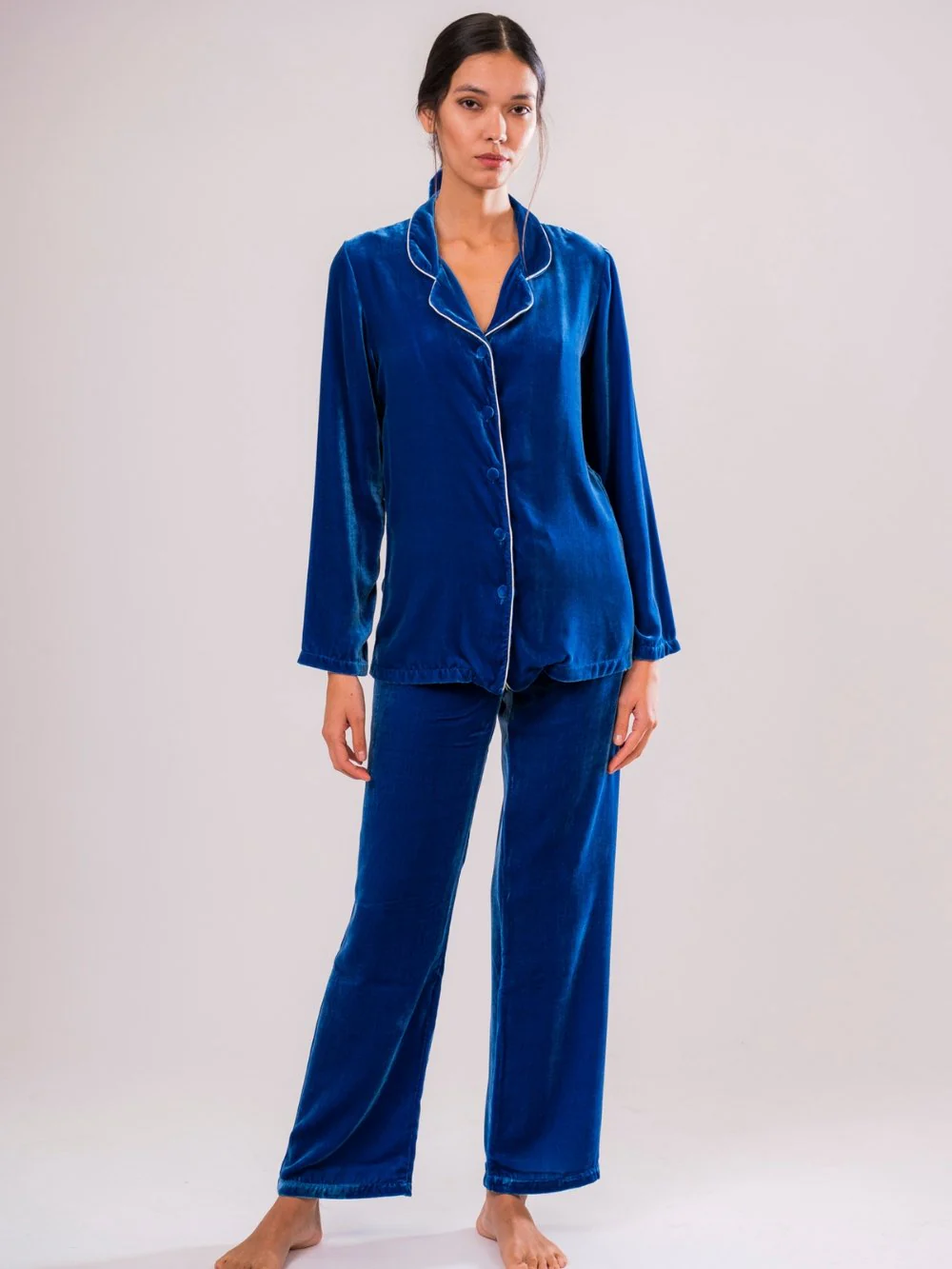 Concediti un momento di puro relax con la nostra camicia del pigiama in velluto di seta blu, un capo raffinato che unisce la morbidezza del velluto alla freschezza della seta. Realizzata interamente in Italia con la massima cura per i dettagli, questa camicia è un vero e proprio gioiello di artigianalità.