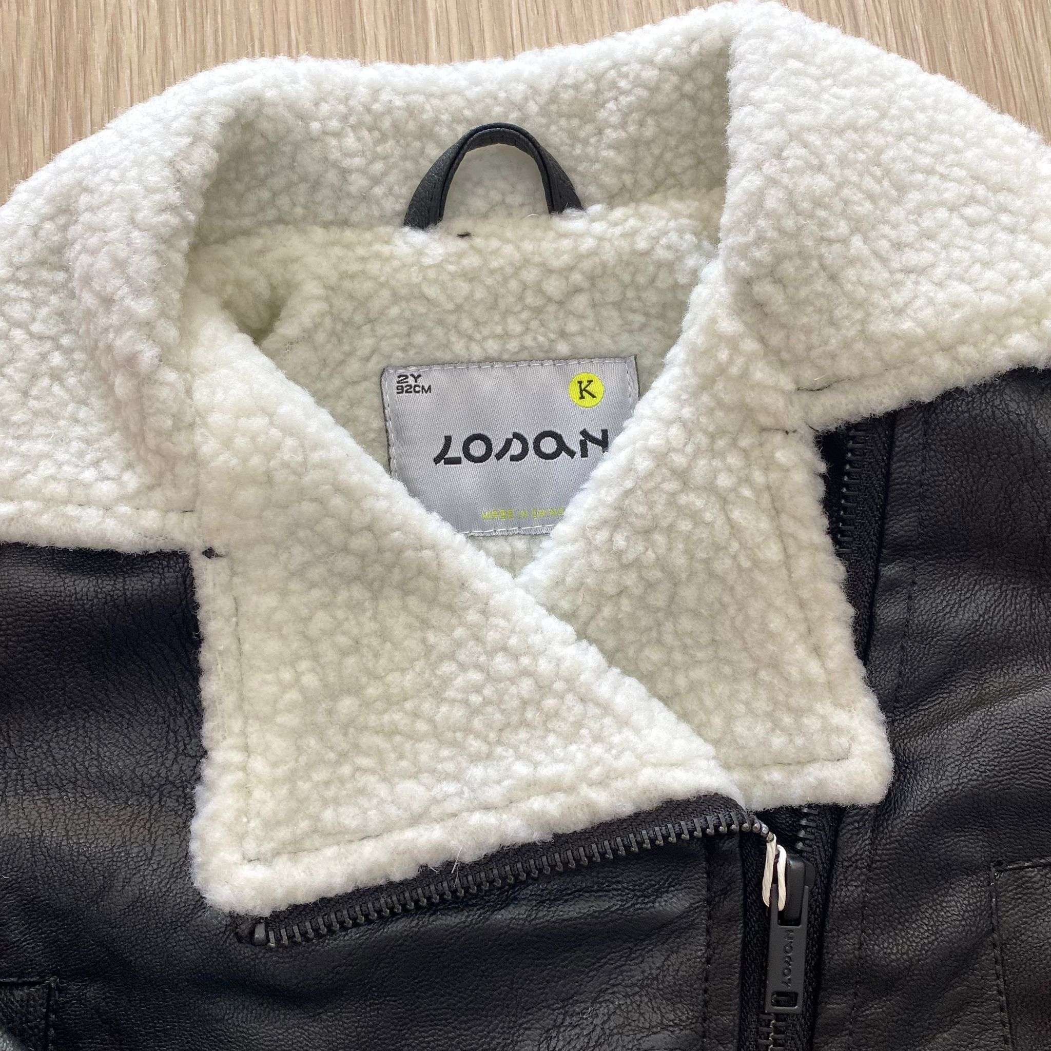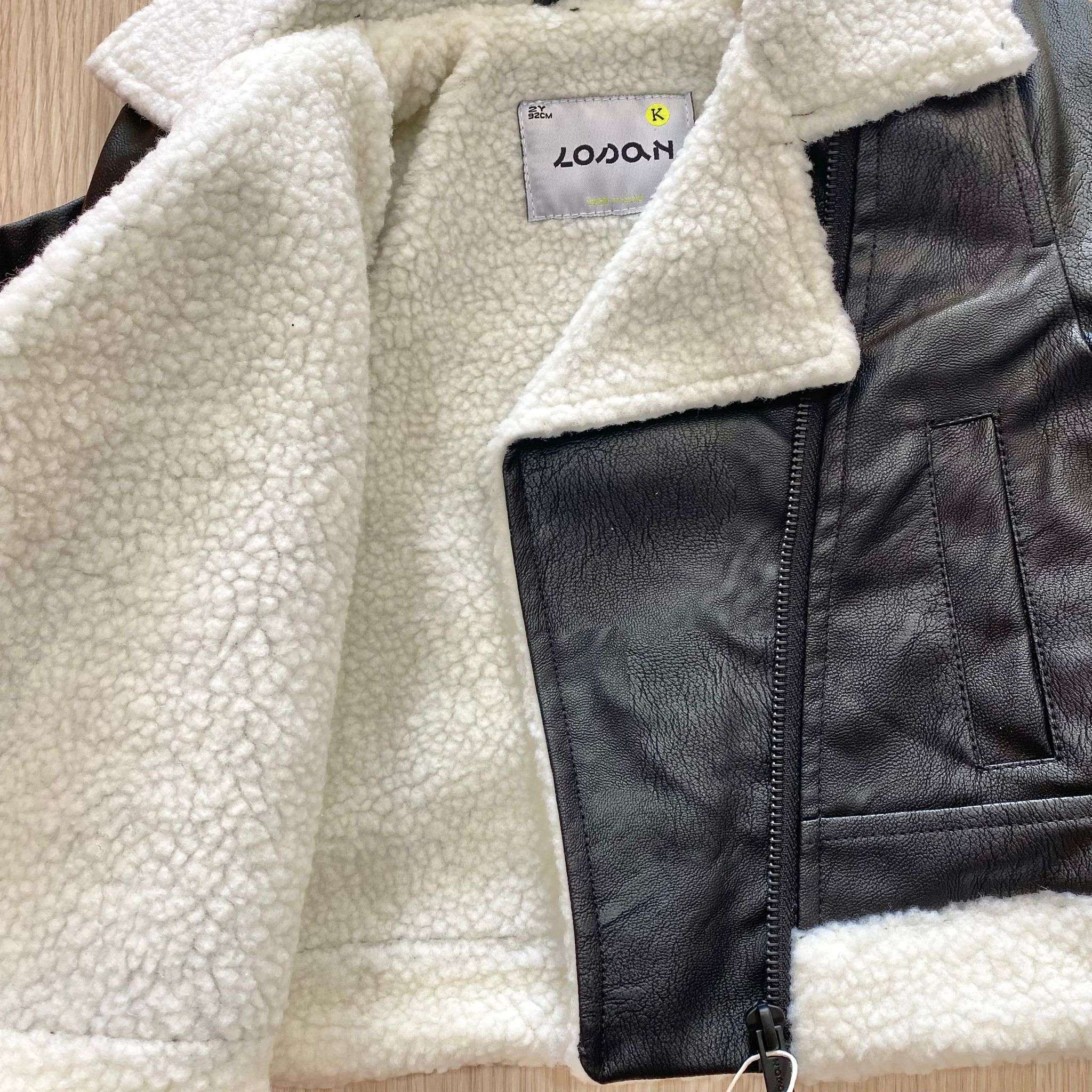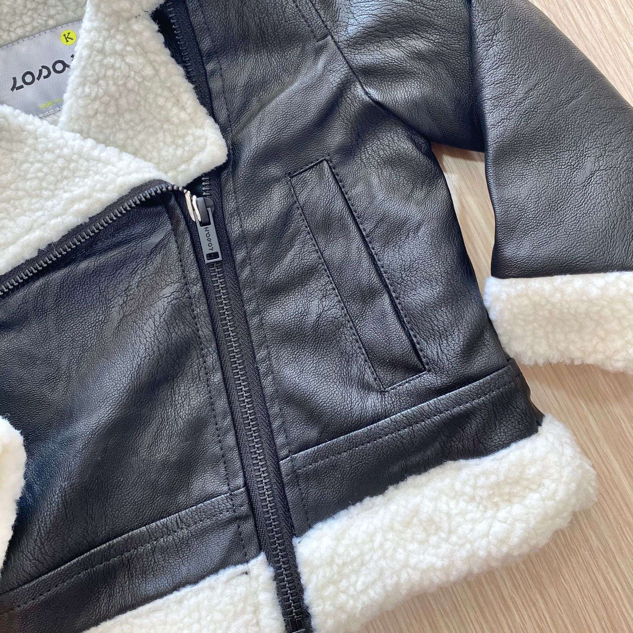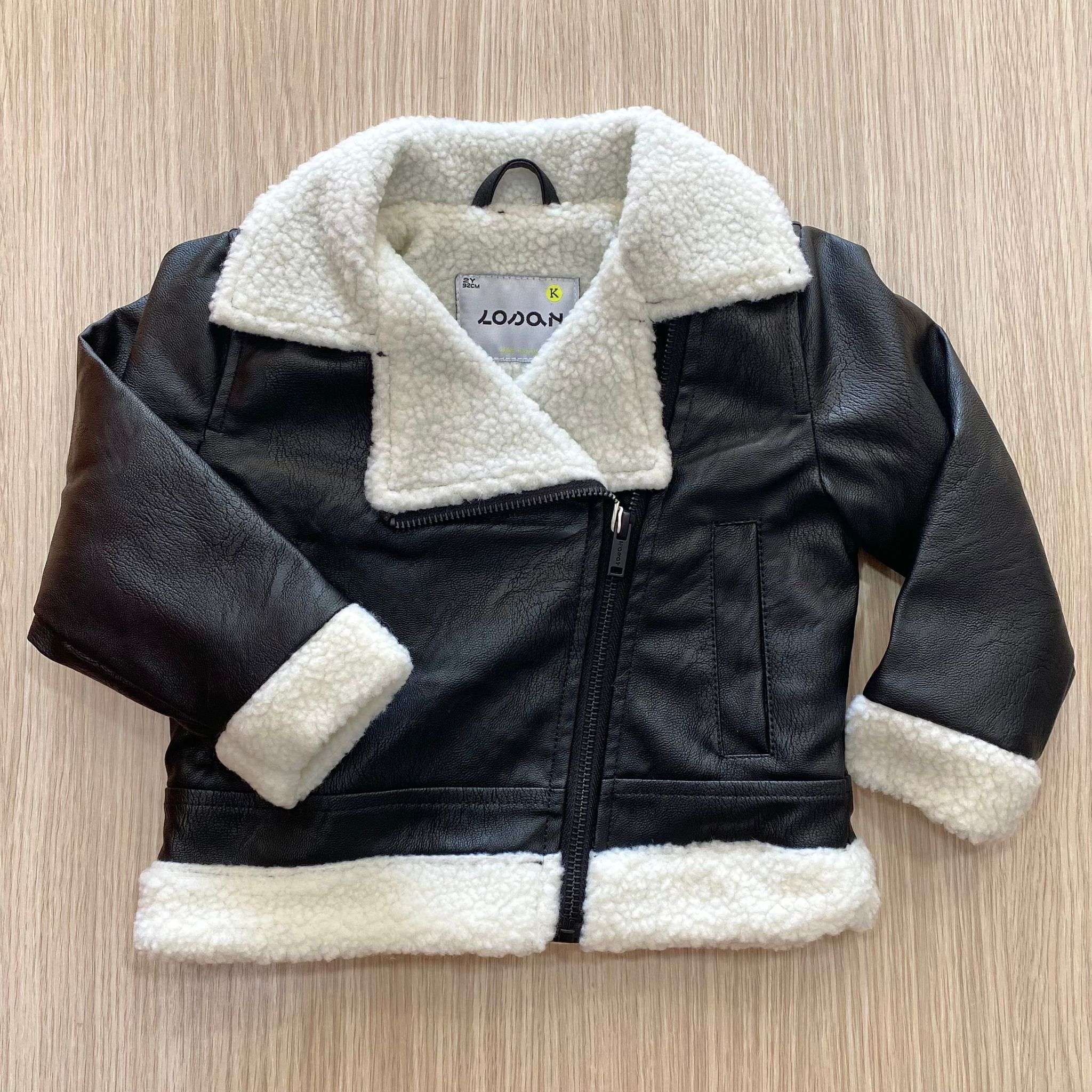 Giubbotto bambina in ecopelle, di colore nero con imbottitura di colore panna.