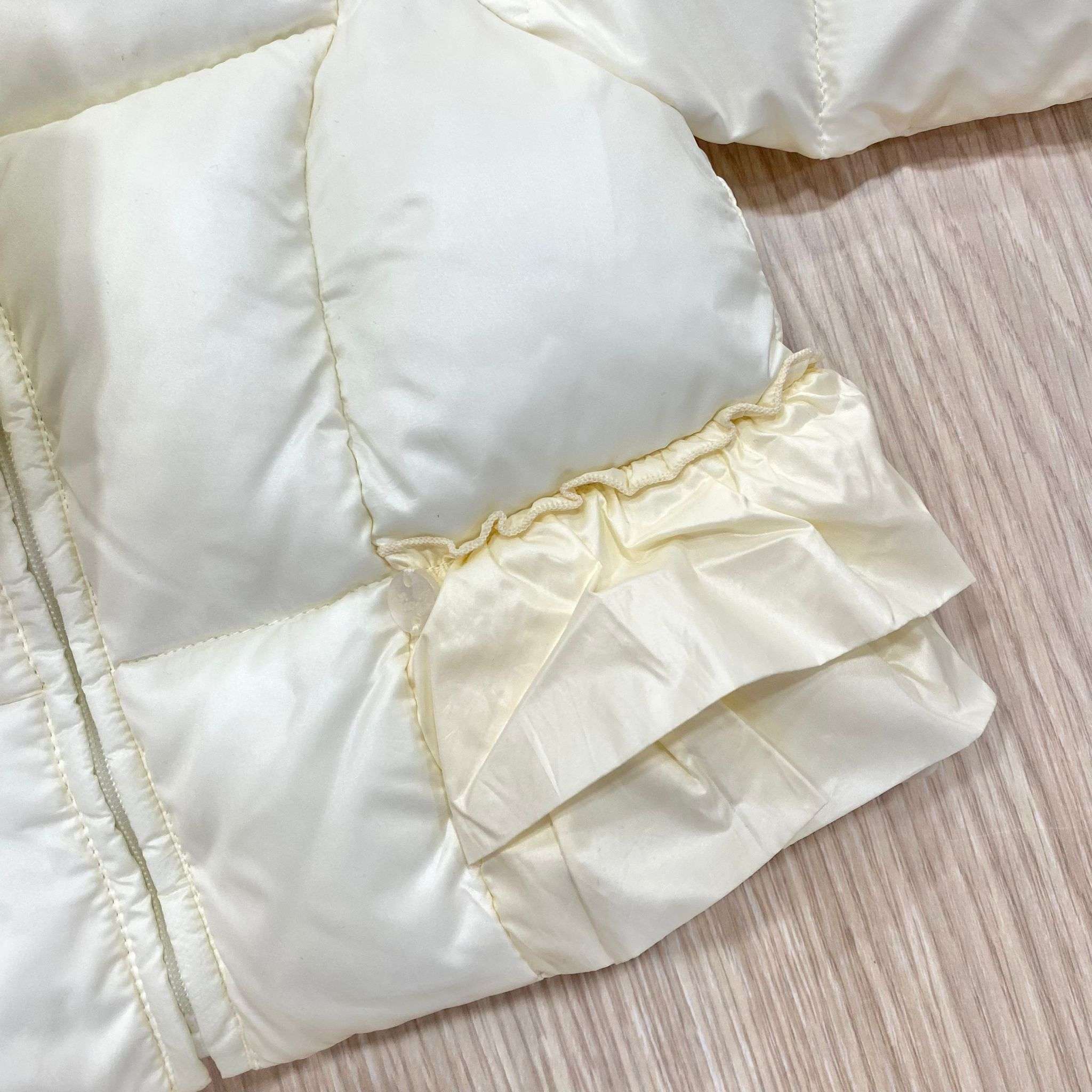 Giubbotto neonata/bambina imbottito, di colore burro, con cappuccio.