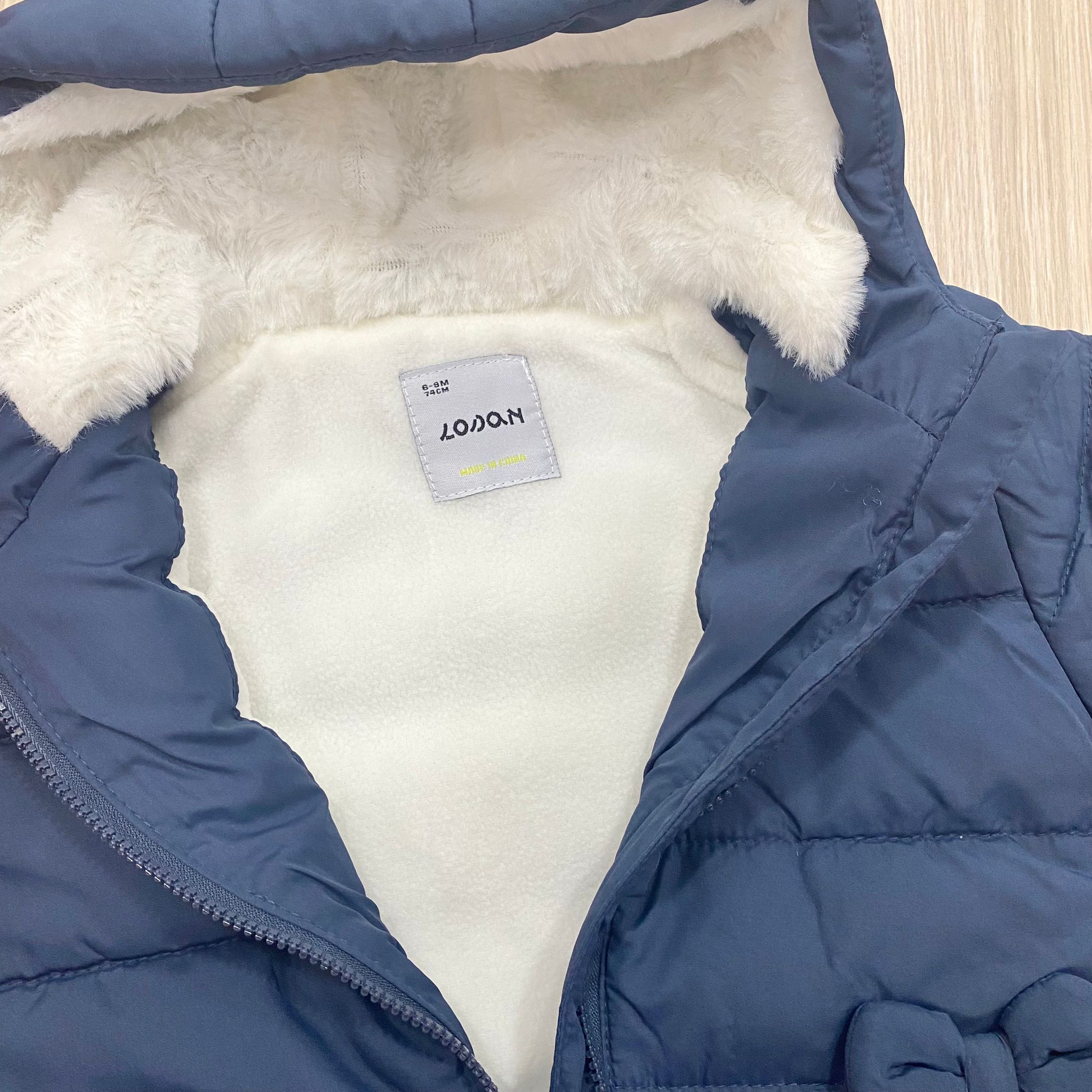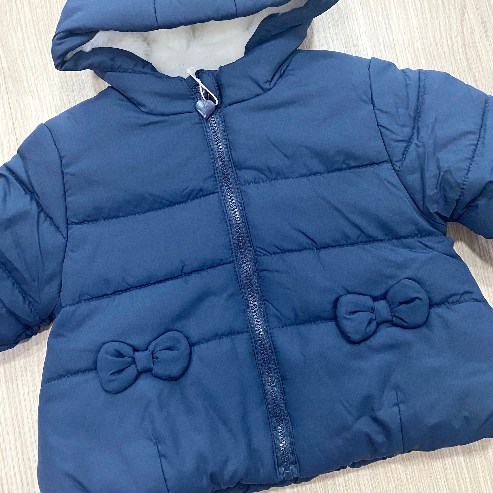 Giubbotto neonata/bambina di colore blu, con interno in pile di colore bianco e cappuccio con interno ecopelliccia. Giubbotto con dettaglio di fiocchetti.