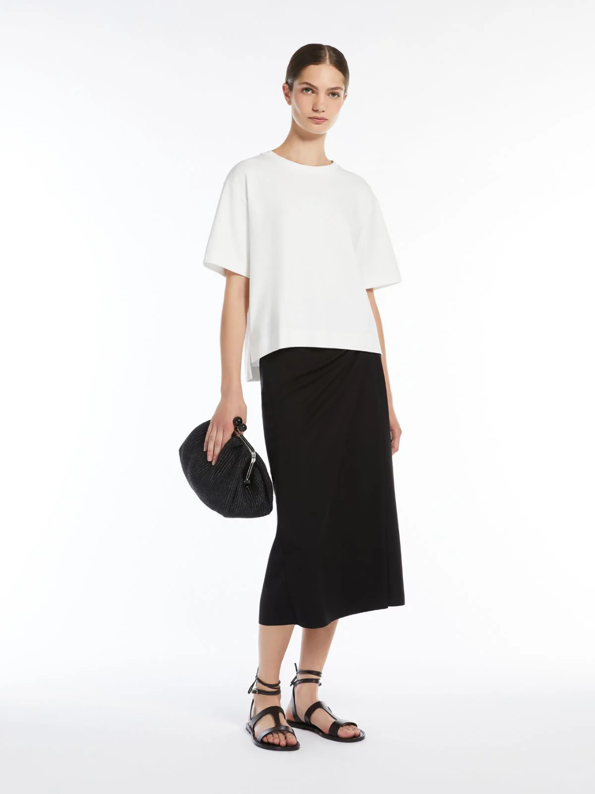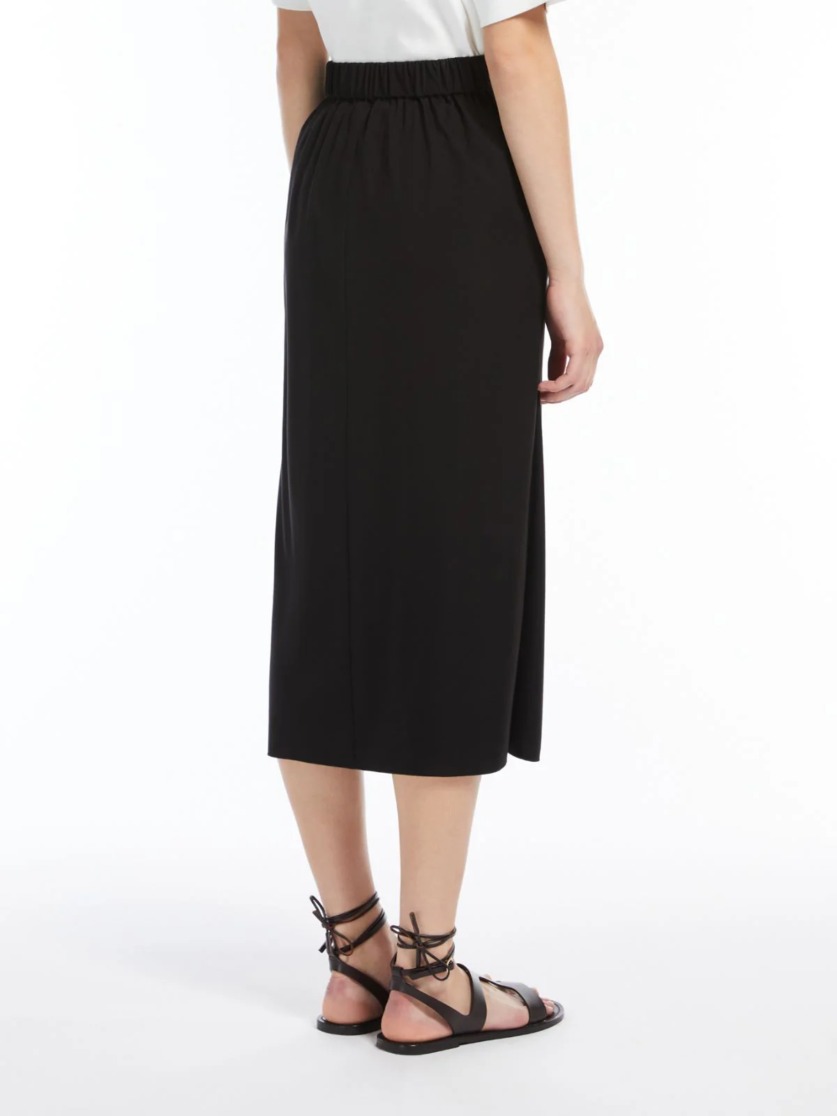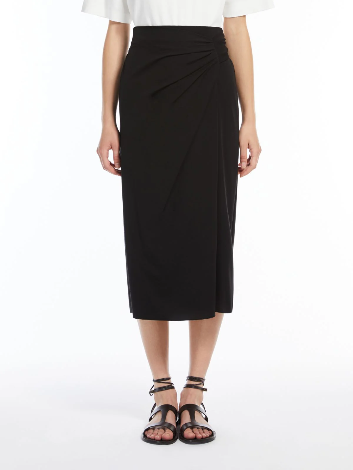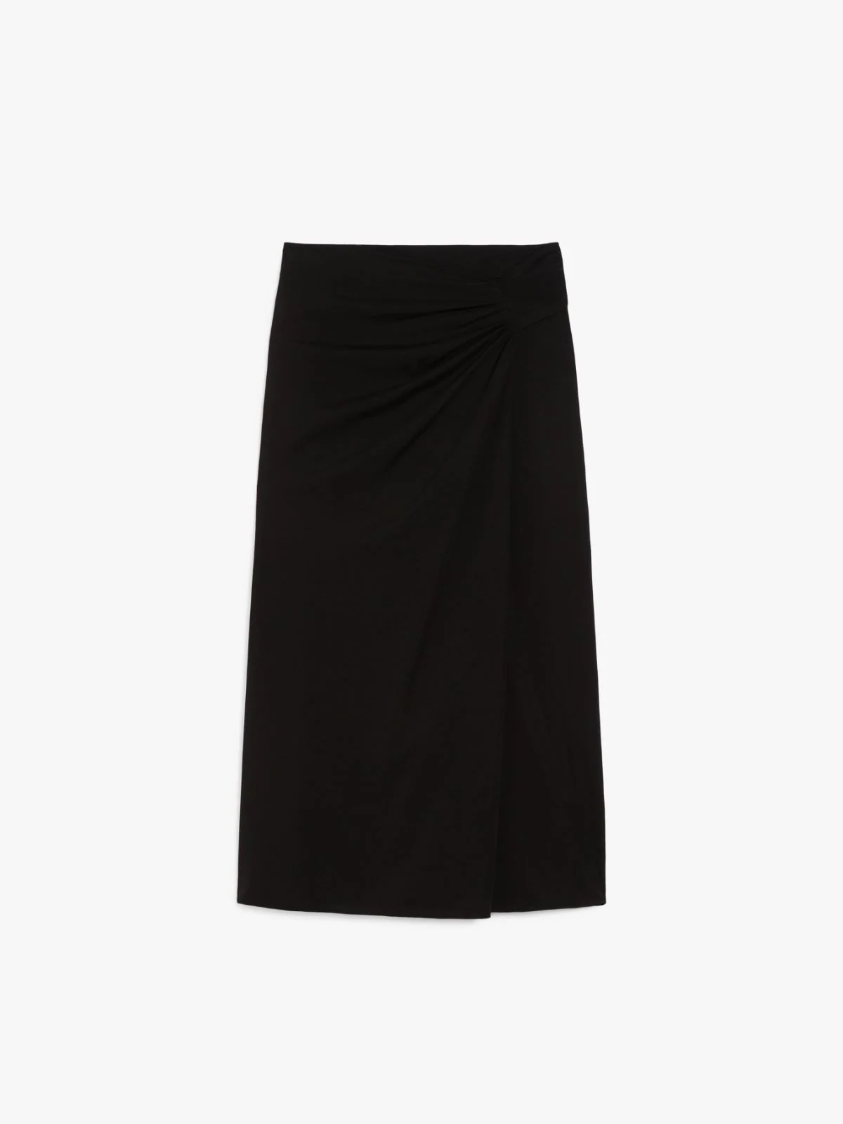 Gonna longuette dalla linea dritta, realizzata in morbido jersey stretch. Modello sfoderato, caratterizzato da motivo drappeggiato asimmetrico sul fianco sinistro, che dona movimento al capo, e vita elasticizzata sul retro.